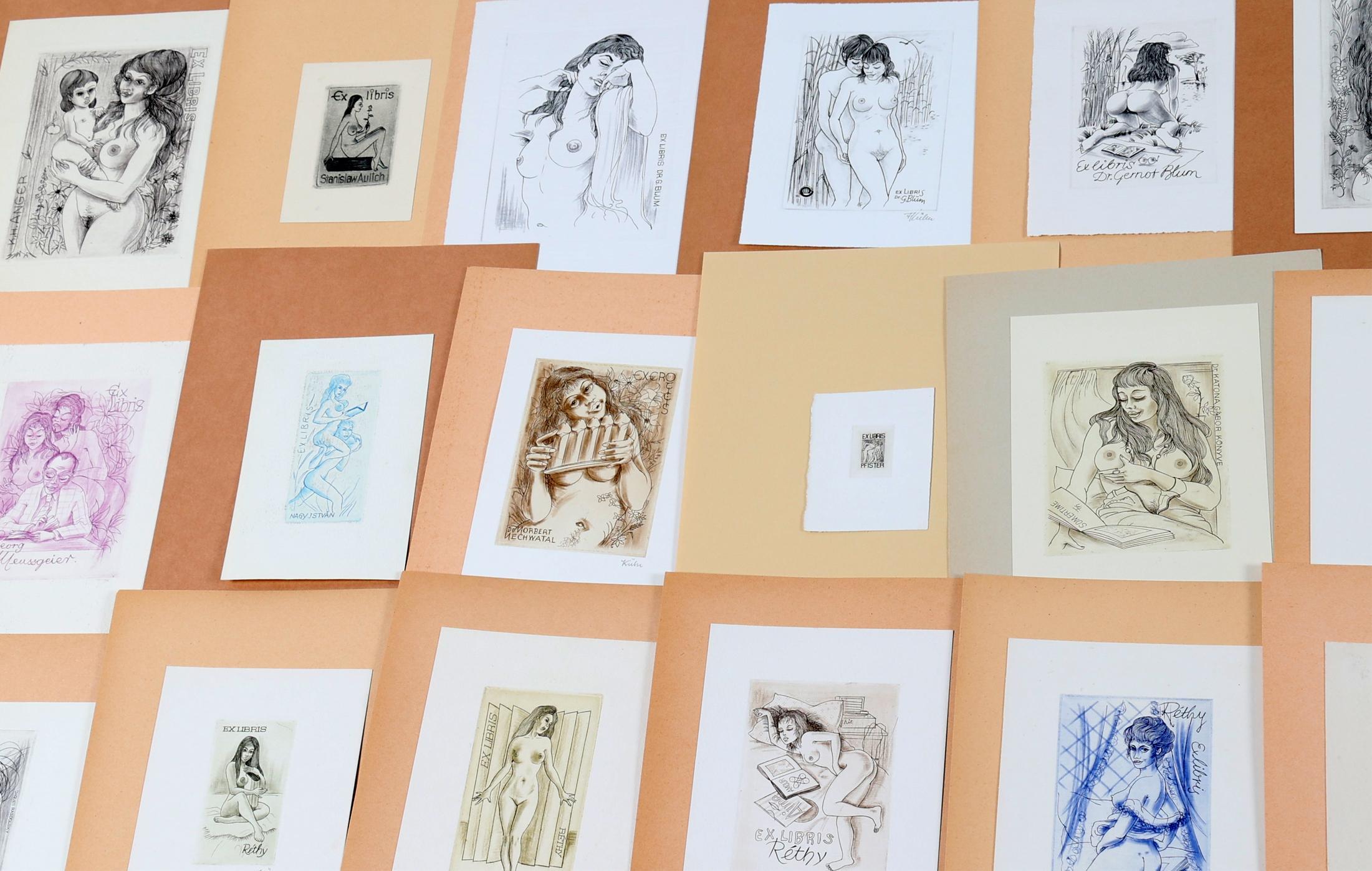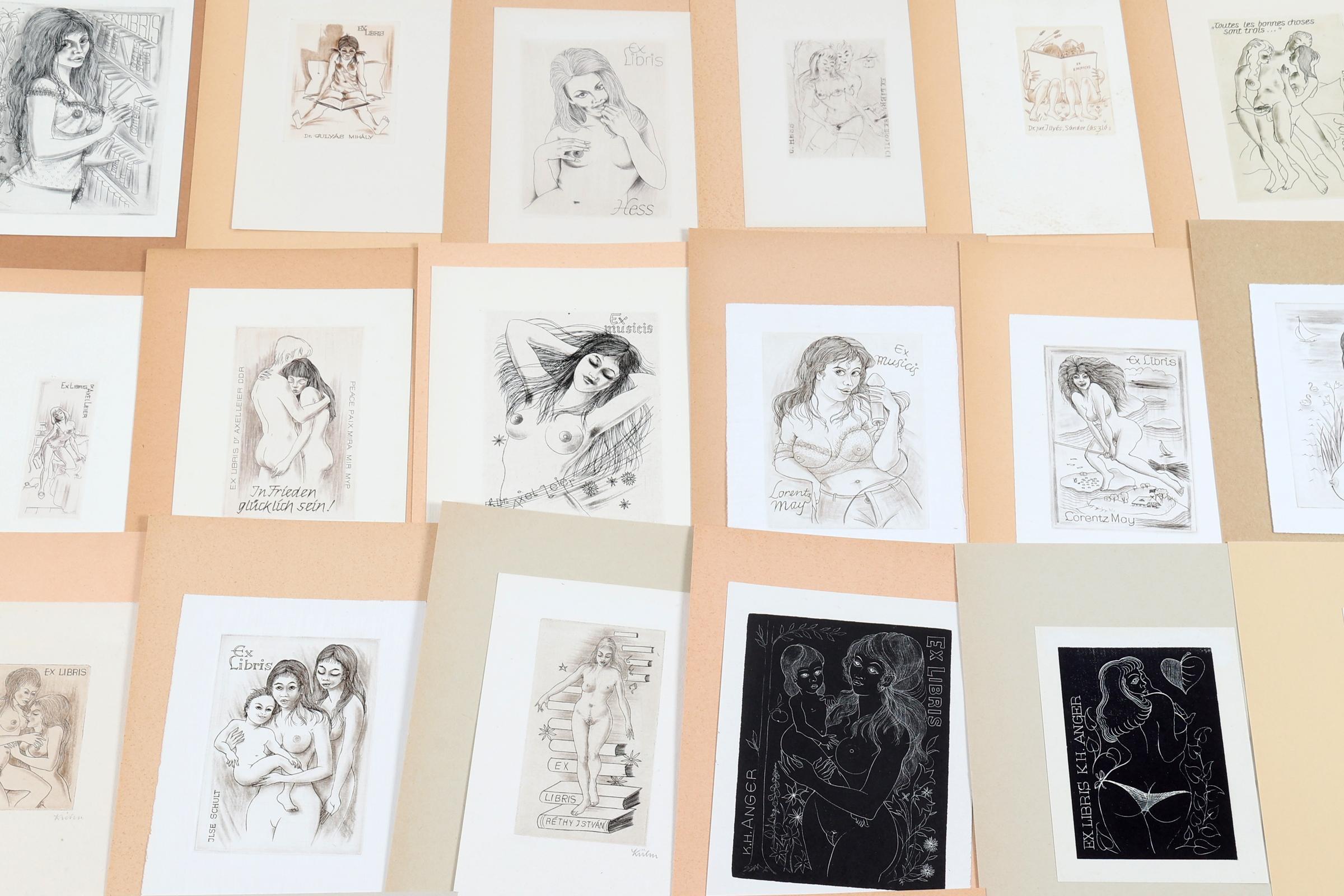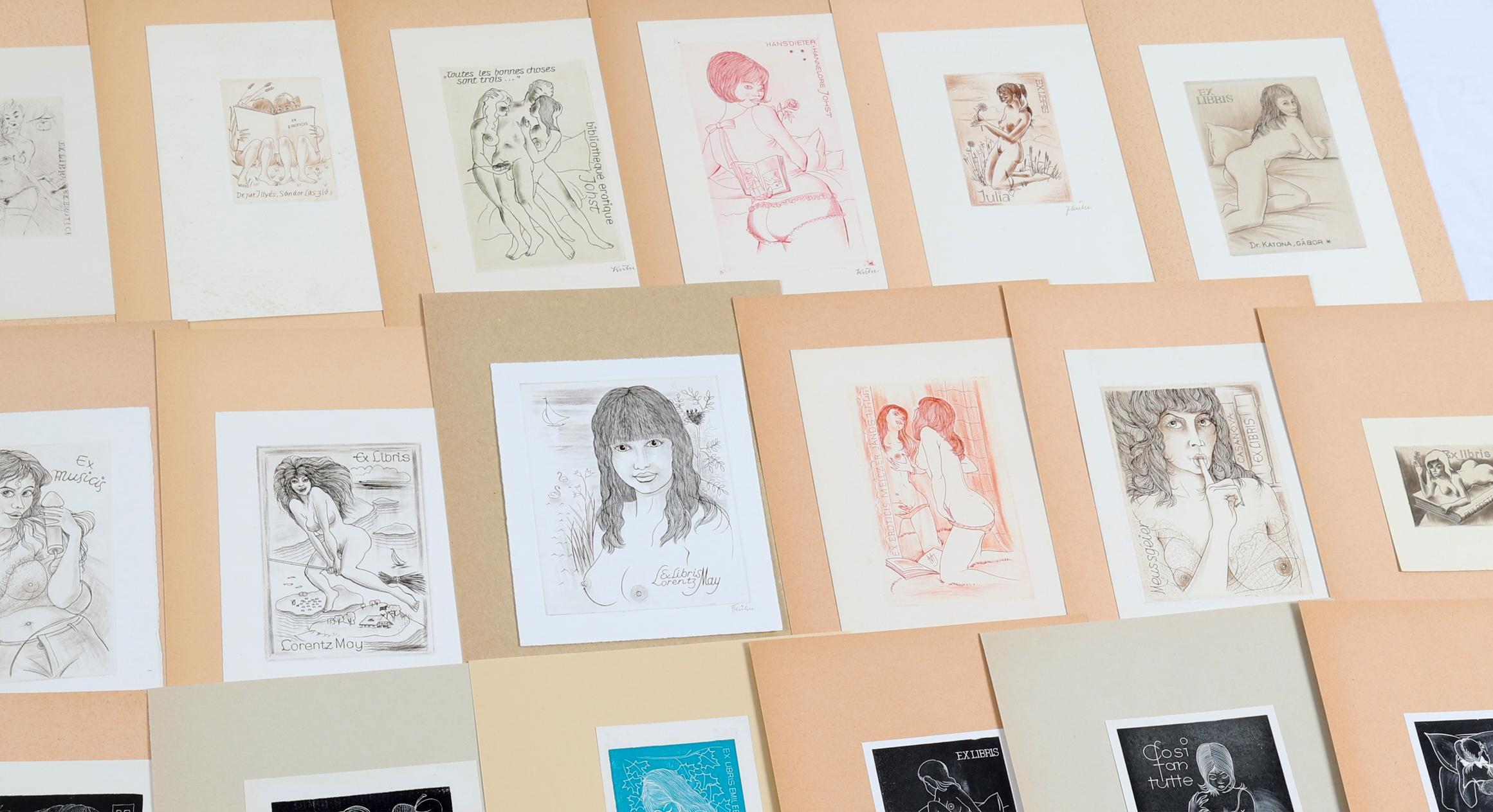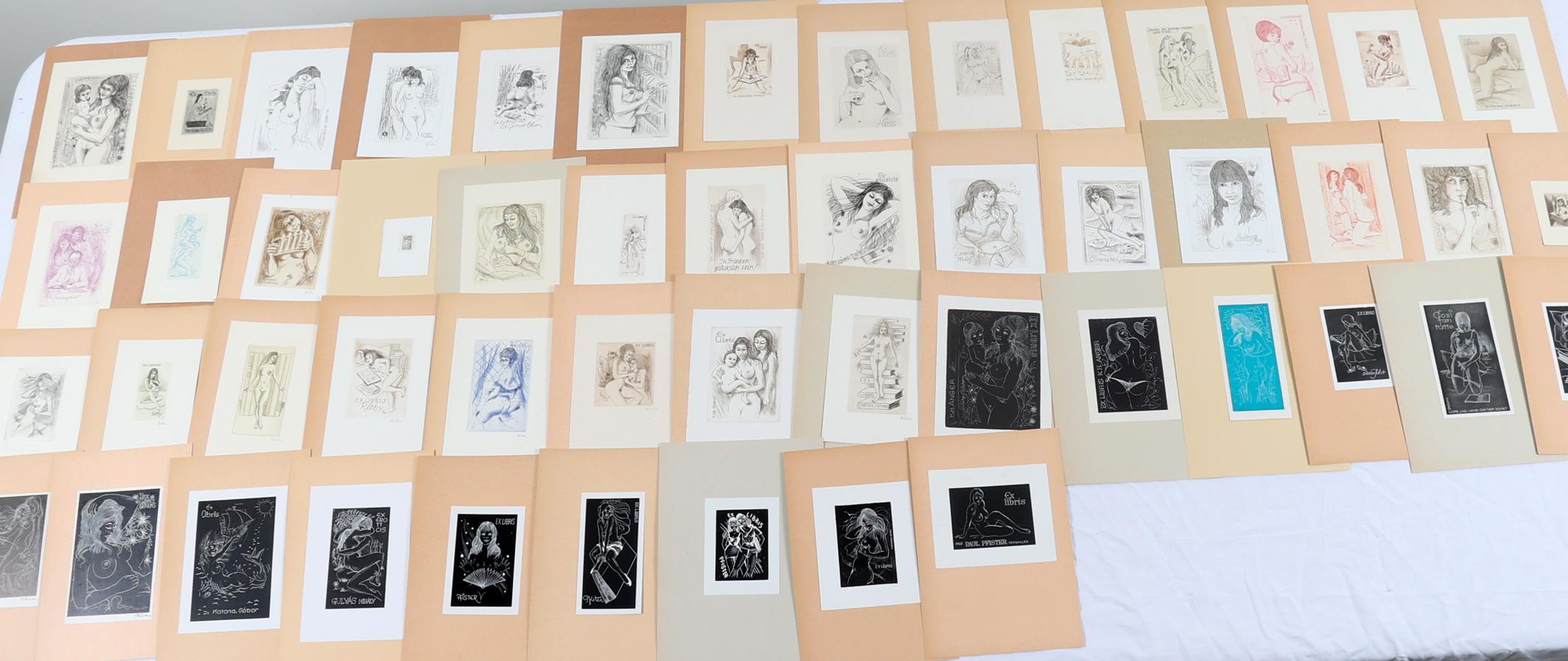Kuehn, Fr., plm. 50 exlibris(36 x diepdruk, 15 x hoogdruk), thema: erotiek / naakt. Plm. 17 x gesigneerd. Opgeplakt.