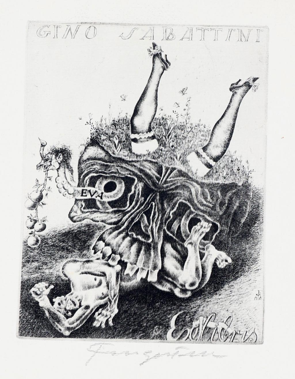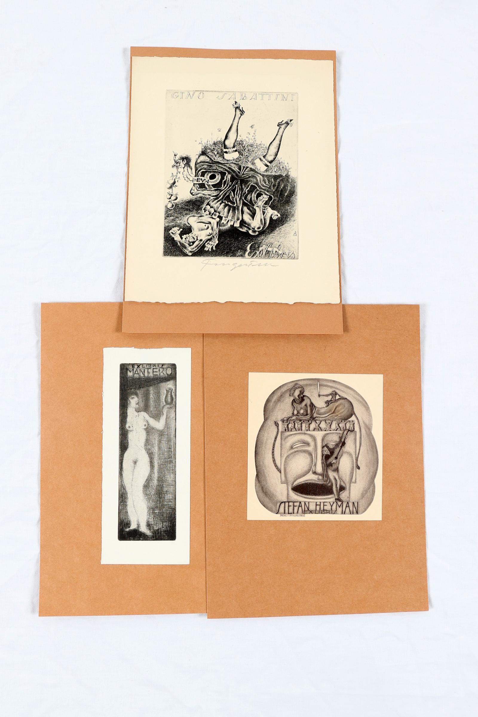 Fingesten, M., 3 exlibris, C3, (Gino Sabattini, Eva, gesigneerd; Mantero, naakt met kruik, niet gesigneerd - nieuwe druk?; Stefan Heyman, litho, niet gesigneerd)