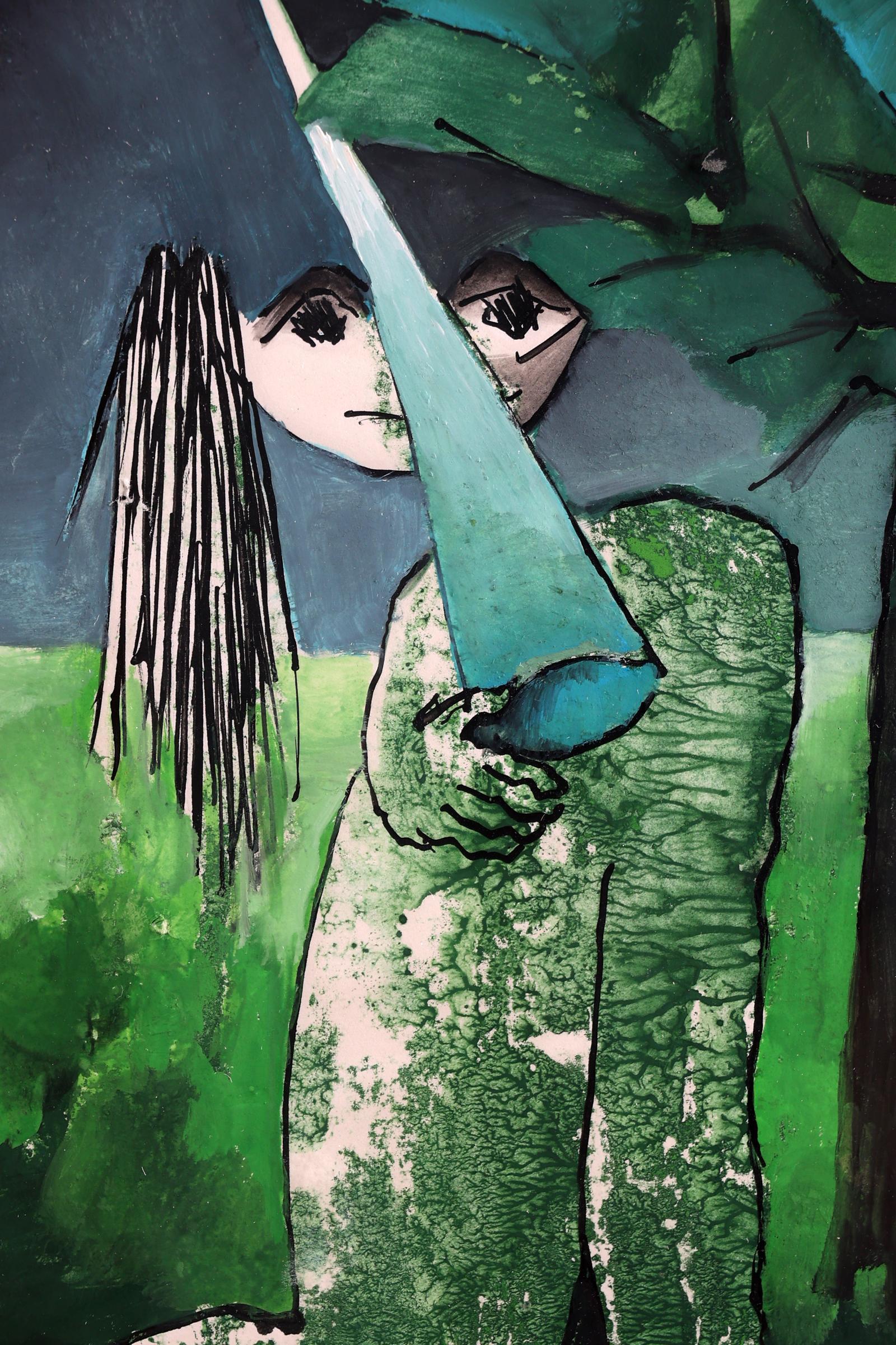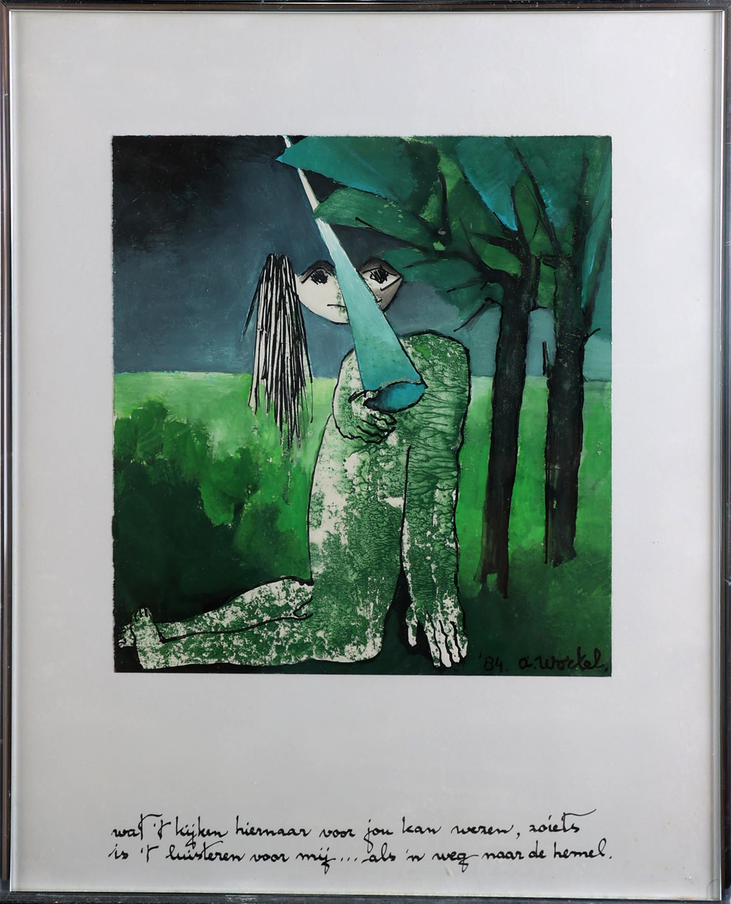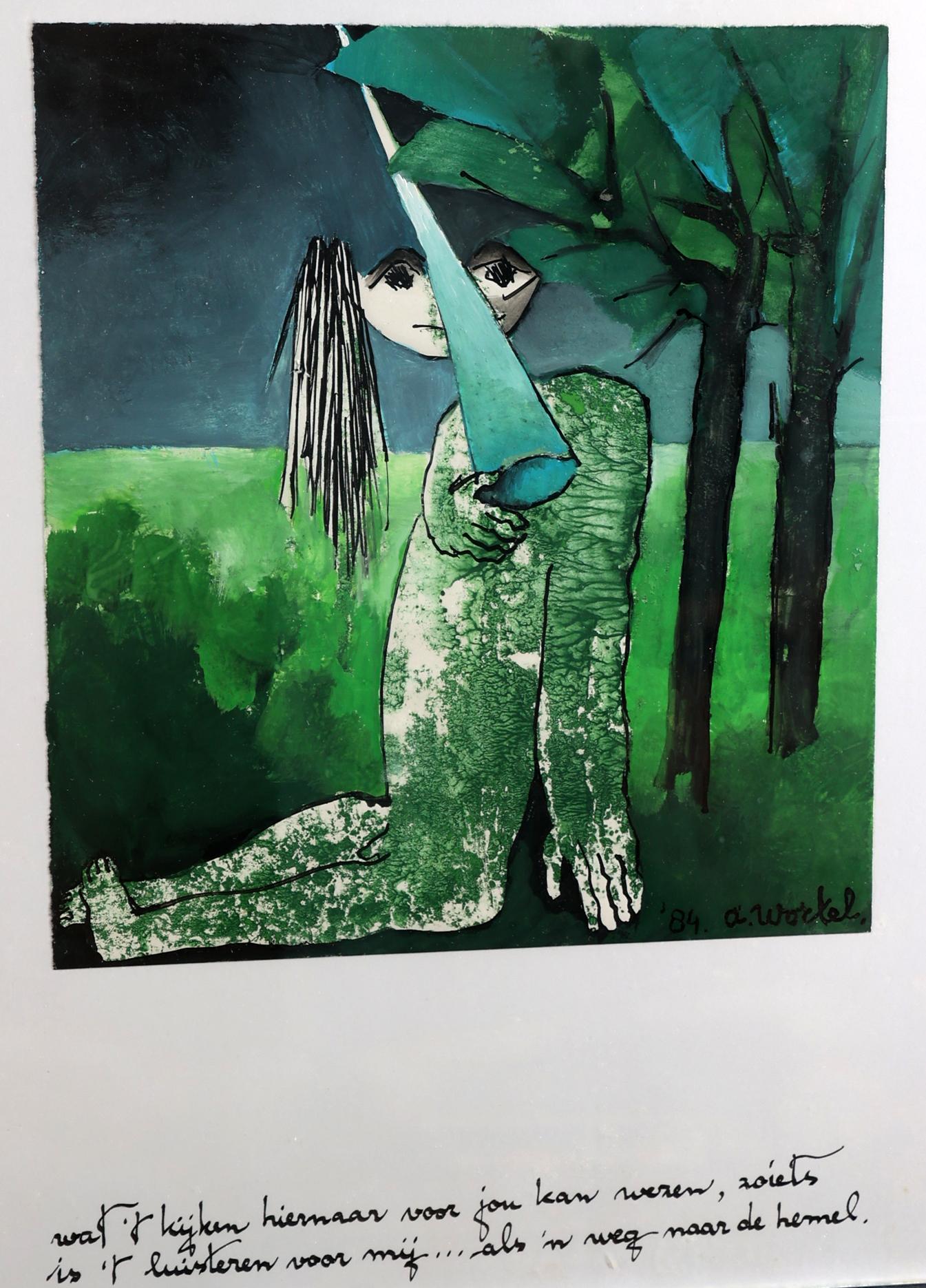 Ans Wortel (1929), "Wat het kijken hier naar voor jou kan wezen, zoiets is het luisteren voor mij ... als 'm weg naar de hemel", gemengde techniek op papier, 28 x 30,5 cm., gesigneerd en gedateerd 4/1984
