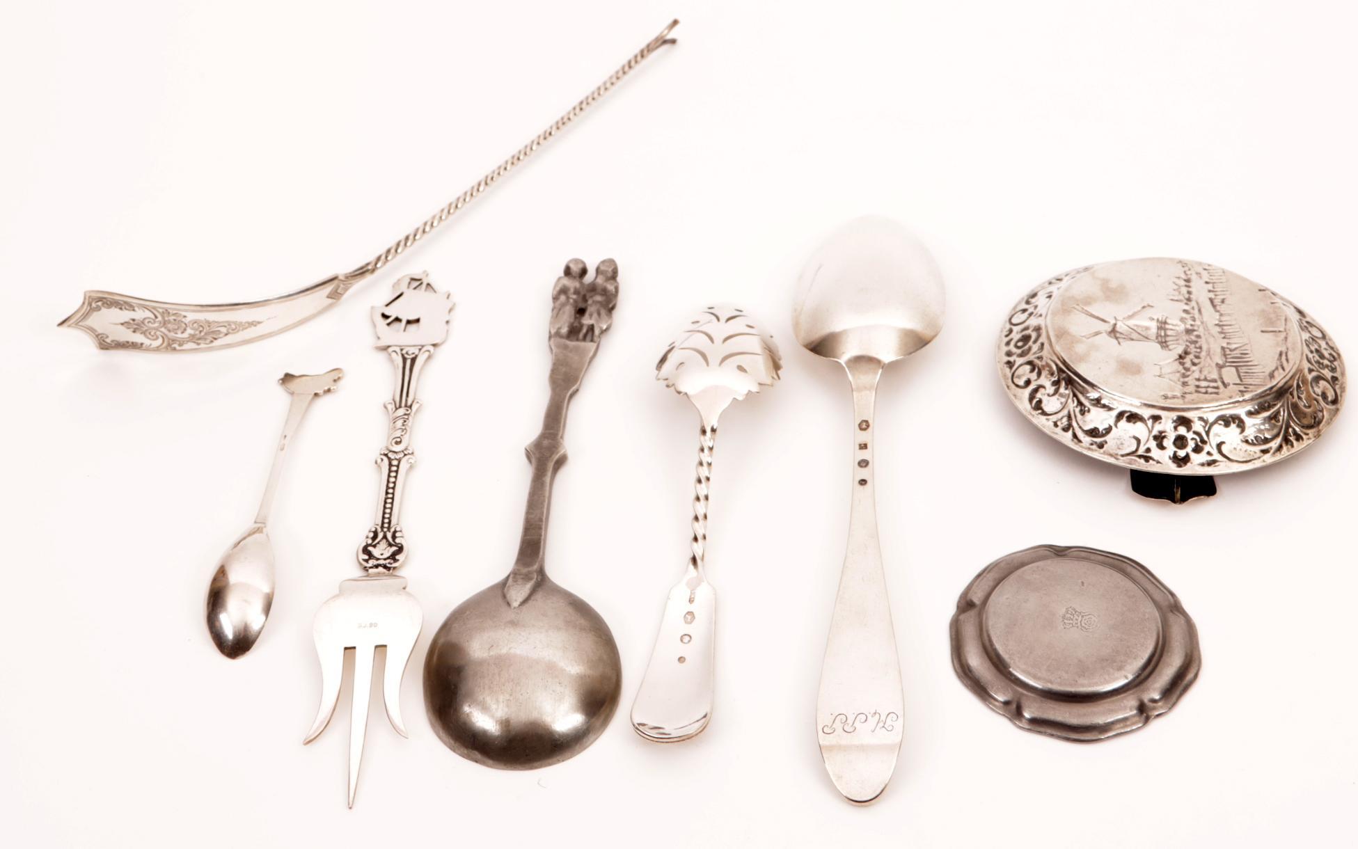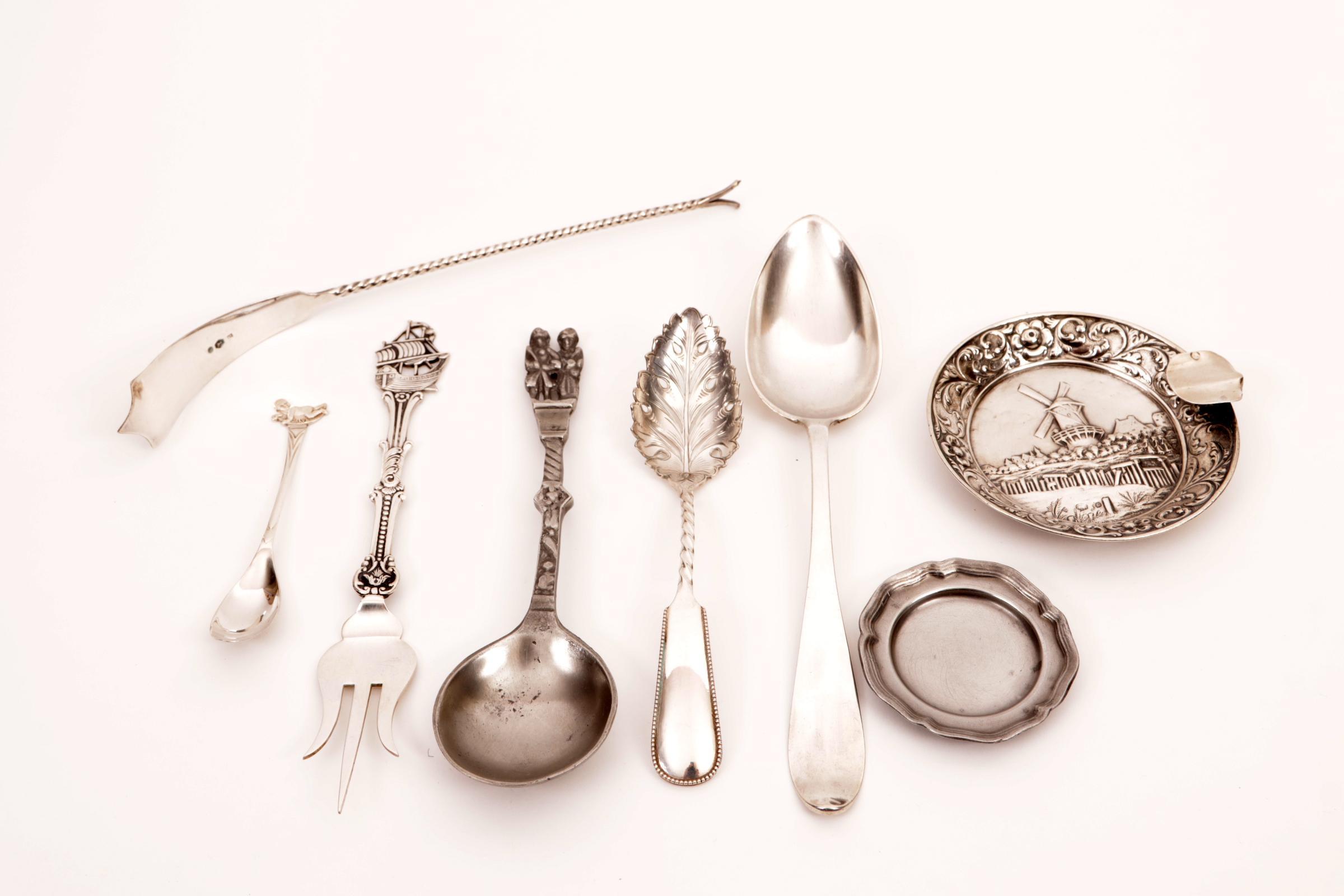 Koop van : 2e gehalte zilveren asbak, tinnen lepel, schoteltje, divers klein zilver, etc., totaal zilver 182 gram