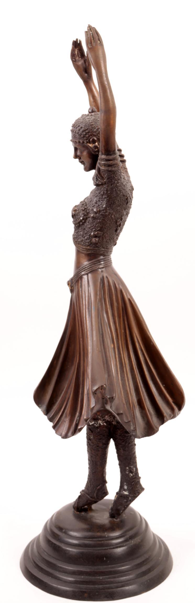 Bronzen sculptuur van danseres rustend op marmeren voetstuk, h.60 cm.