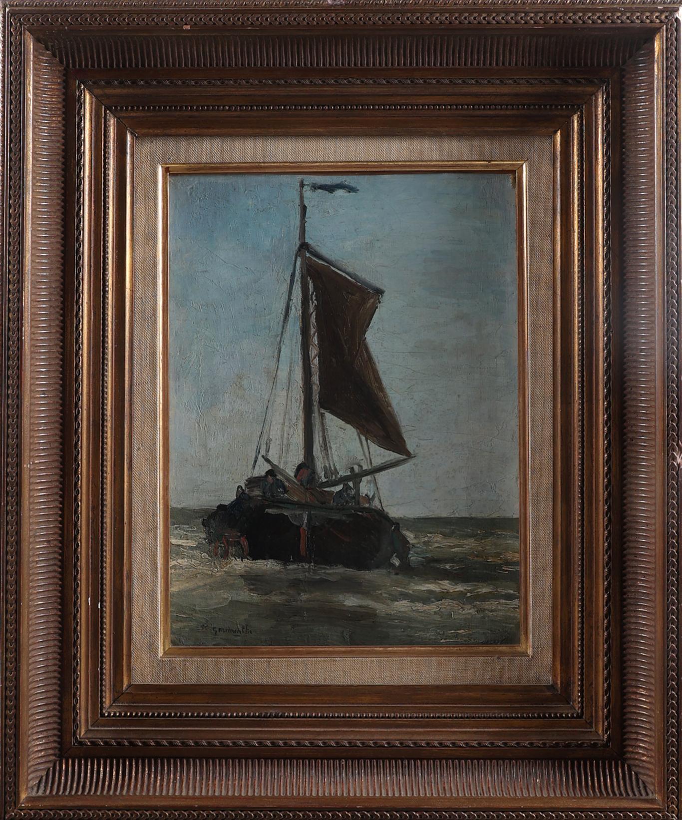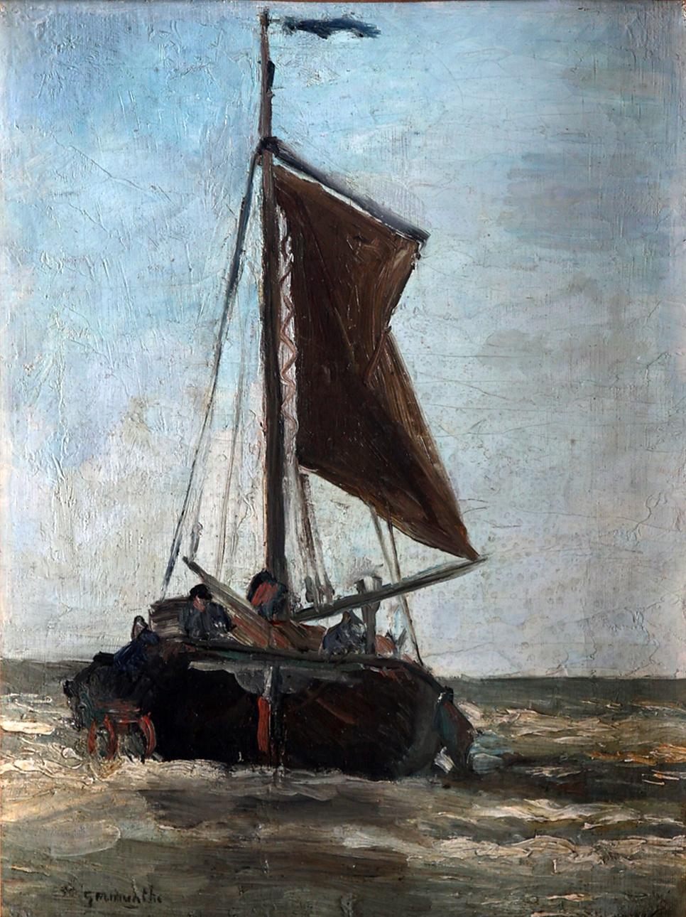 Omgeving Morgenstjerne Munthe, Bommschuit met personen, olieverf op doek, 33,5 x 25 cm.