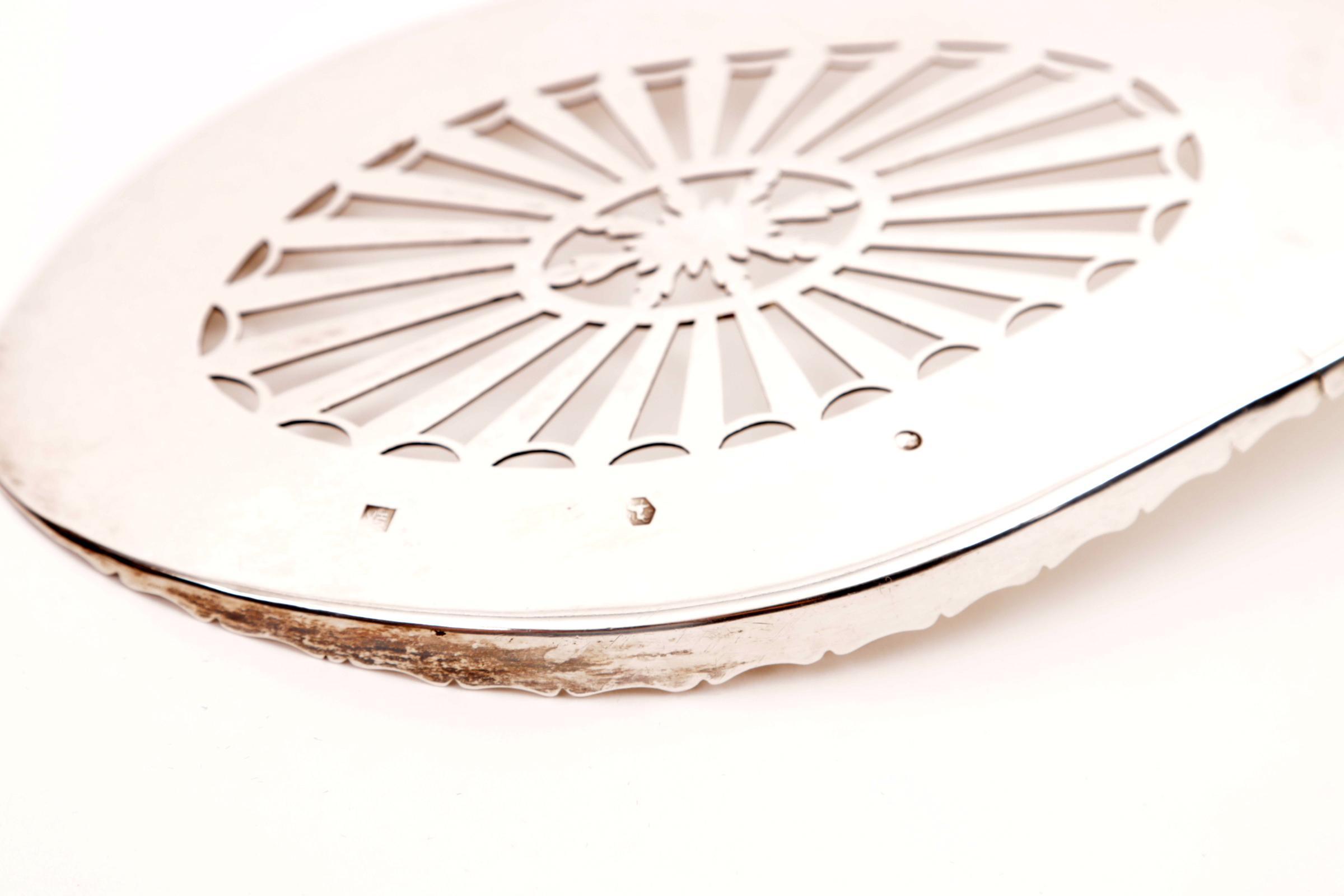 2e Gehalte zilveren visopdienschep met houten handvat