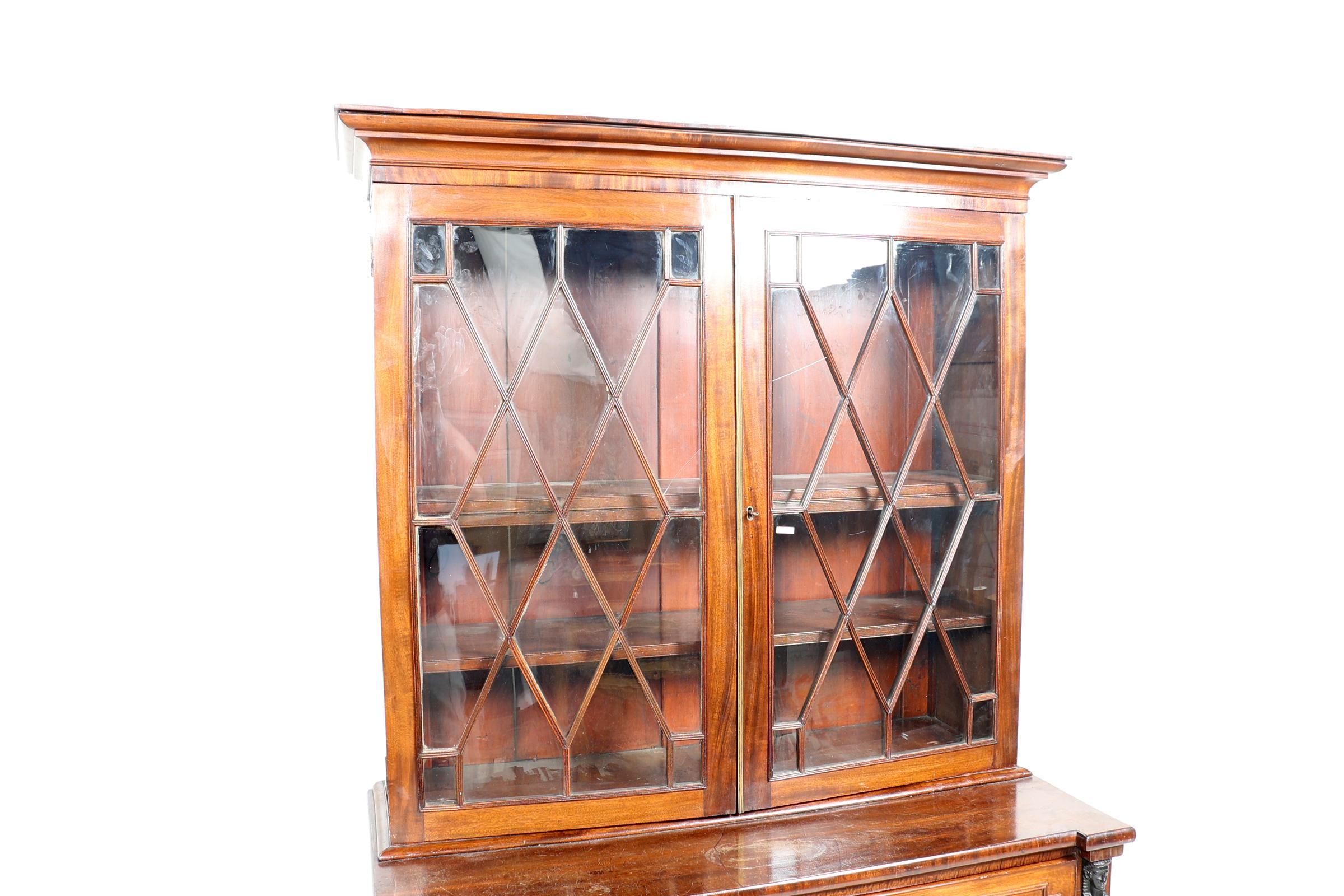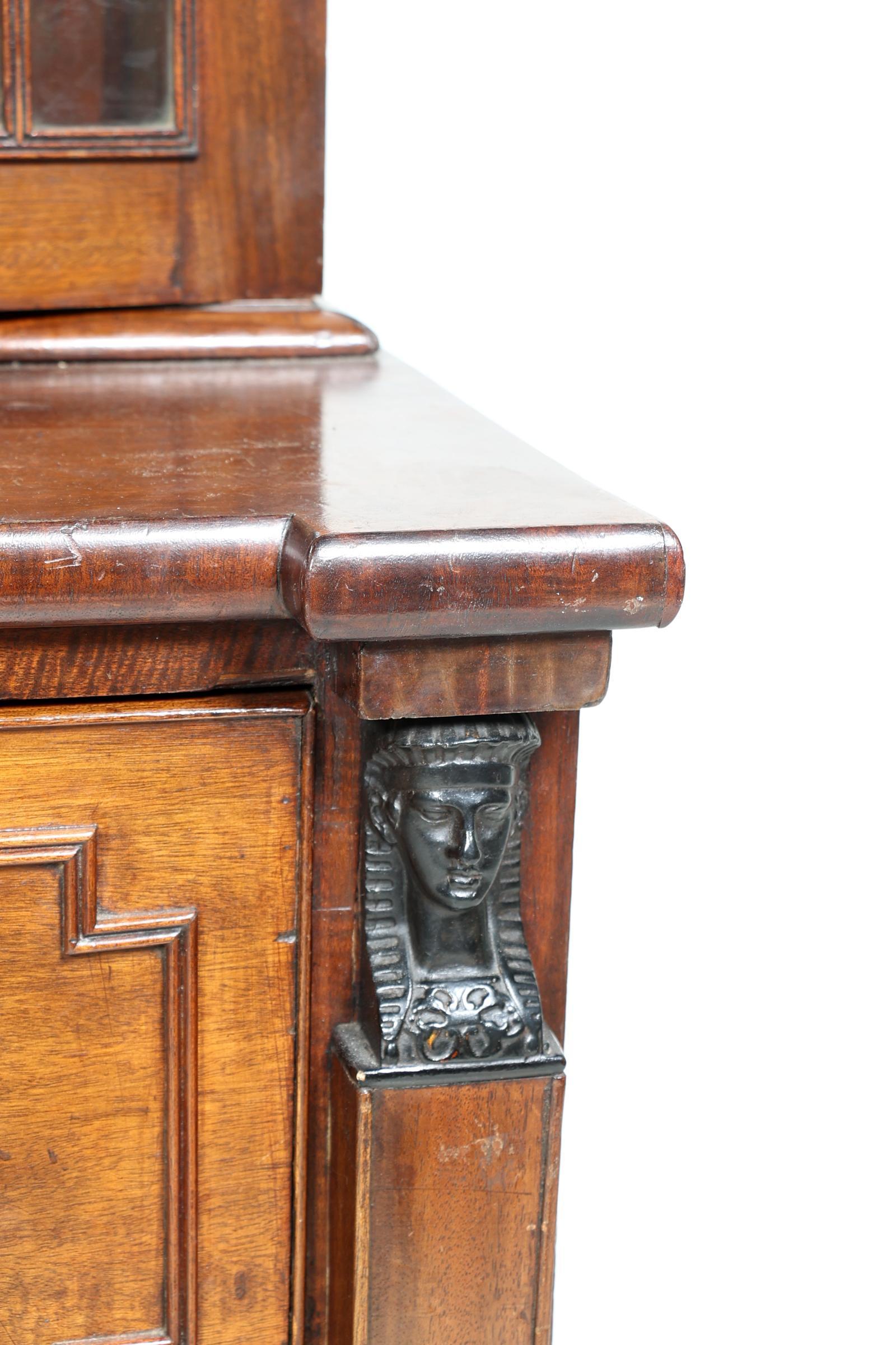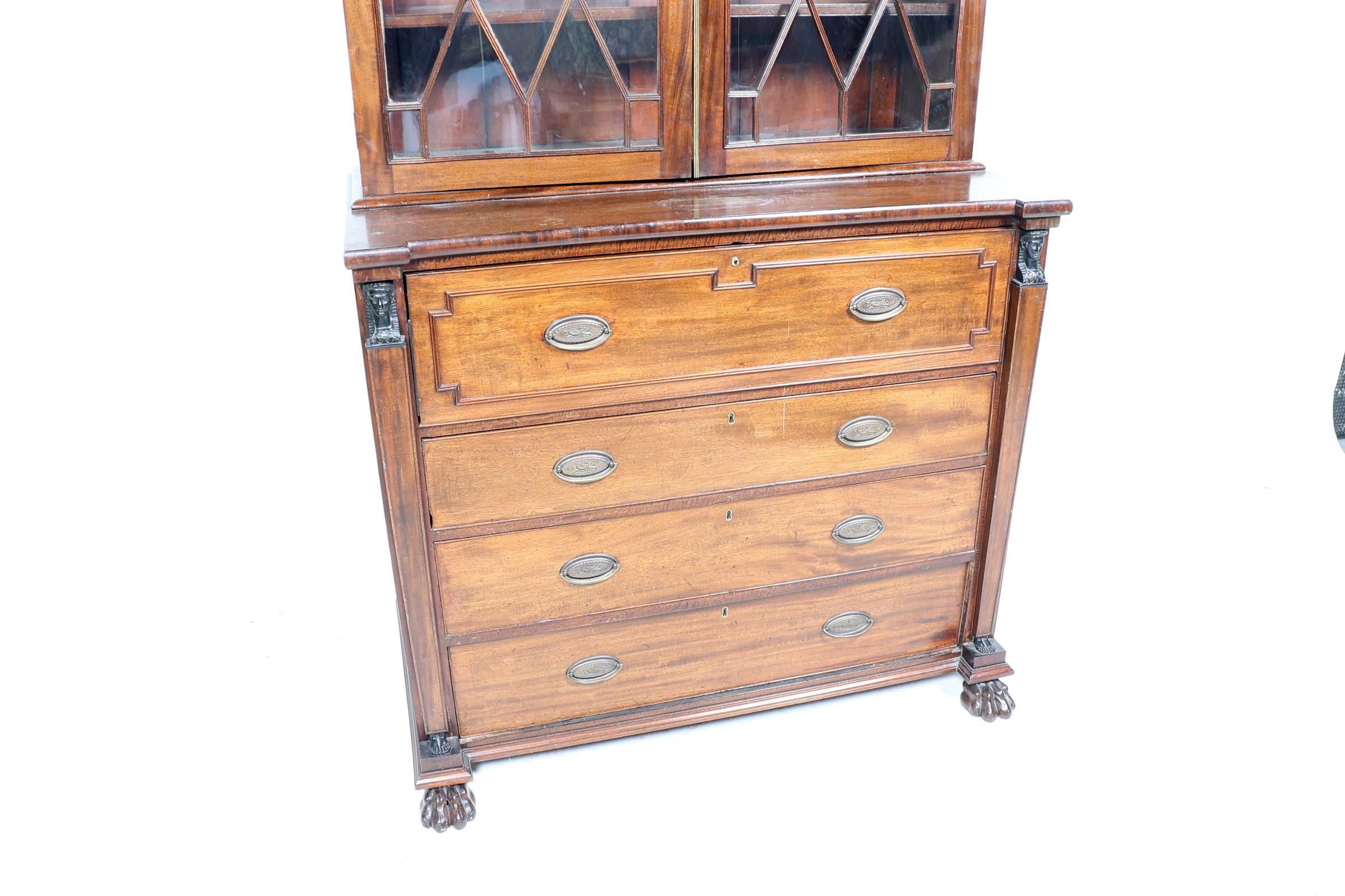 Antieke mahoniehouten Empire commode met boekopstand met beglaasde deuren en in de onderlade, verborgen secretaire gedeelte rustend op klauwpoten (defecten aan glas), h.221 x b.122 x d.68 cm.