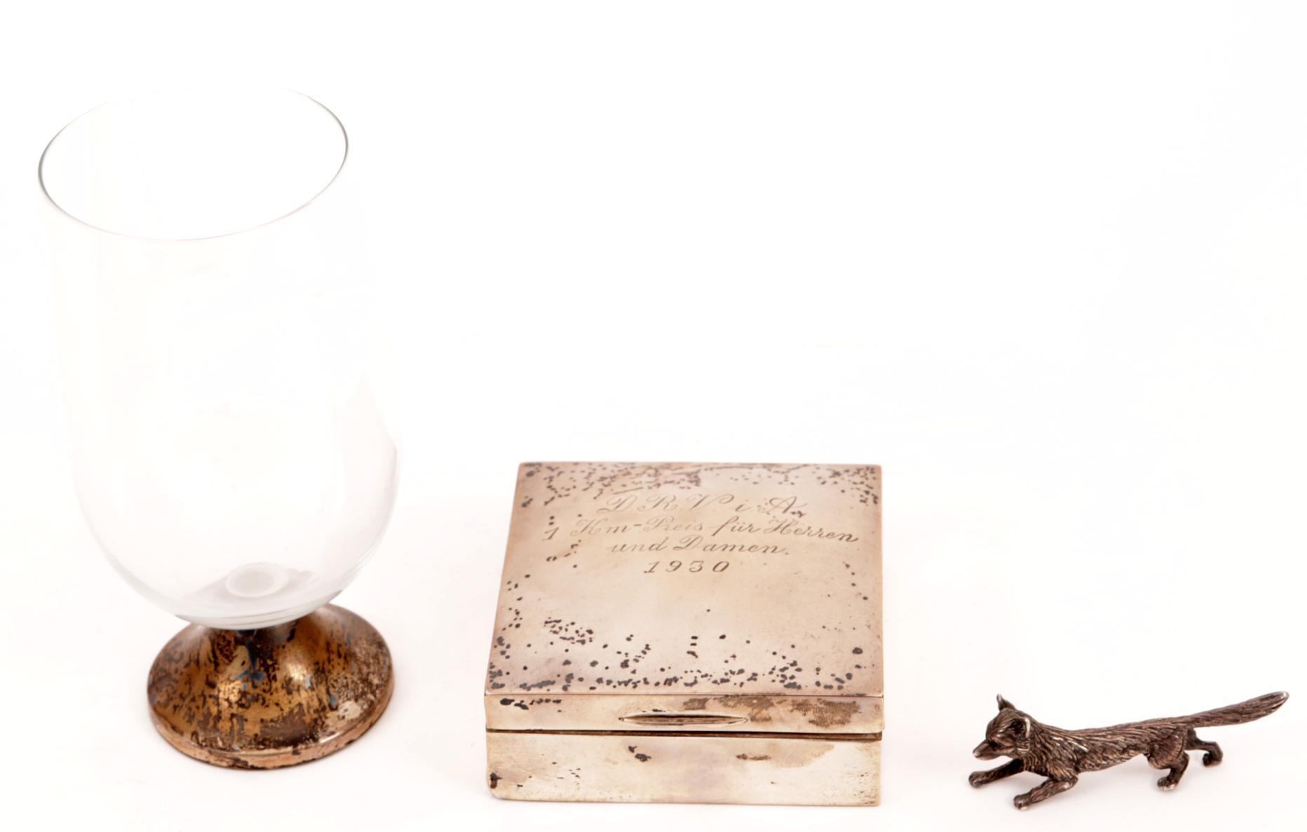 Zilveren dekseldoos, glas met zilveren voetstuk en een zilveren miniatuur vos