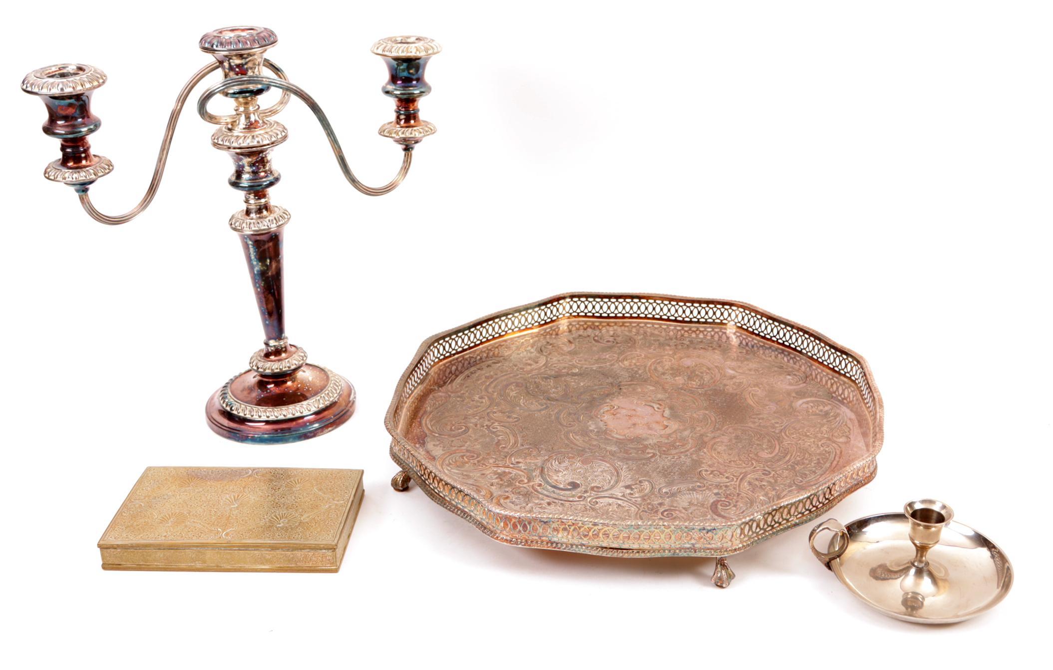 Koop van een pleet dienblad, kandelaar, blakertje en een koperen dekseldoos