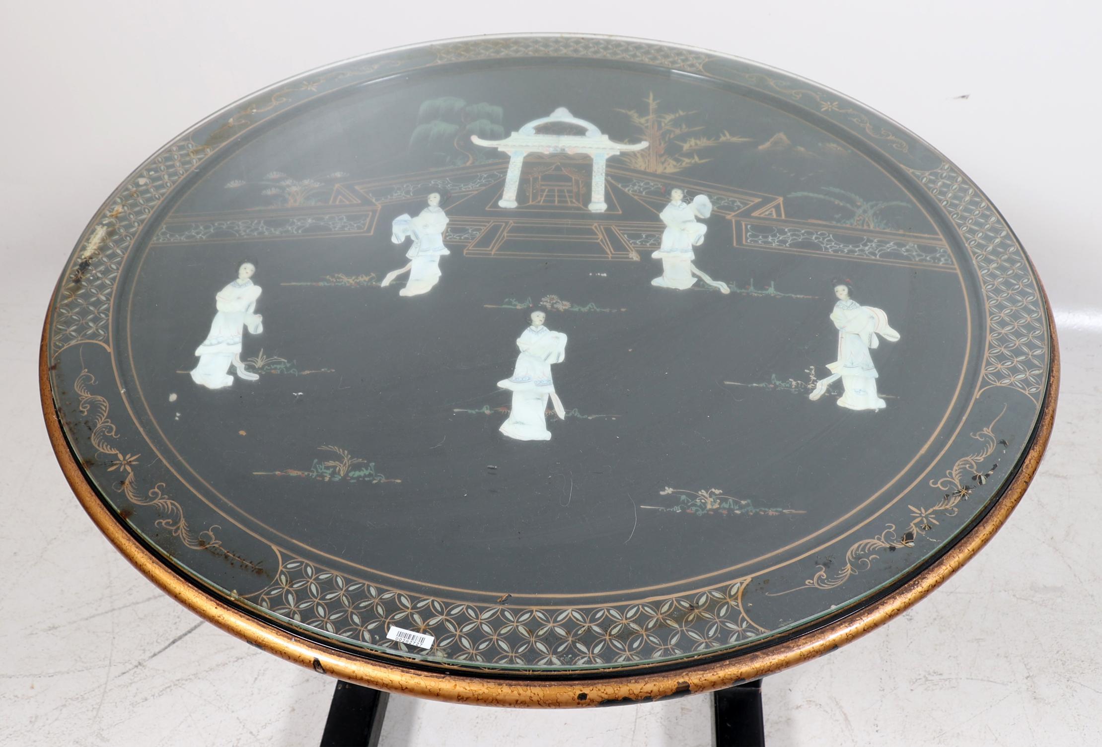 Chinees lakwerk tafel met decor van personen bij een tempel, h.84 x diam.100 cm.