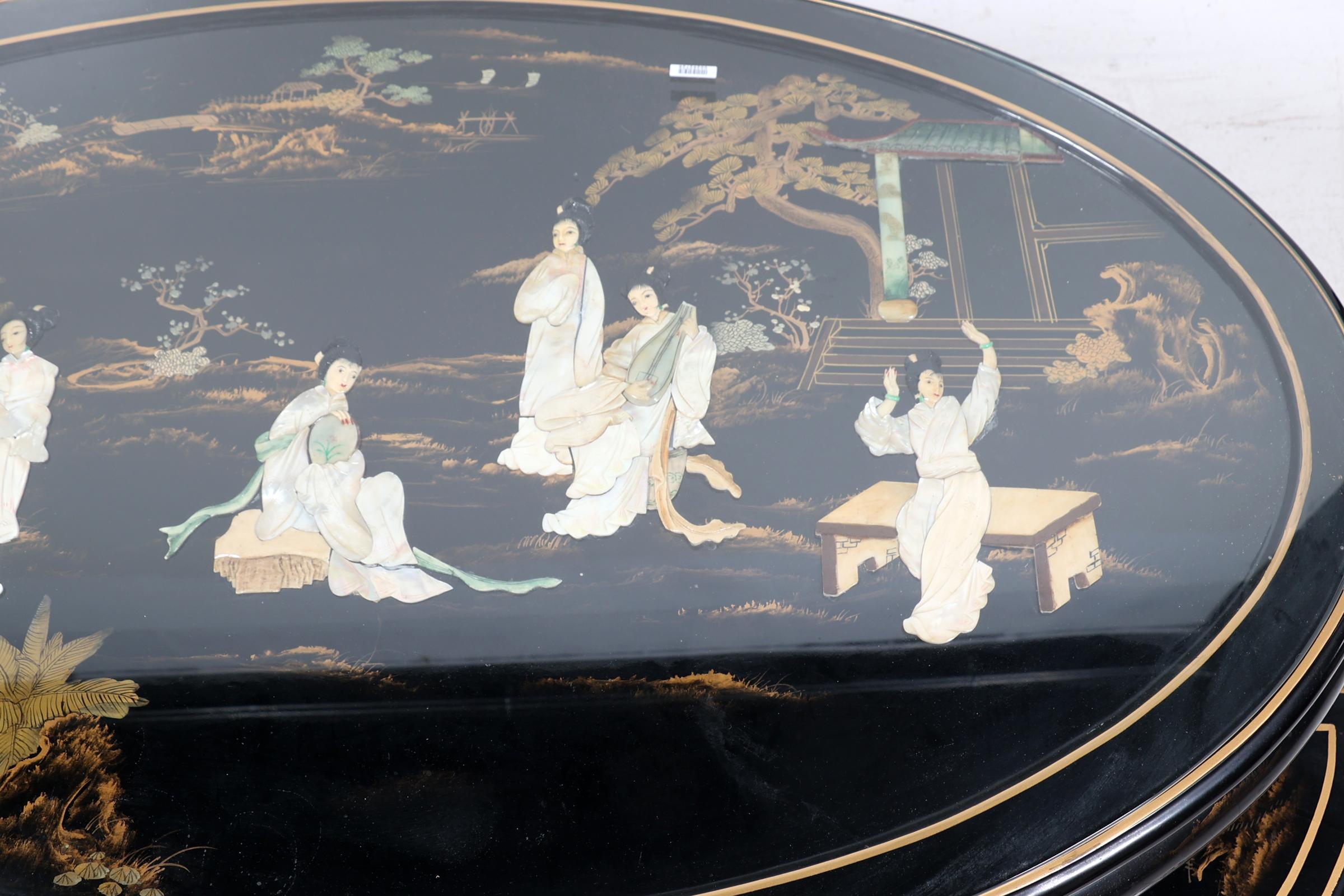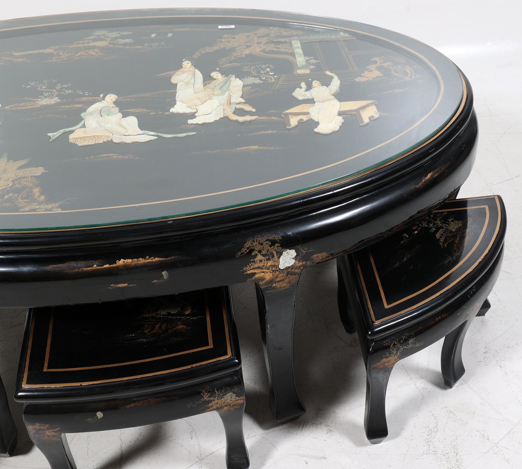 Chinees lakwerk salontafel met 6 krukjes, h.53 x b.120 x d.76 cm.