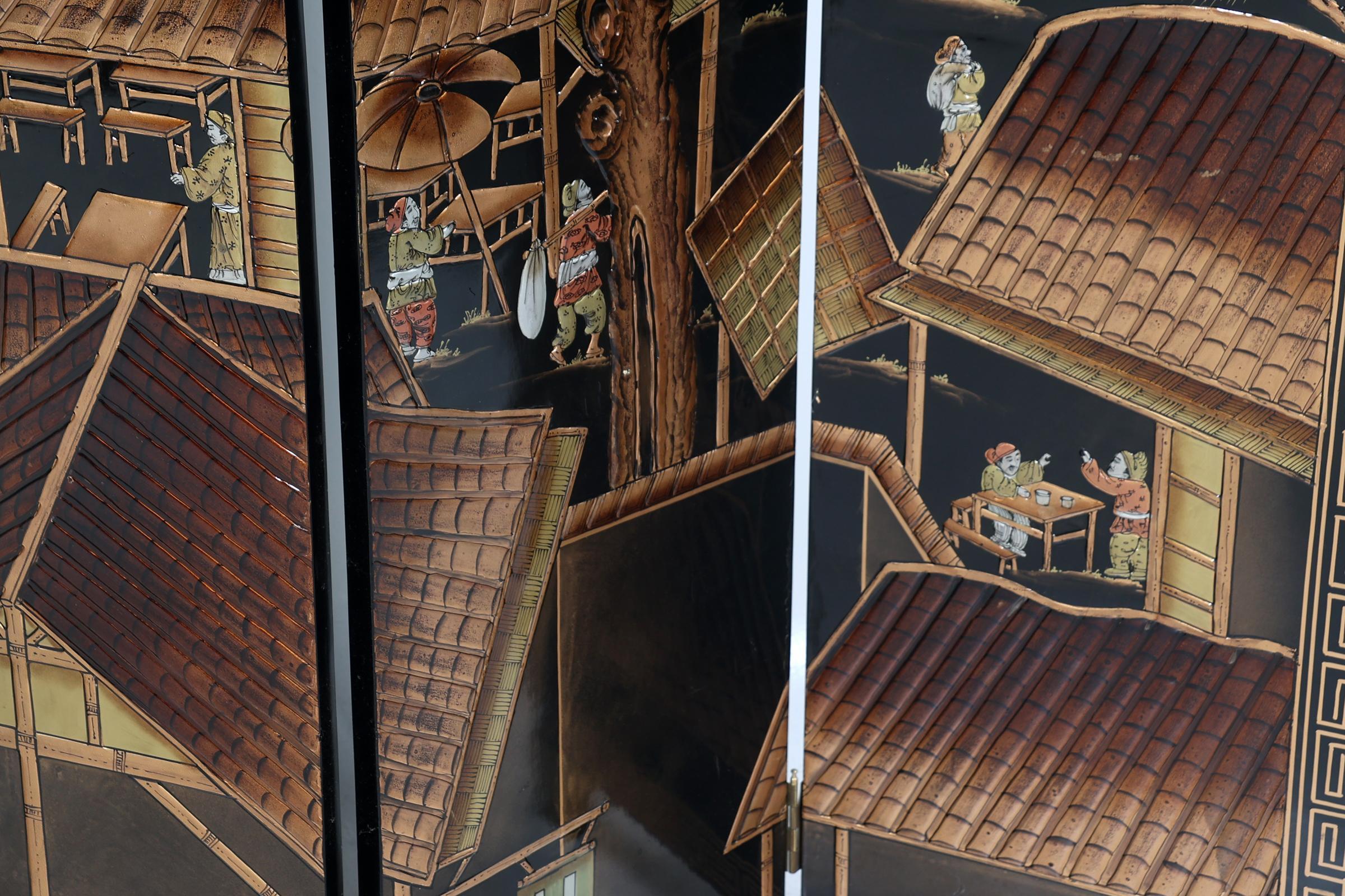 Chinees lakwerk 6-slag kamerscherm met voorstelling van personen in dorpen langs het water, h.213 x b.240 cm.