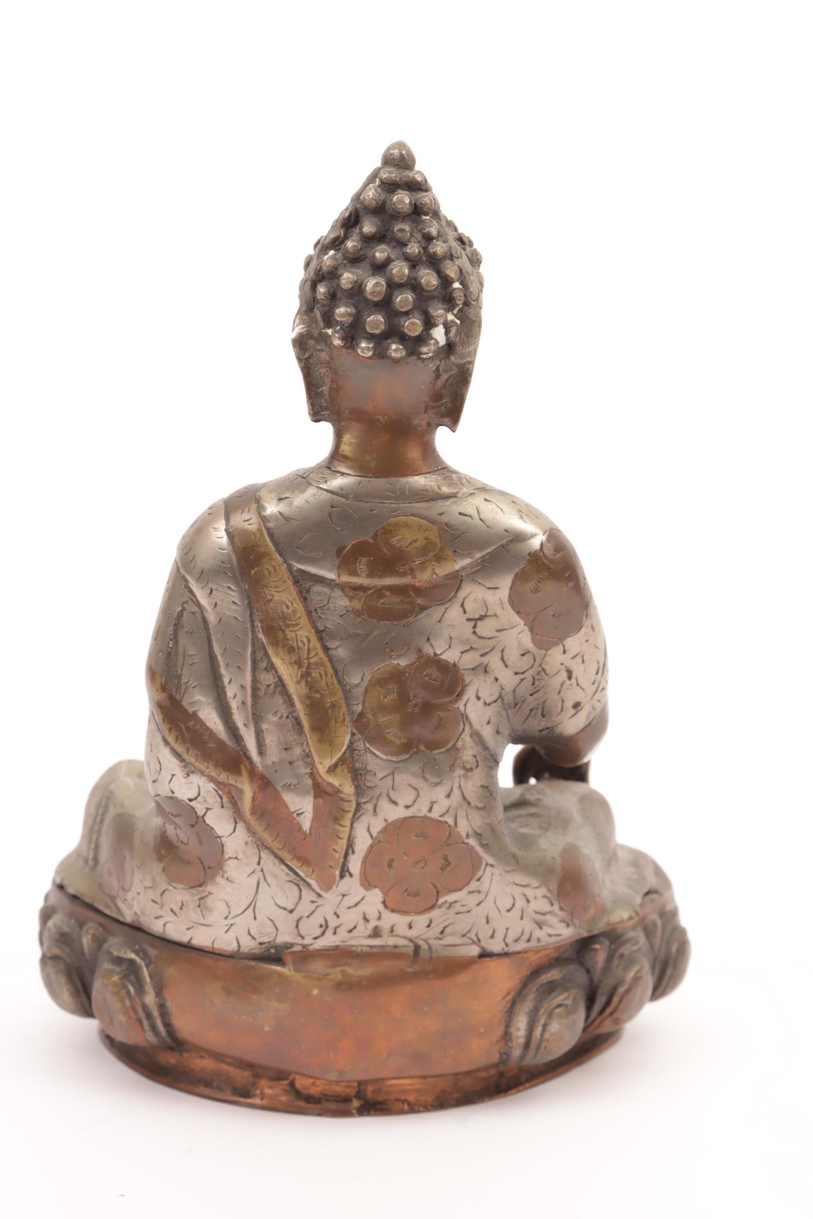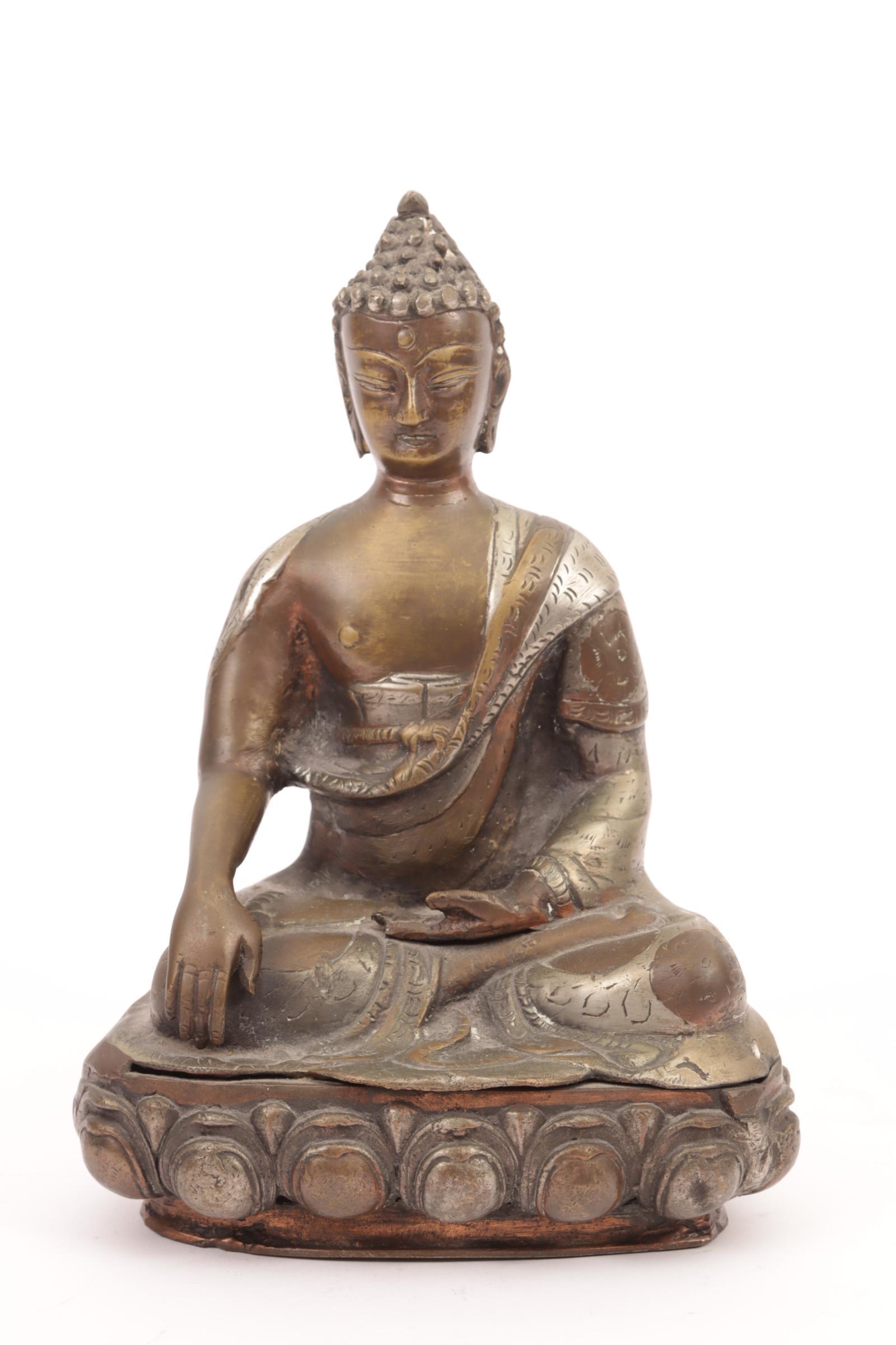 Koperen beeld van een zittende Boeddha, h.25 cm.