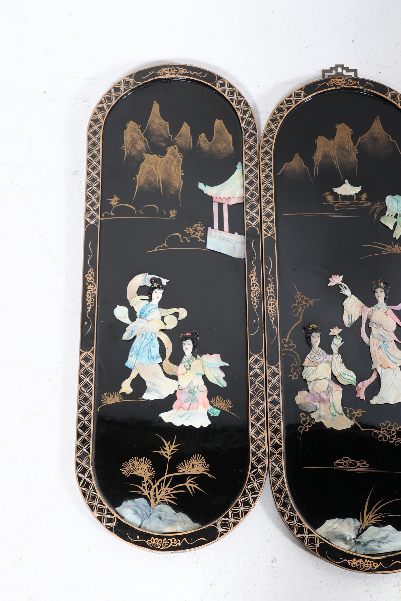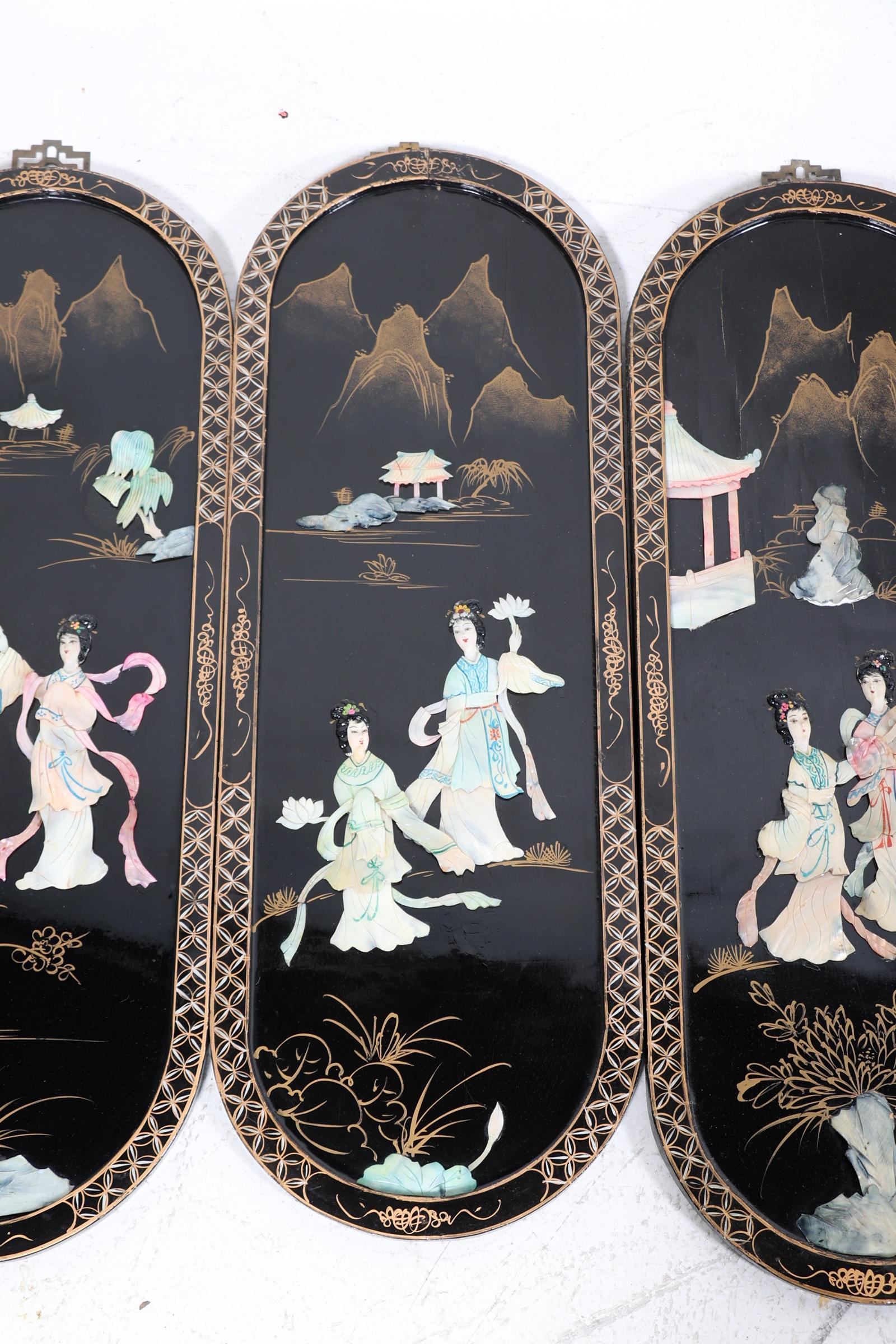 4 diverse lakwerk panel met voorstelling van personen in landschap, 70 x 25 cm. per paneel