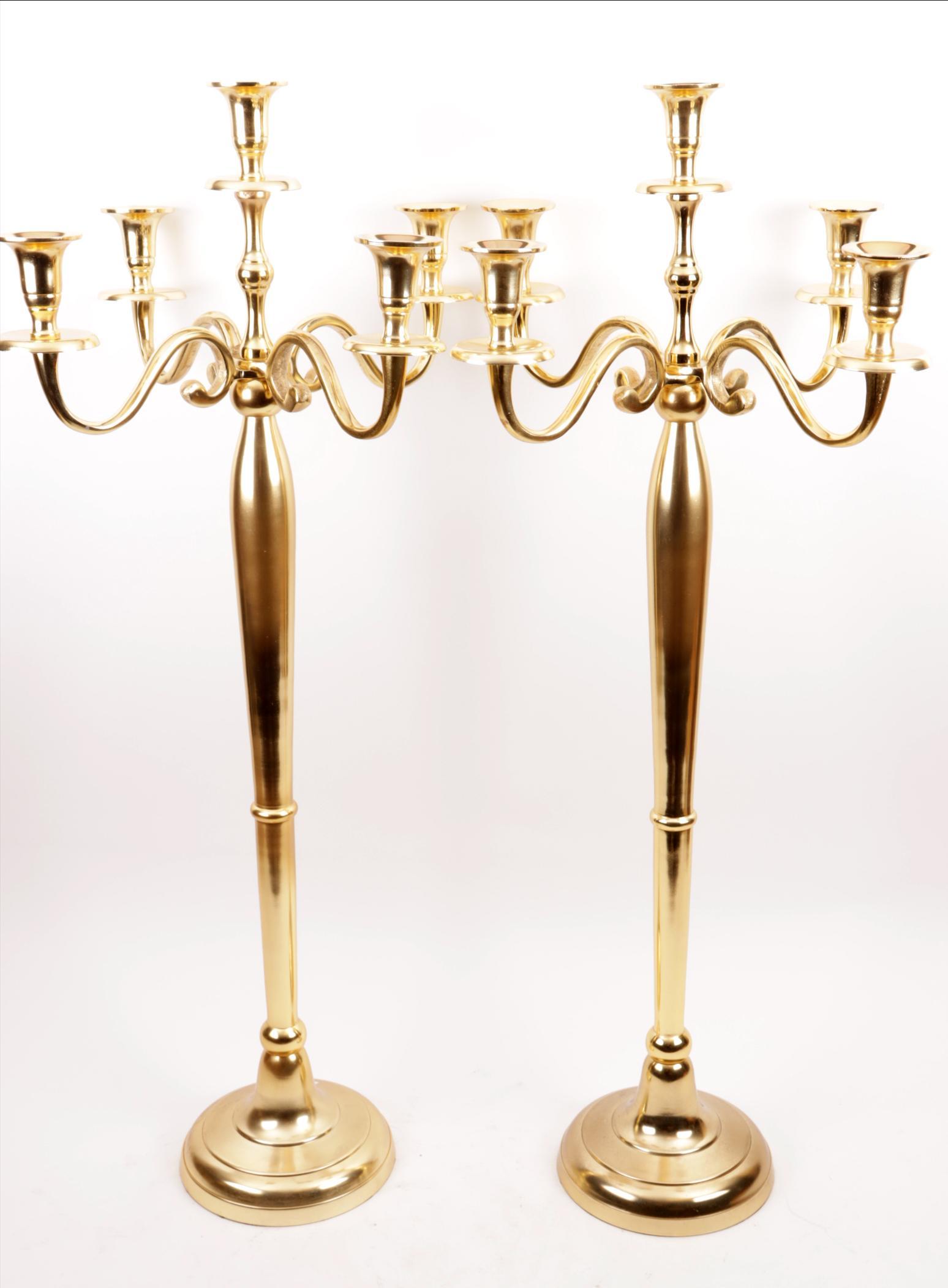 Stel goudkleurige metalen 5-lichts kandelaars, h.80 cm.