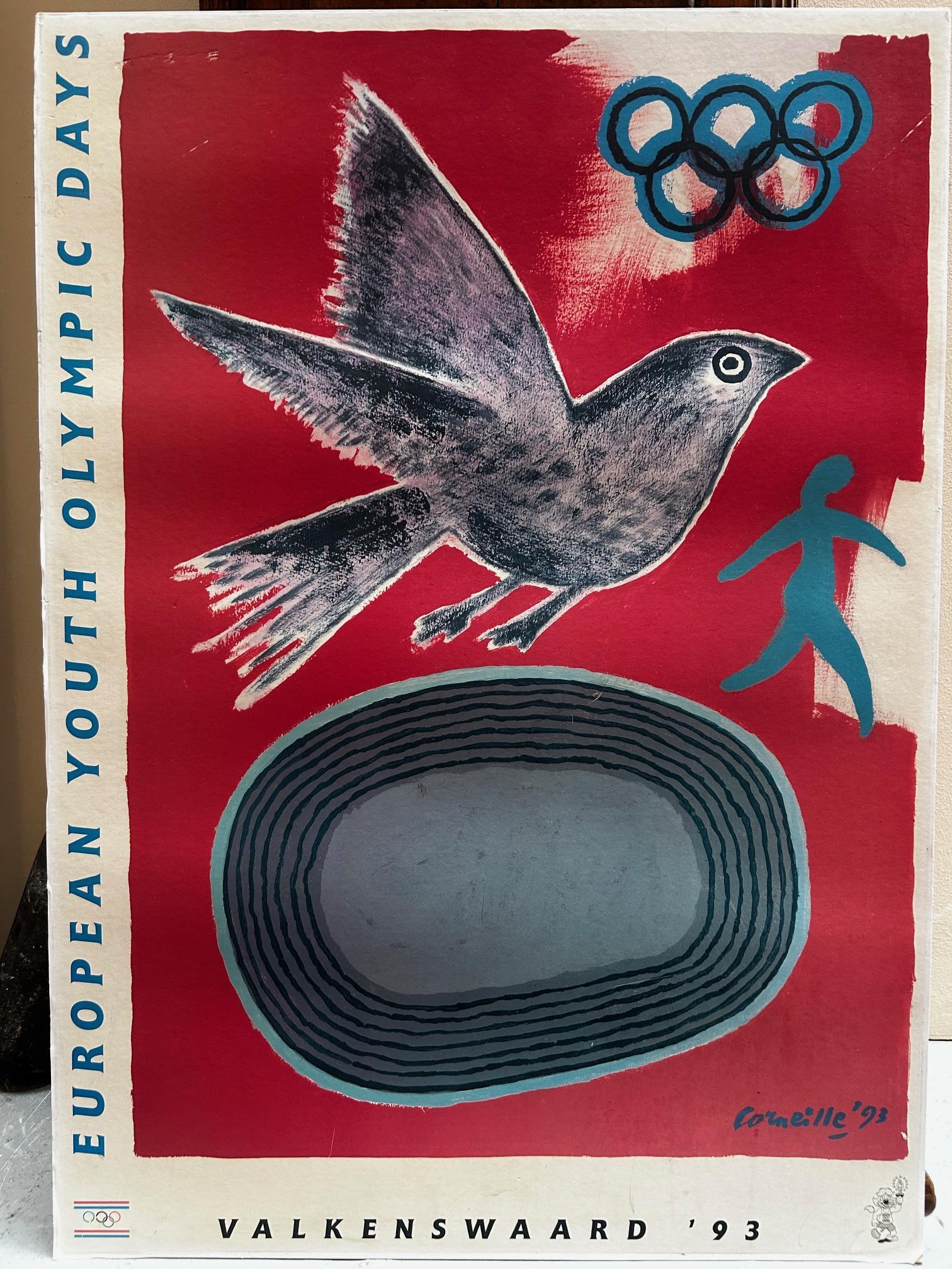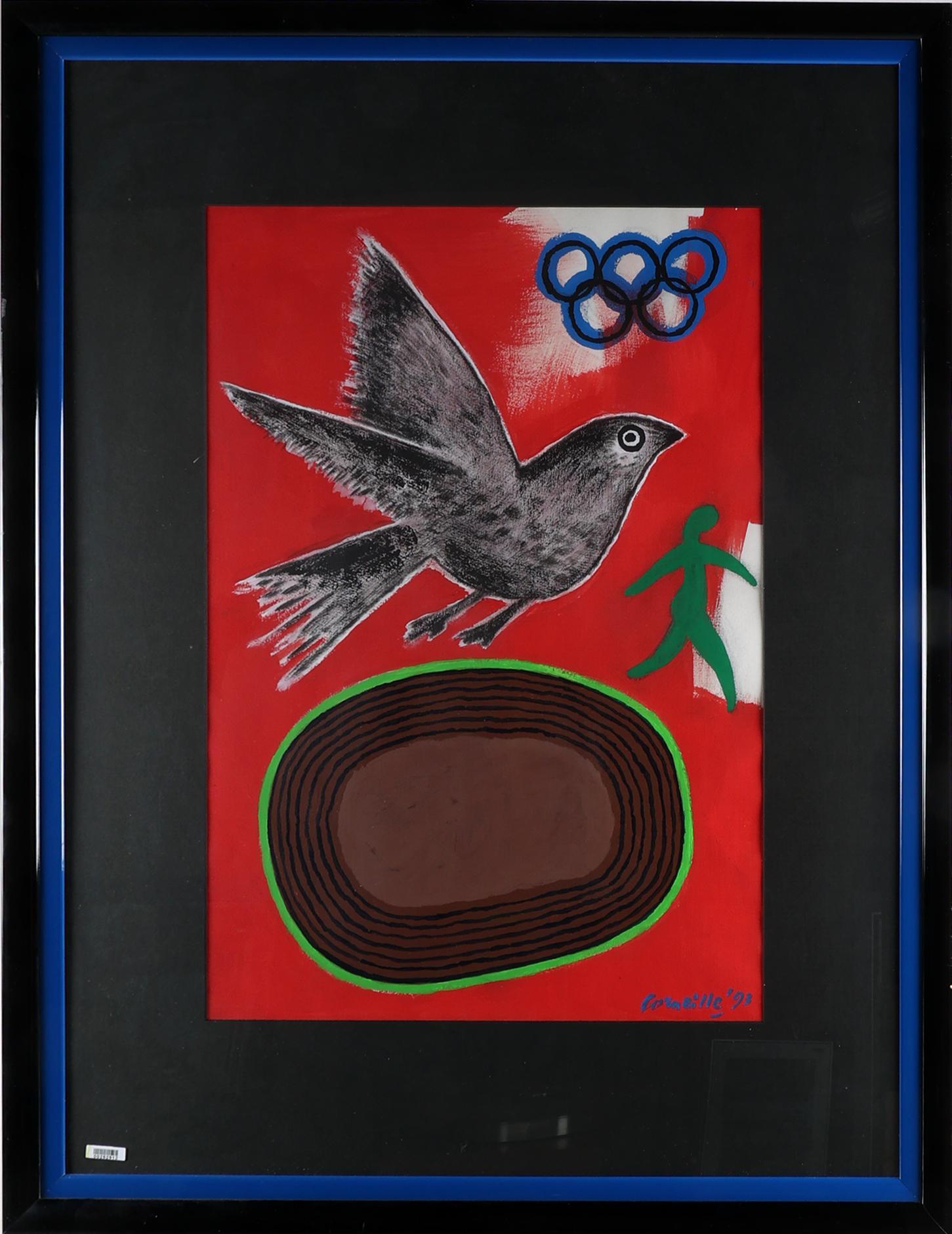'Corneille', alias van Cornelis Guillaume van Beverloo, (1922-2010), origineel ontwerp voor Het Europees Olympisch Jeugdfestival, gesigneerd en gedateerd '93, gemengde techniek op papier, 68 x 49 cm. Nota bene: in 1993 kreeg Corneille de opdracht om een poster te ontwerpen voor Het Europees Olympisch Jeugdfestival dat in Valkenswaard werd gehouden. Één van deze posters is inbegrepen bij dit kavel.
