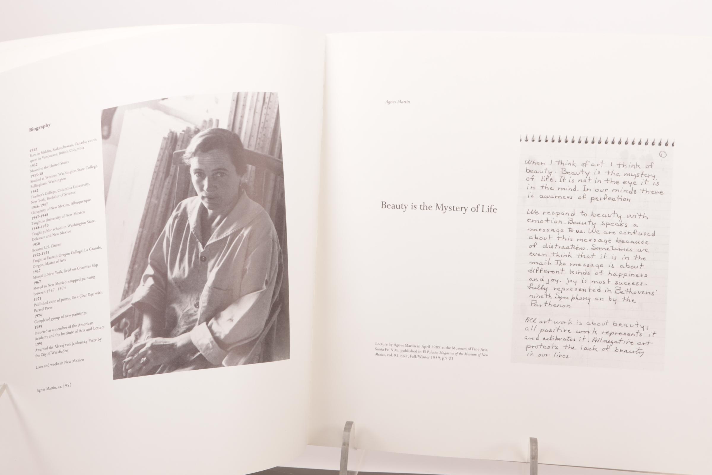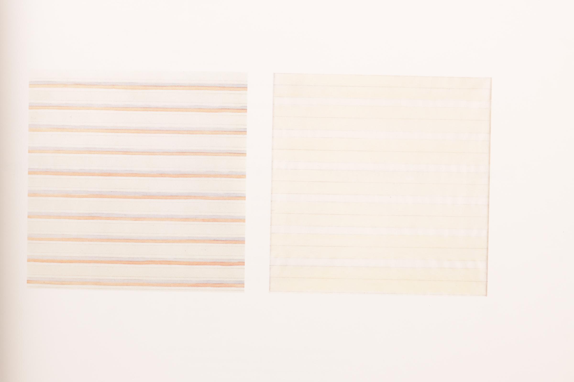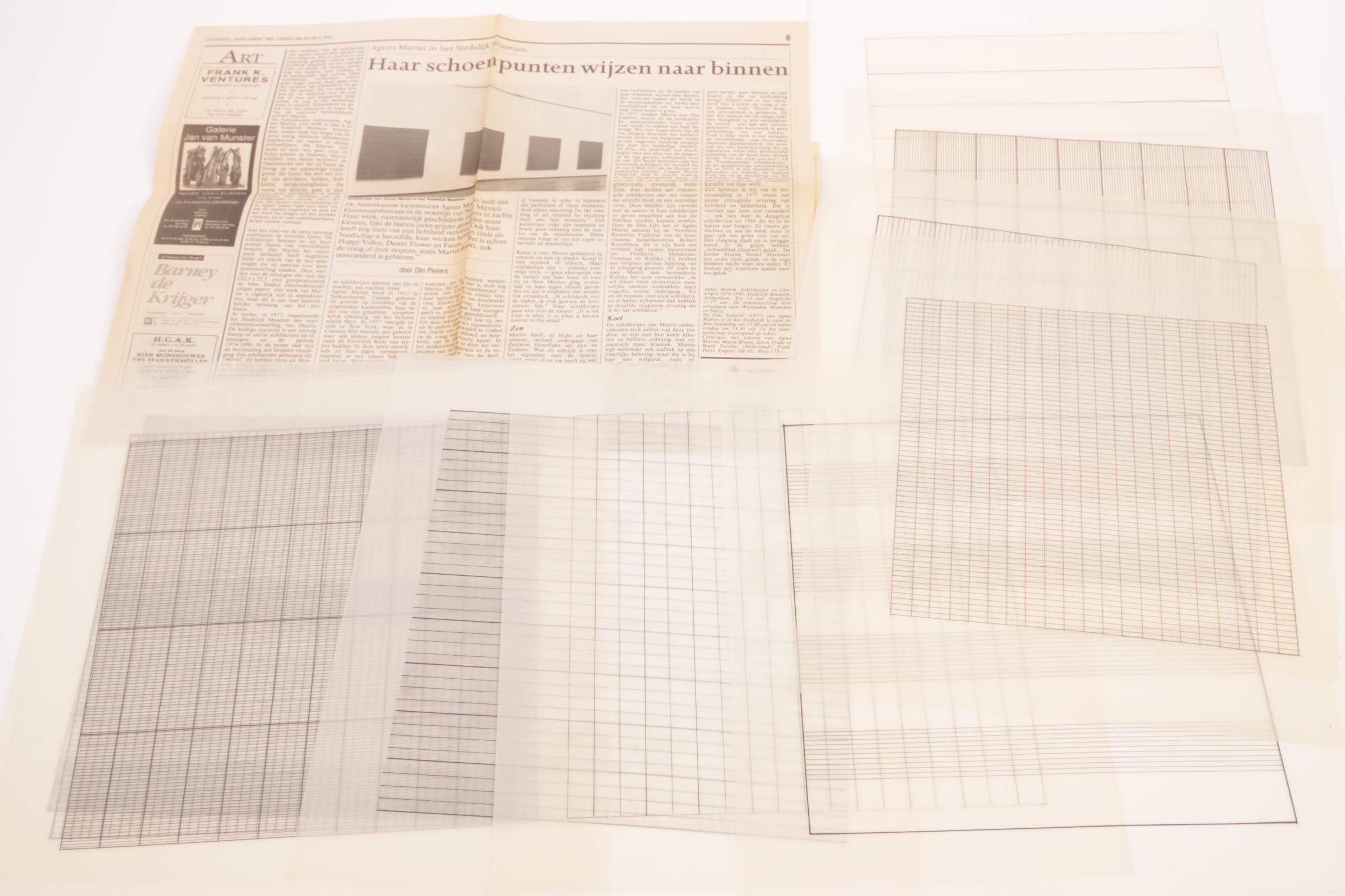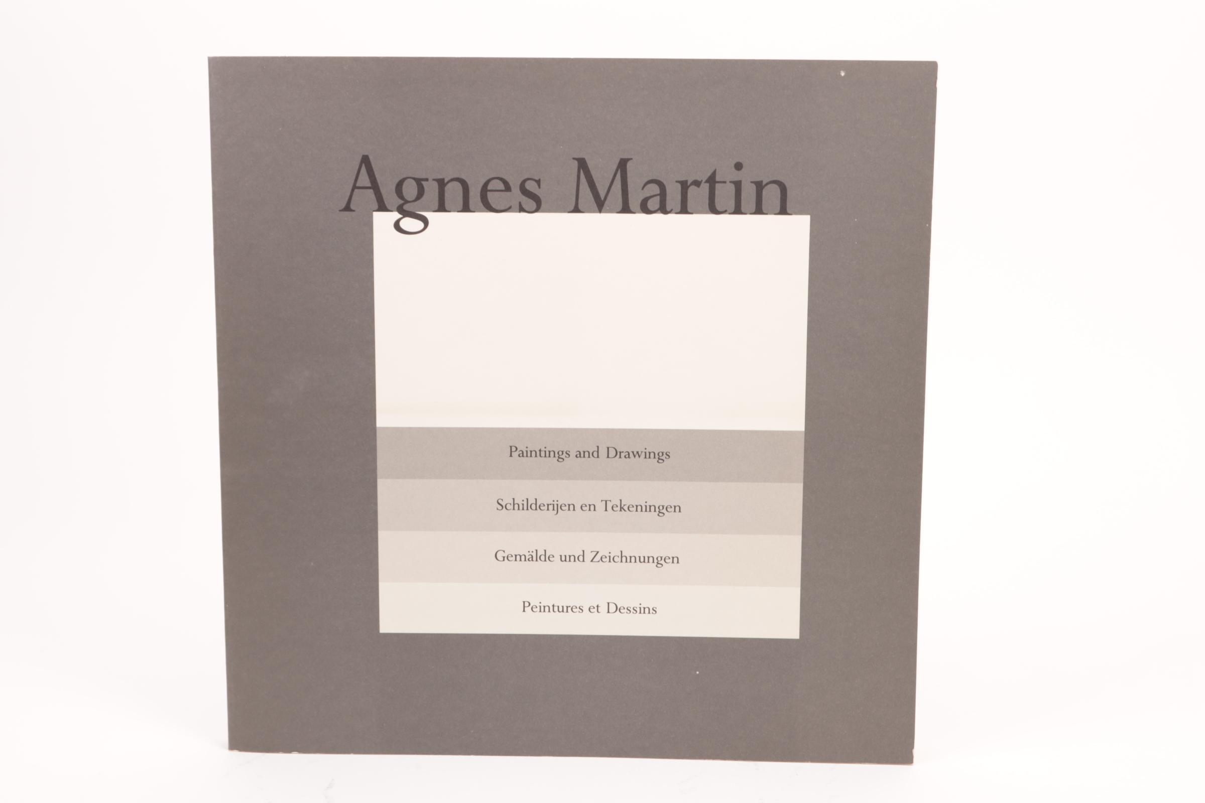 Agnes Martin: Paintings and drawings / Schilderijen en tekeningen / Gemälde und Zeichnungen / Peintures et Dessins 1974-1990, de complete set van 10 lithografieën geprint in kleur, editie 2500, op vellum transparant papier, geprint door Lecturis, Eindhoven en het Stedelijk Museum, Amsterdam, de lithografieën door Nemela & Lenzen GmbH, Monchengladbach in het originele grijze portfolio, elke lithografie 29,8 x 29,8 cm., de catalogus gepubliceerd met een oplage van 5000, catalogus nummer 744
