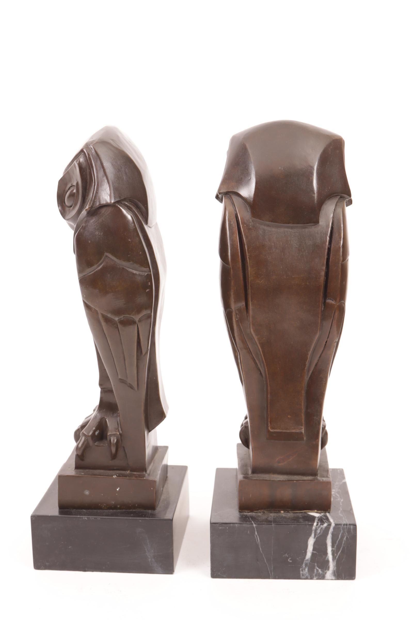 2 Art Deco-stijl boekensteunen i.v.v. uilen rustend op marmeren voetstuk, h.38 cm,.