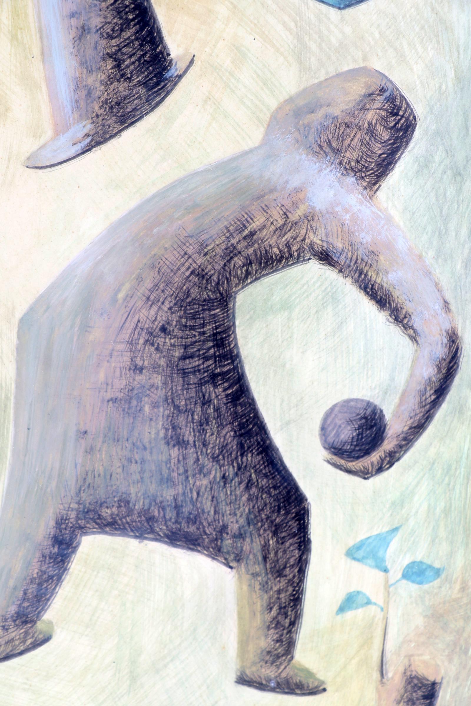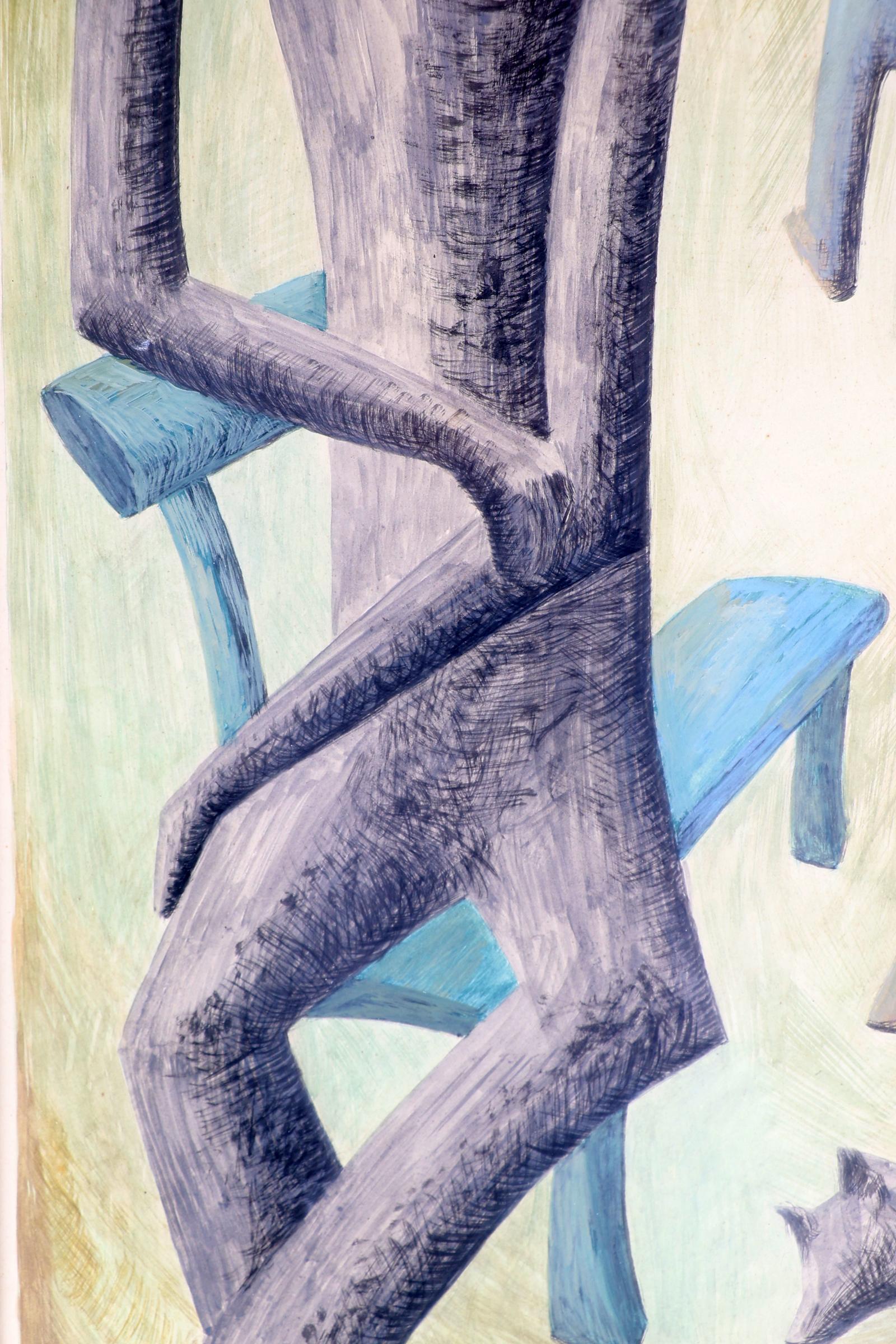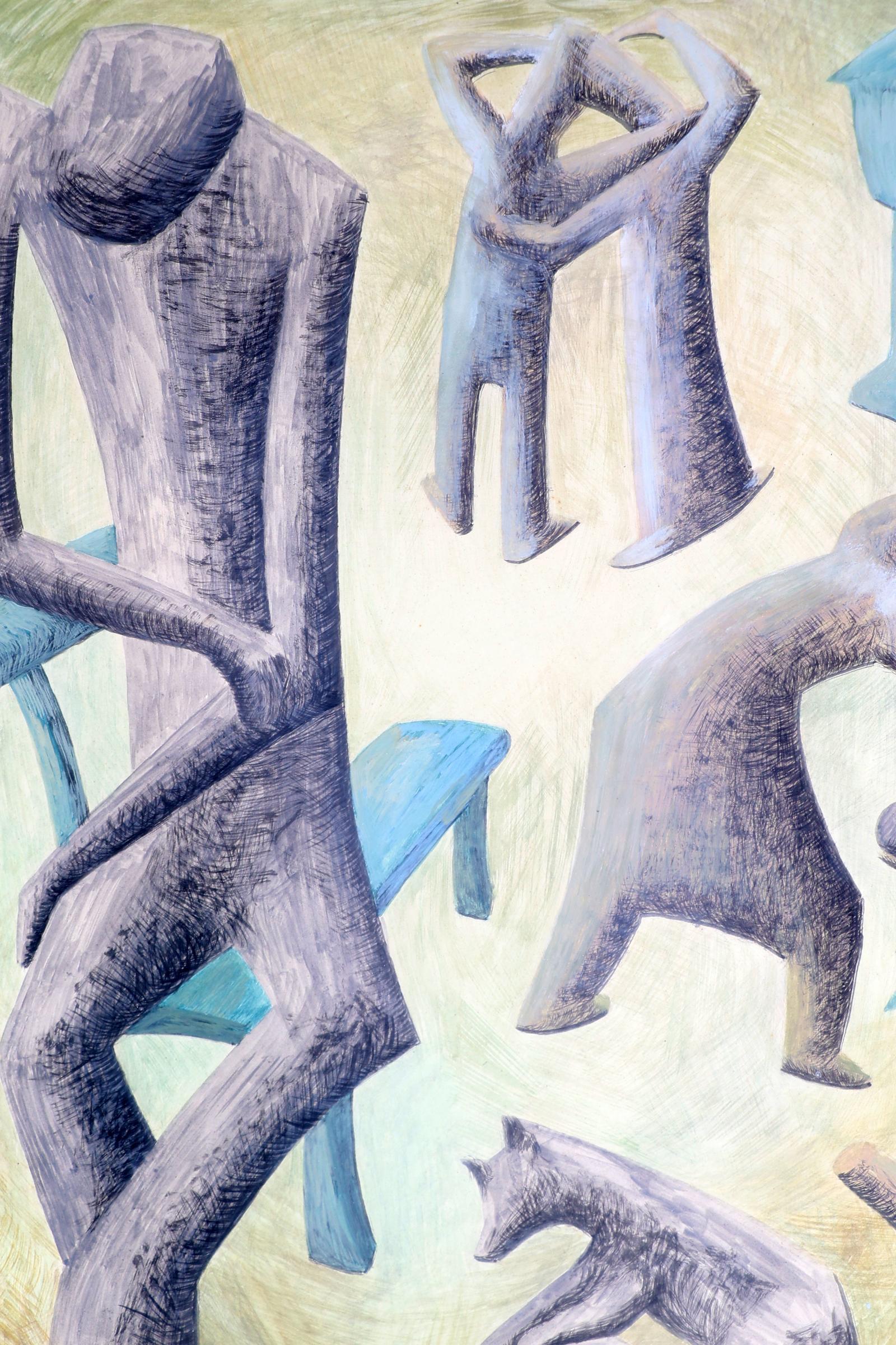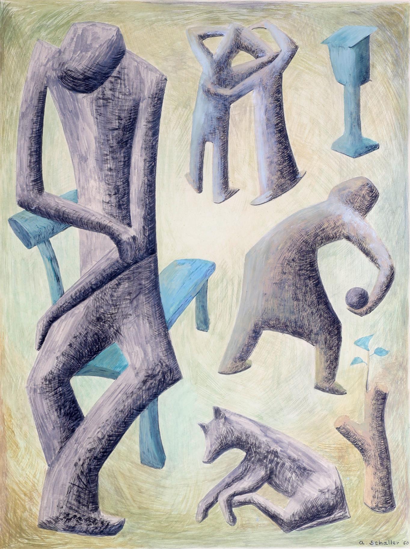 A. Schaller, Abstracte personen en hond in landschap, gouache, gedateerd 1950, 56 x 42 cm.
