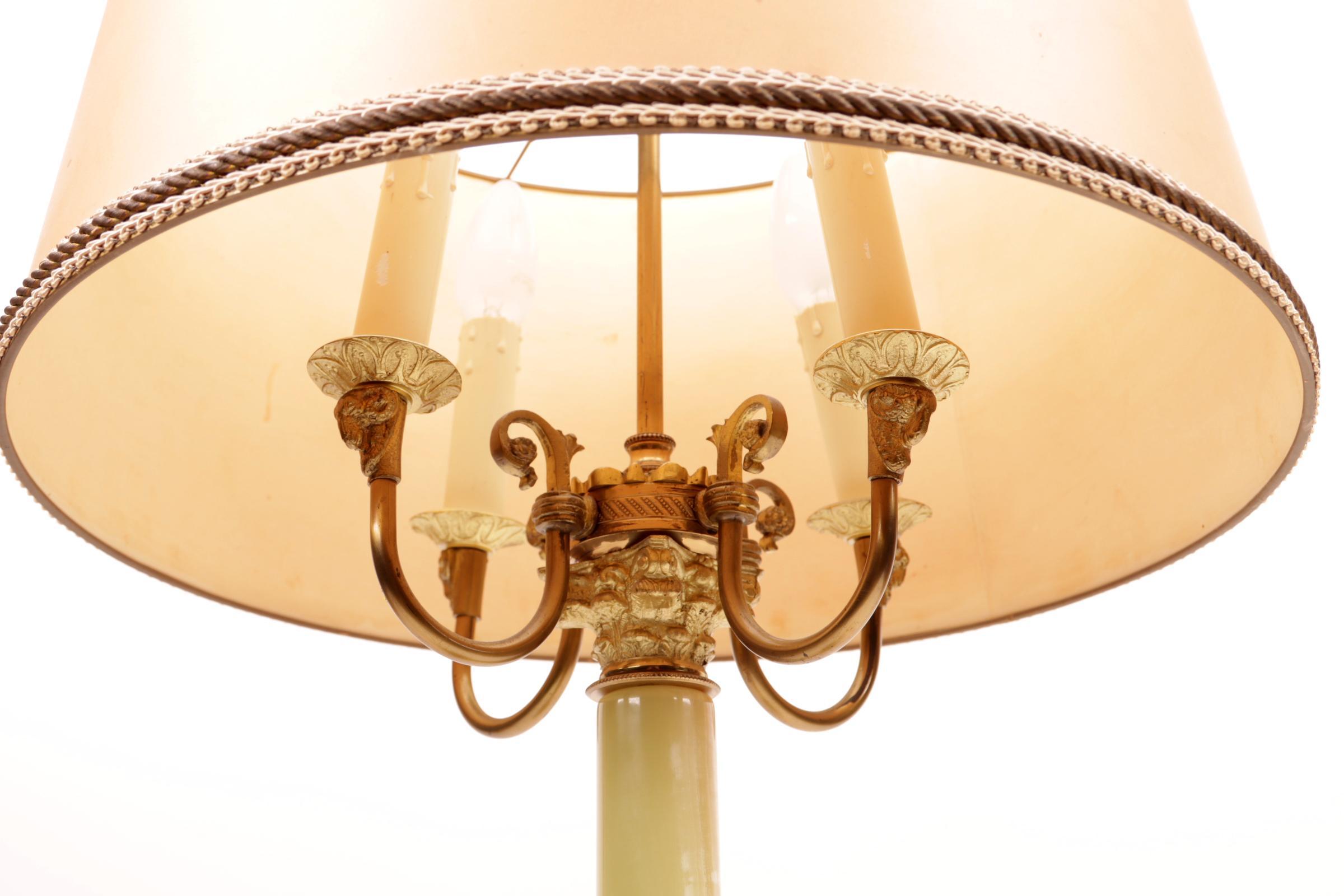Koperen met albasten schemerlampvoet met goudkleurige kap, h.69 cm.