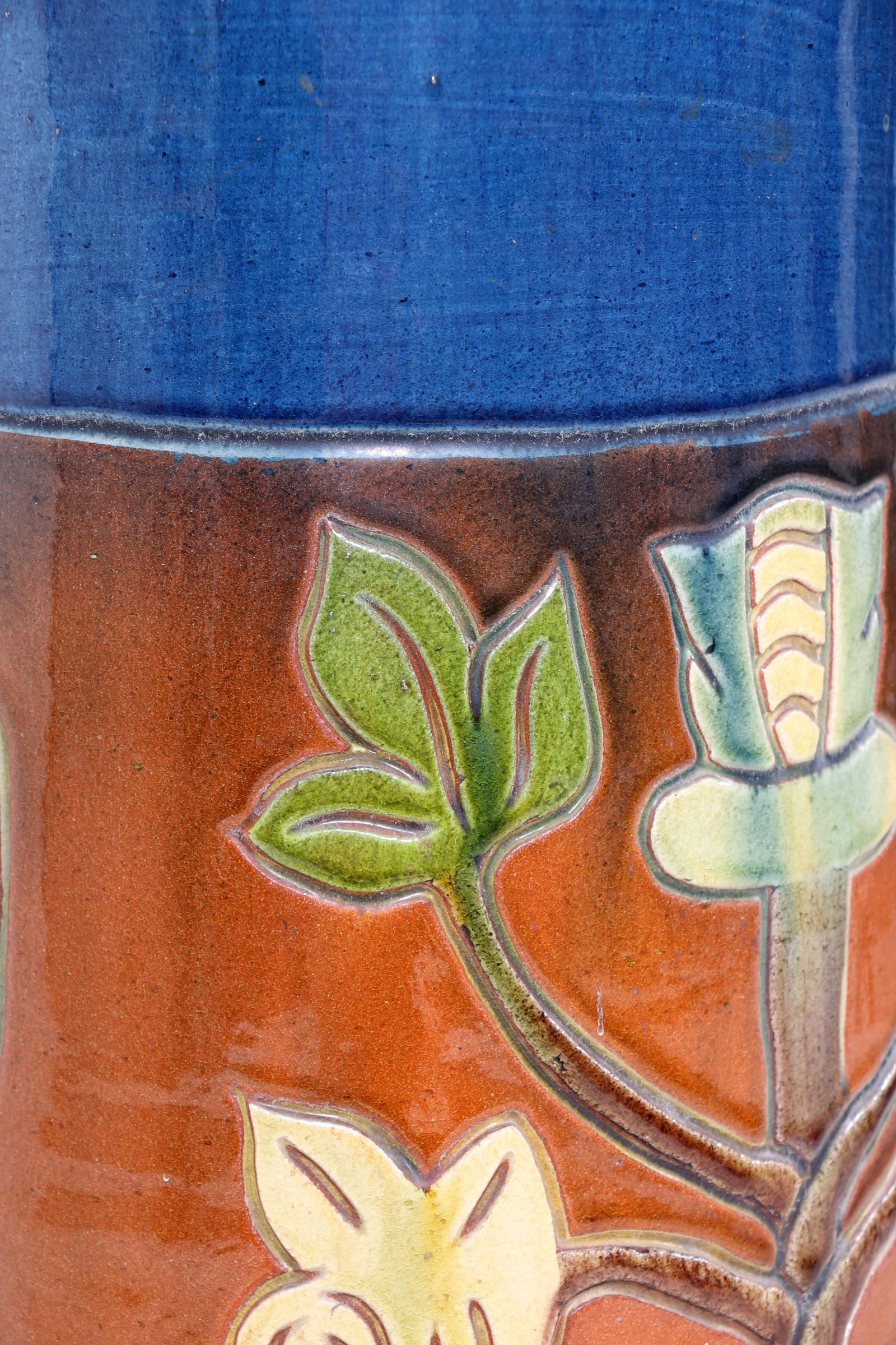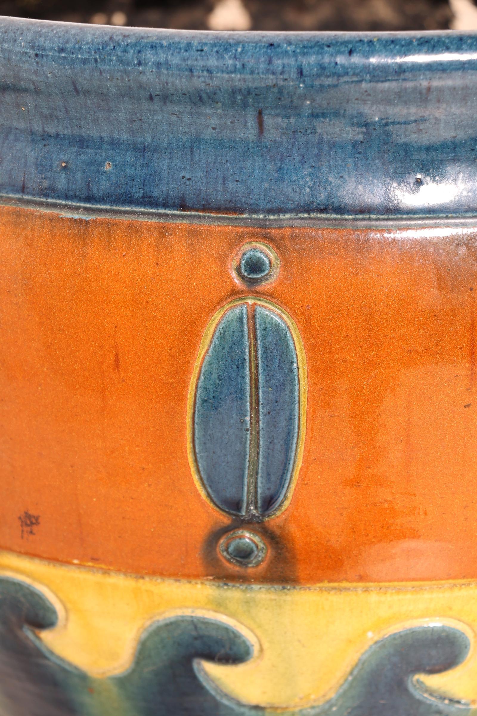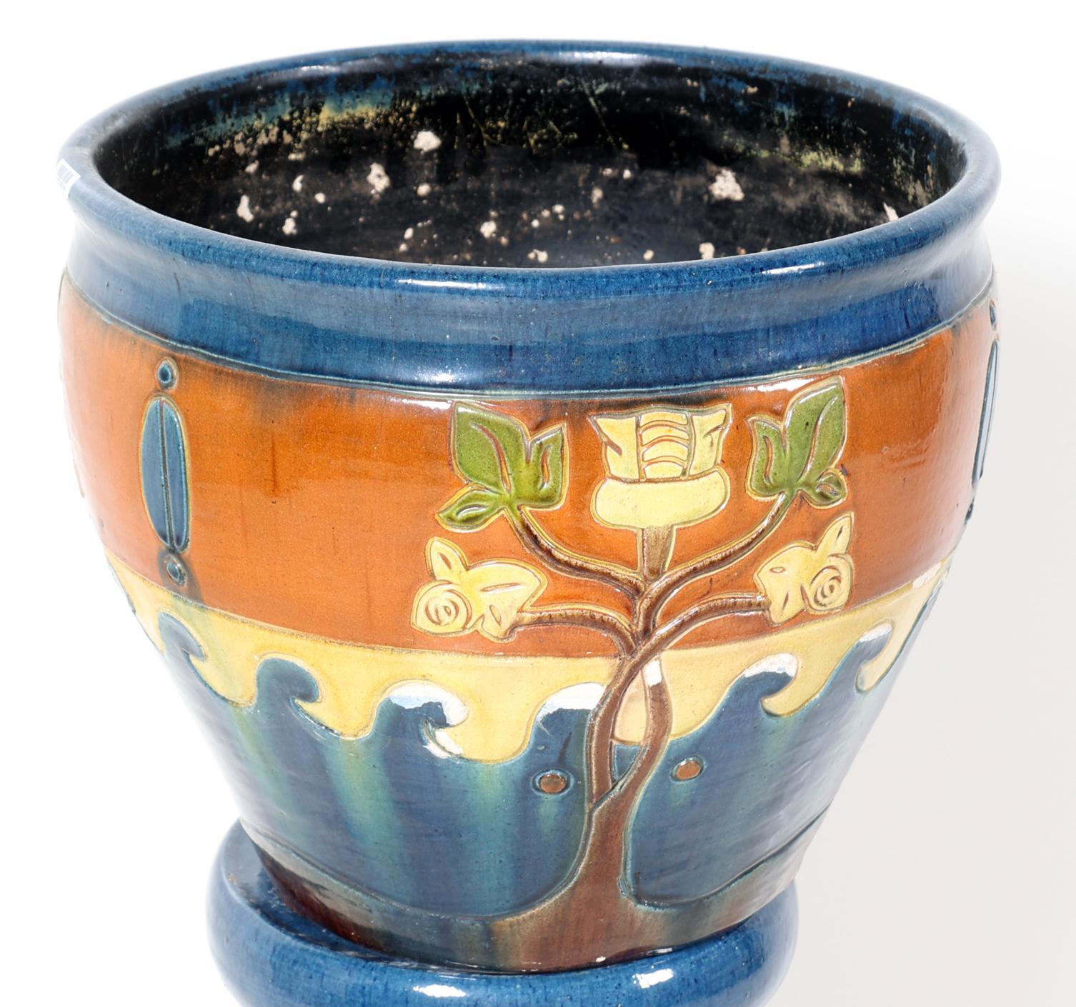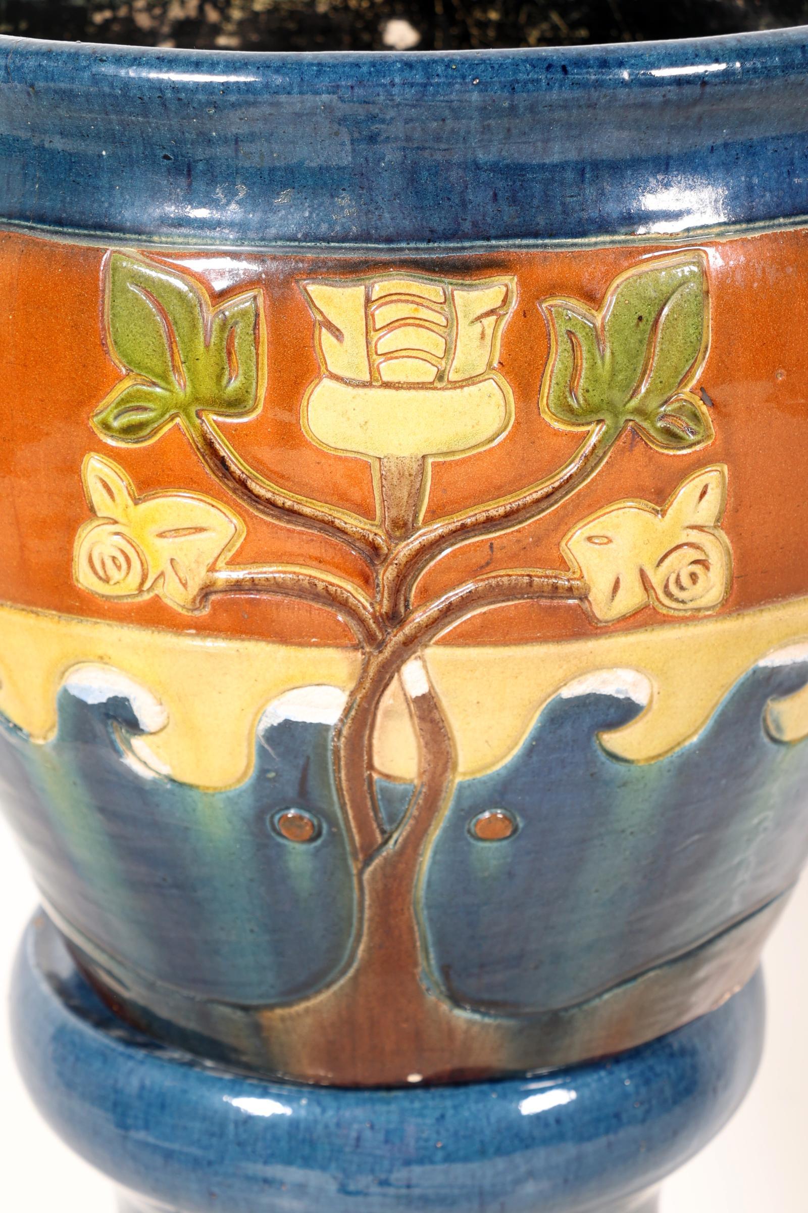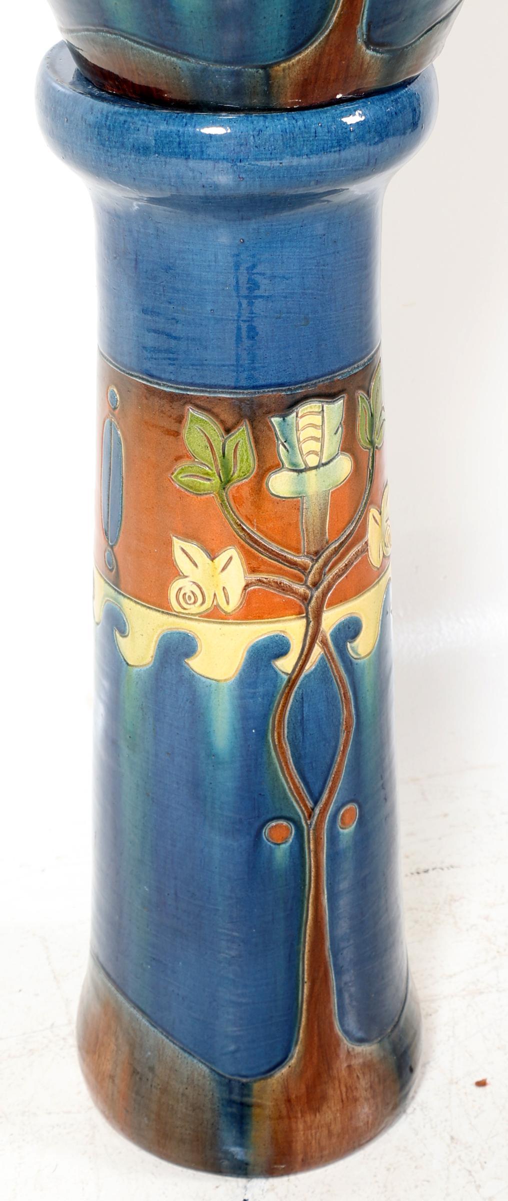 Geglazuurde aardewerken cachepot op zuil met Jugendstil motieven (beschadigingen), h.110 x diam.36 cm.