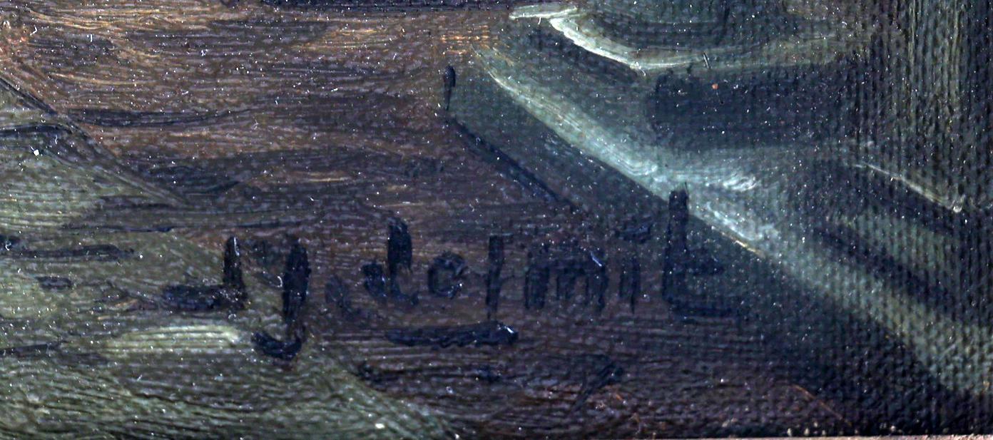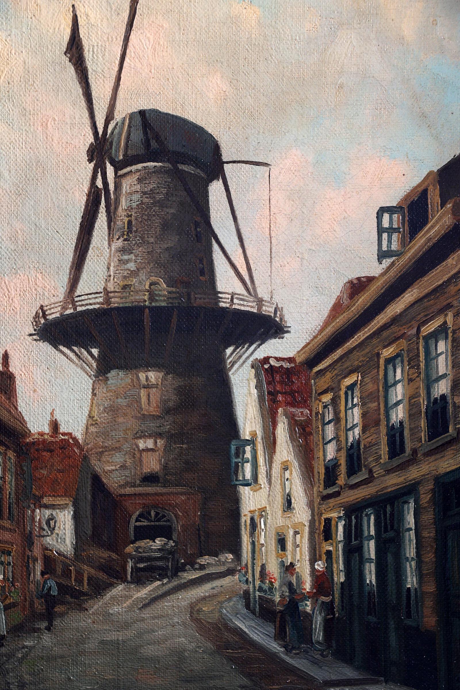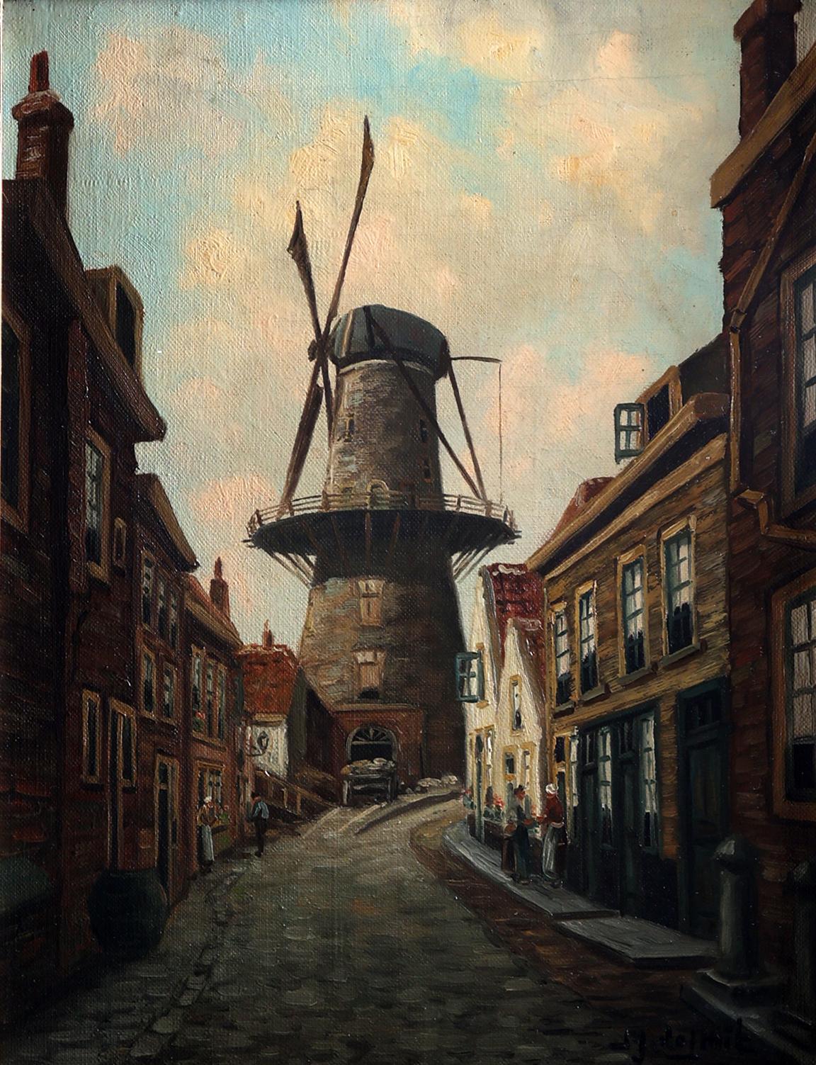 J.J. Dolmit, Zicht op een molen in een dorp, olieverf op doek, 32 x 42 cm.