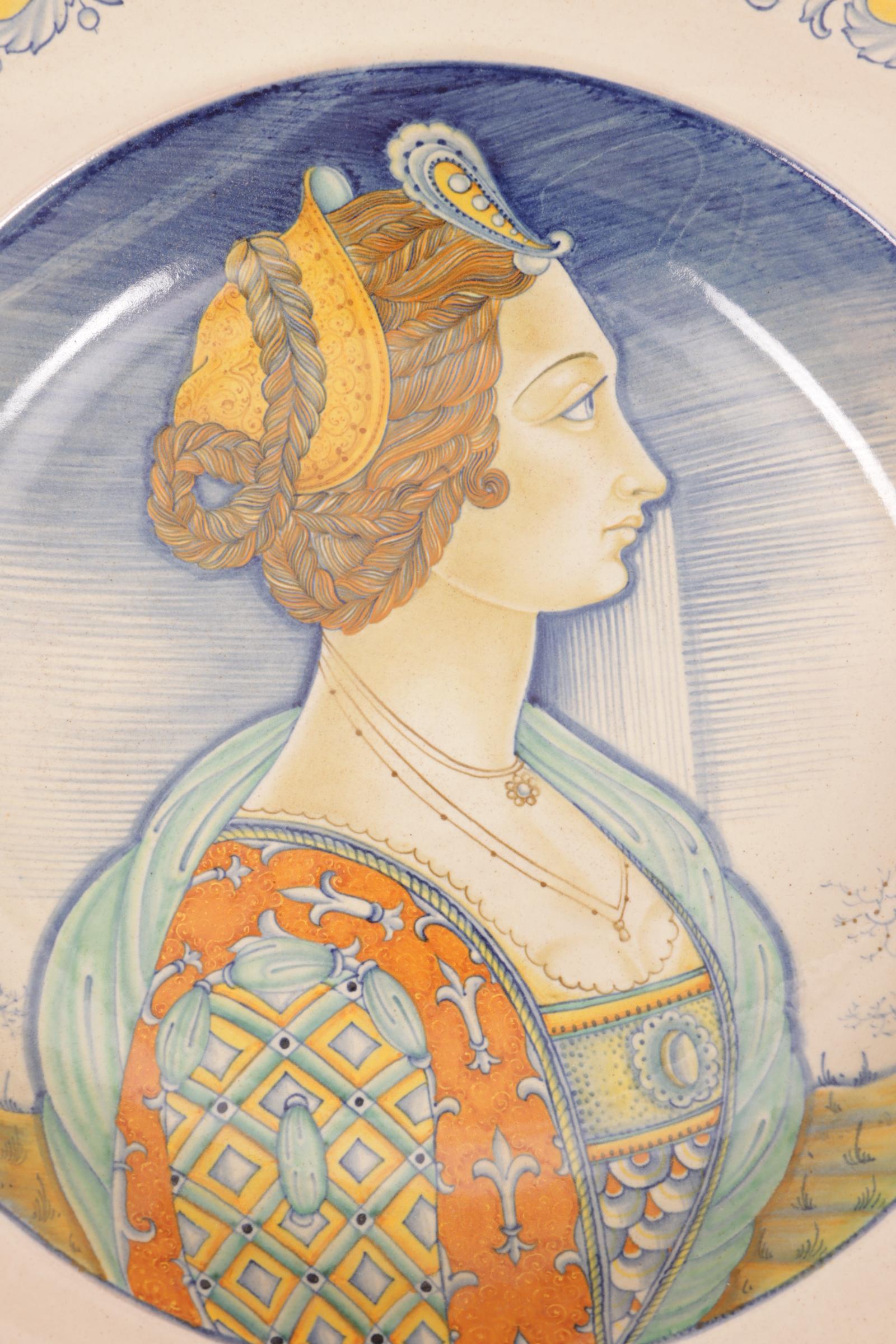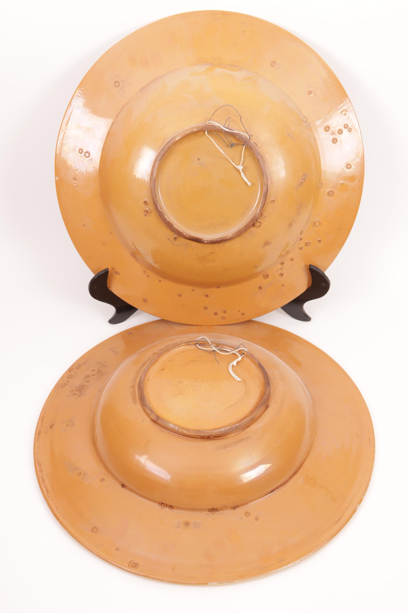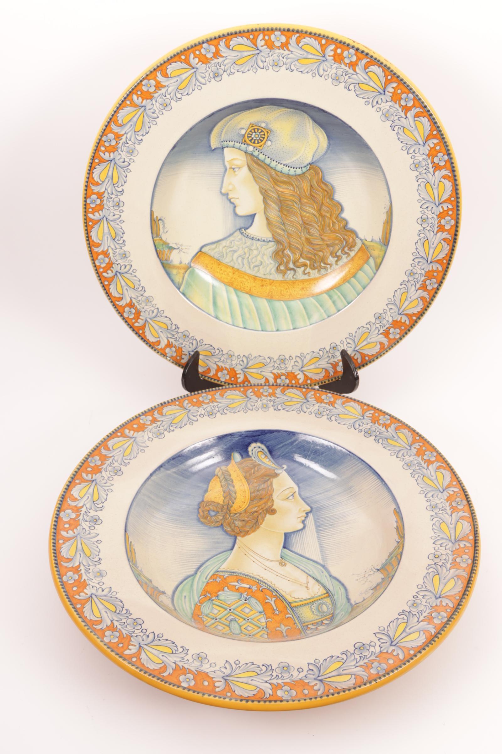 2 Grote met man en vrouw gedecoreerde Majolica diepe schotels, diam.49 x h.8 cm.