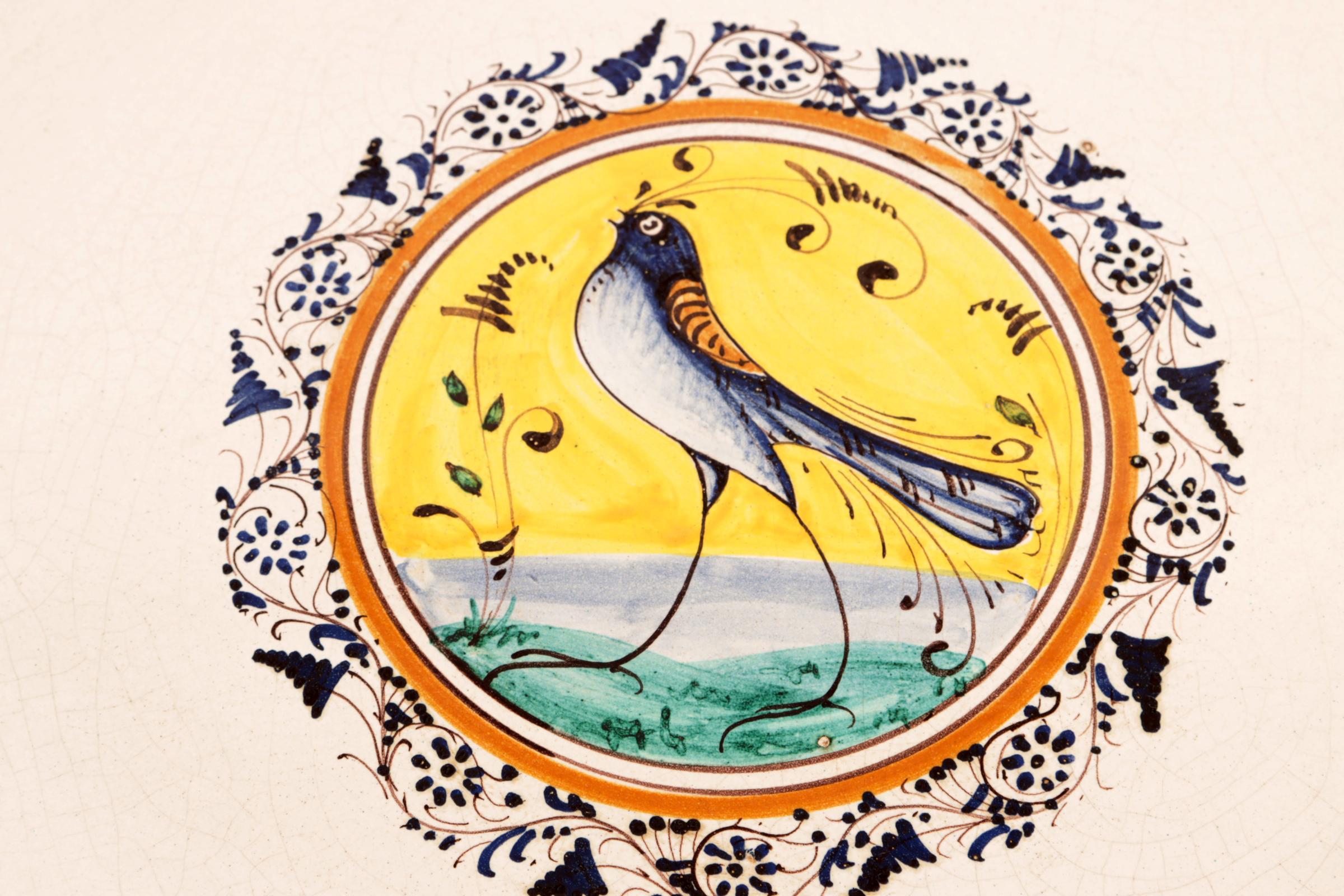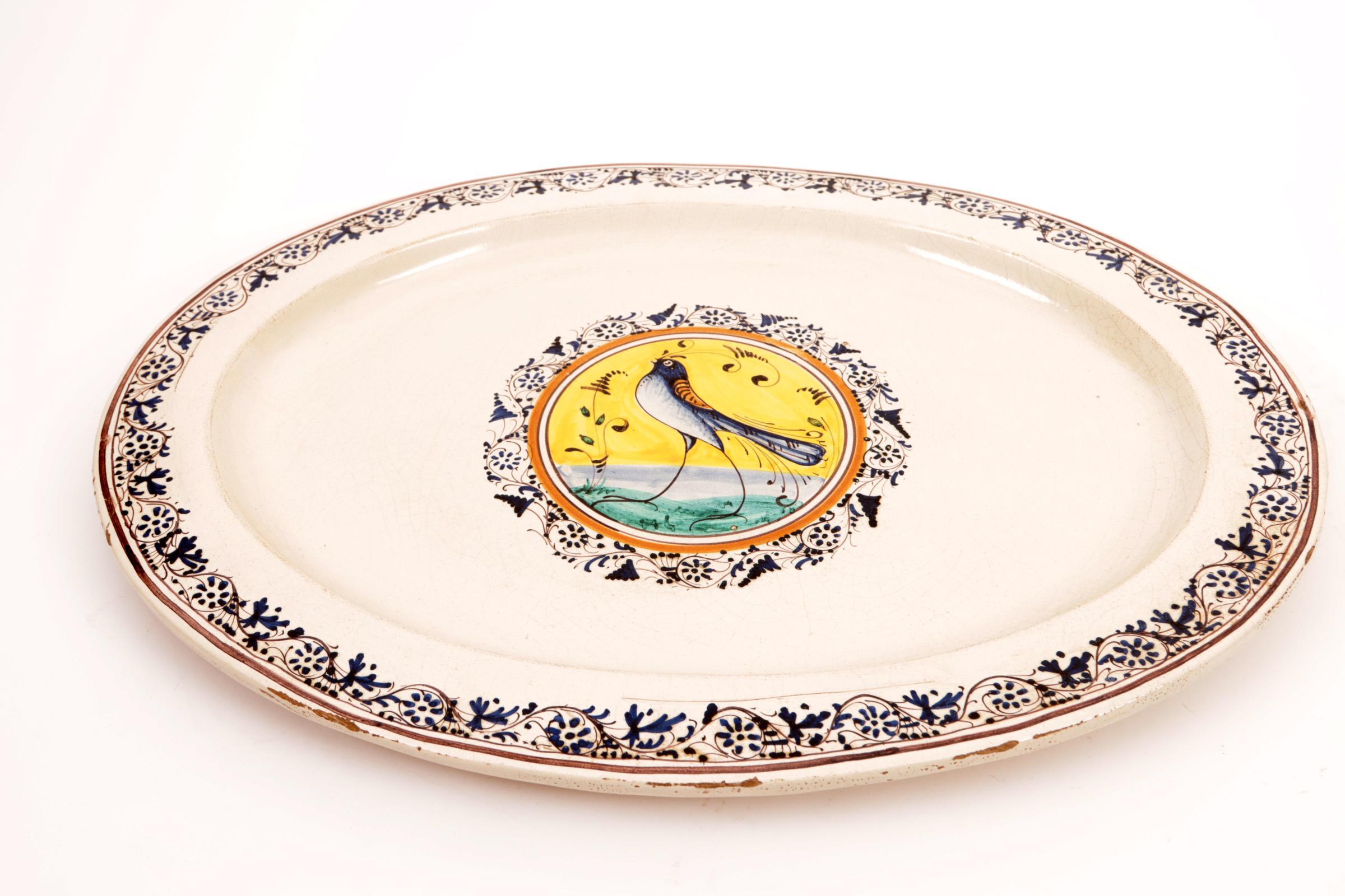 Ovale met vogels gedecoreerde aardewerken schotel, diam.56 x 43 cm.