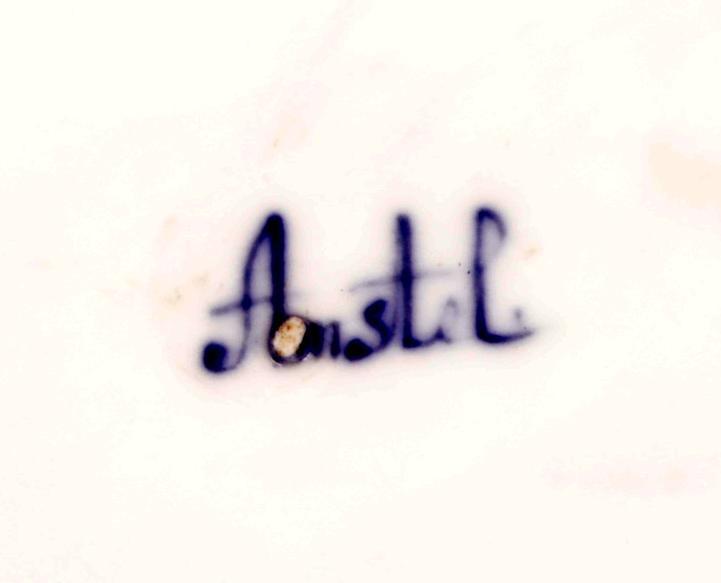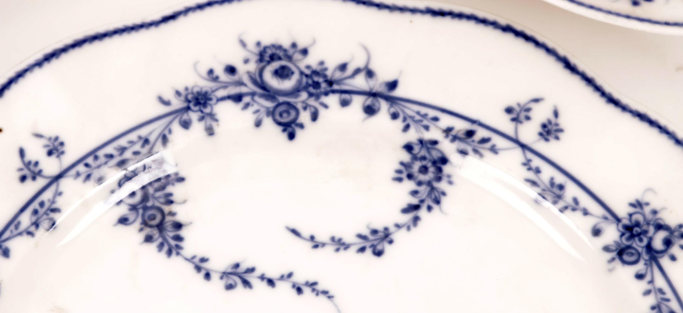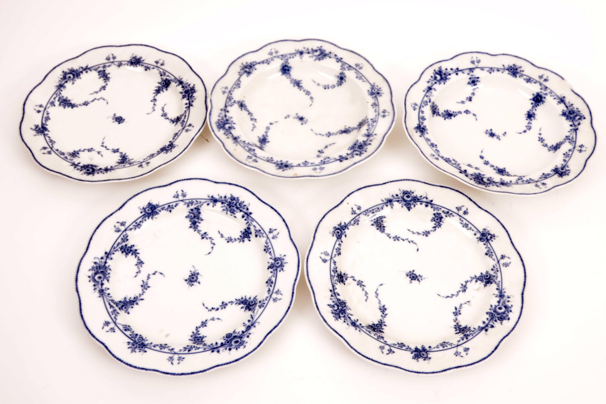3 Wit met blauwe strooibloemen gedecoreerde porseleinen platte borden, 25,5 cm. en 2 diepe borden, diam.25,5 cm., gemerkt Amstel, 18e eeuw
