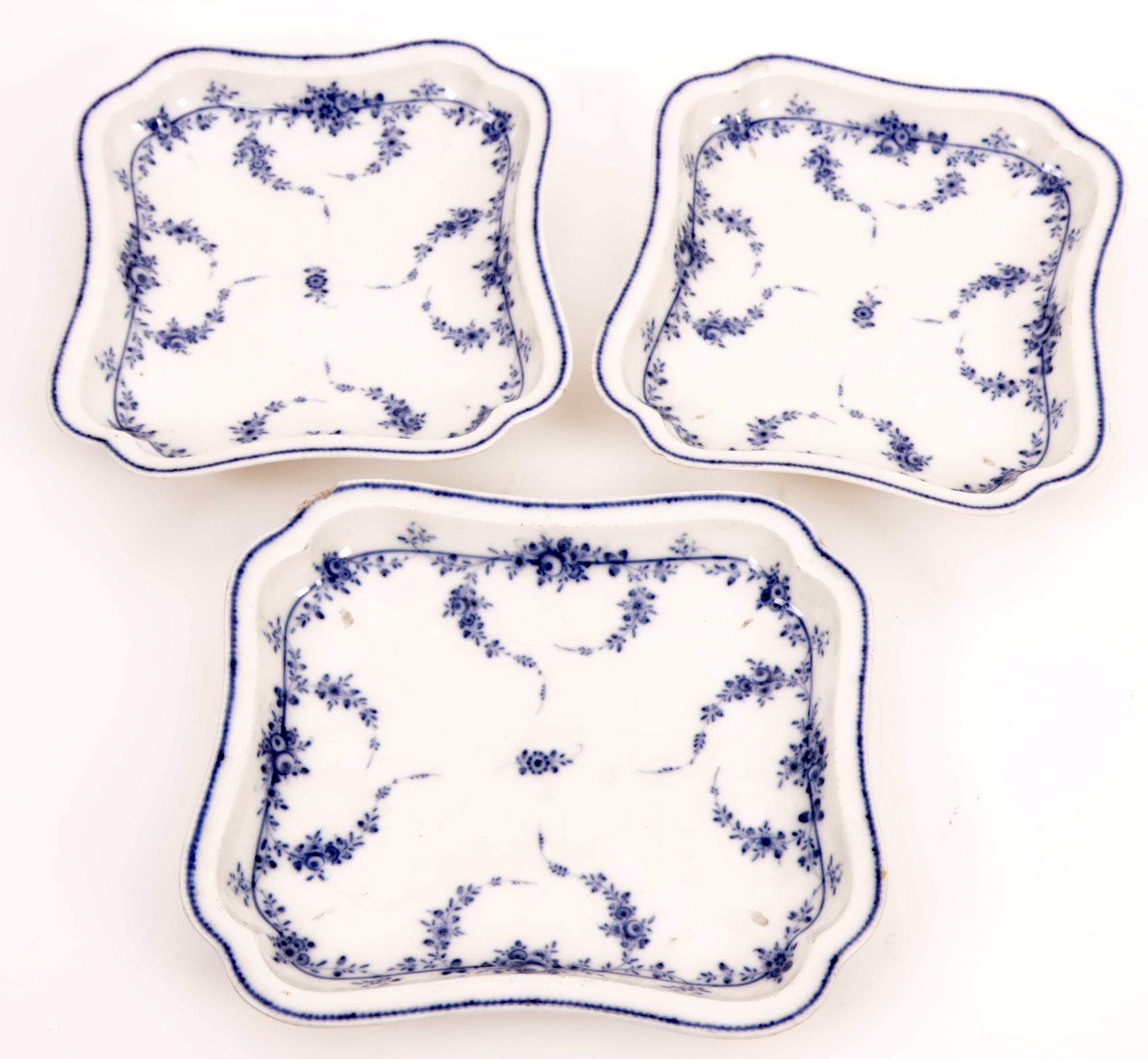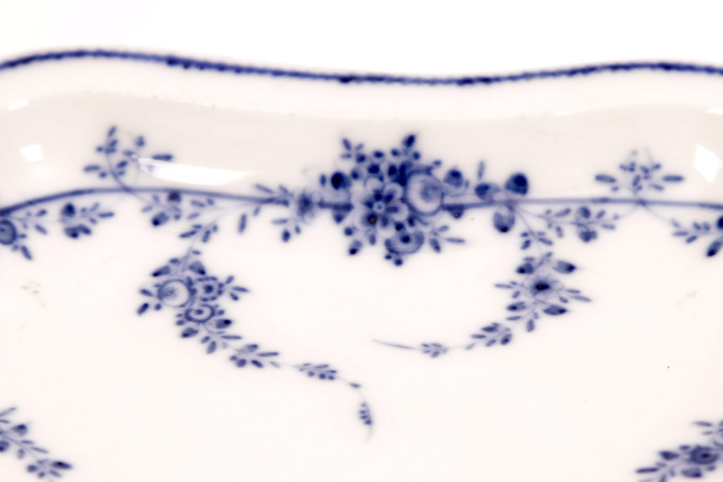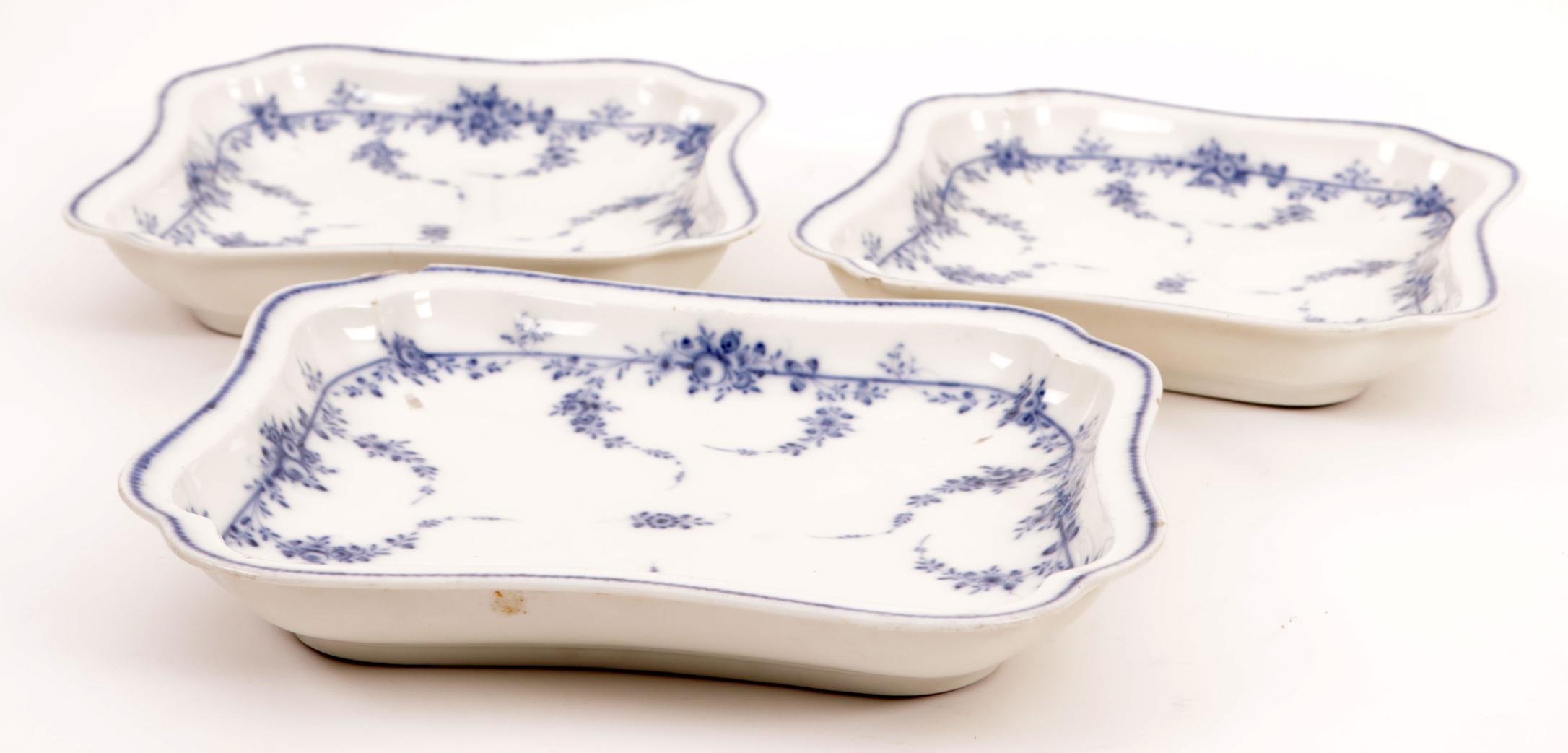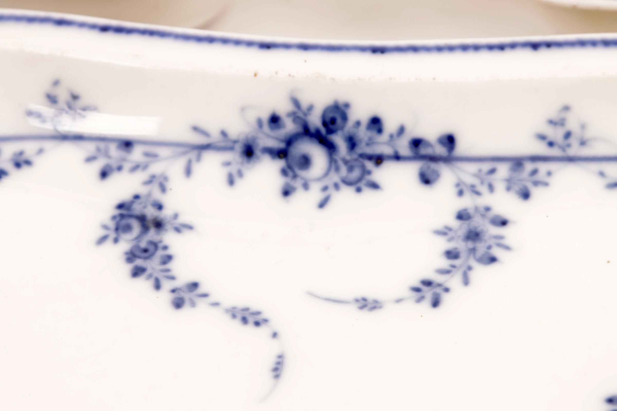 3 Wit met blauwe strooibloemen gedecoreerde porseleinen schalen, gemerkt Amstel, 18e eeuw, h.5 x b.26 x d.23 cm.