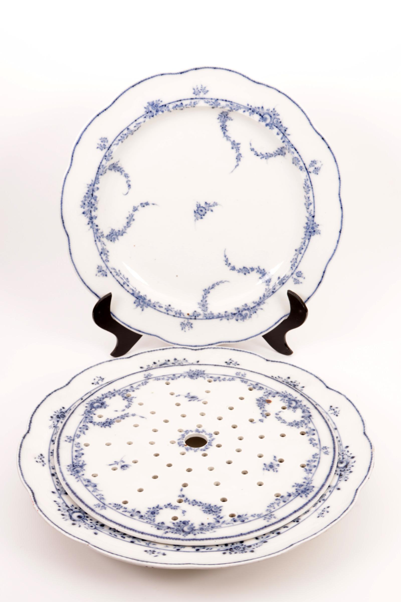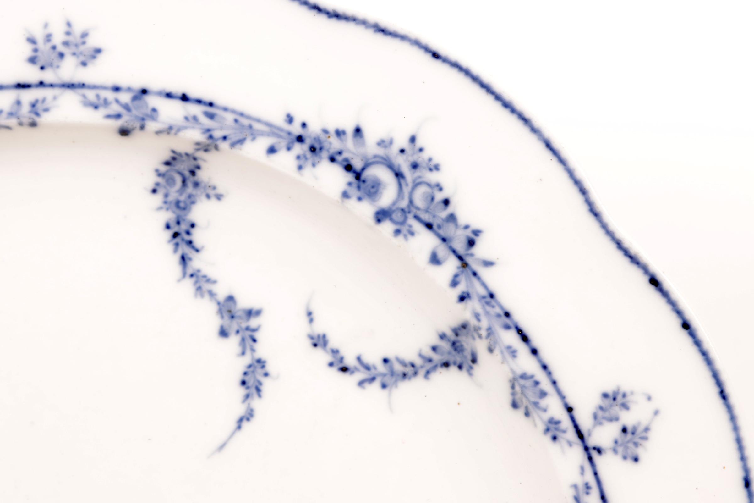 2 Wit met blauwe strooibloemen gedecoreerde Loosdrechts porseleinen grote schalen, diam.45 cm., gemerkt M.O.L., 18e eeuw en een niet gemerkte lekschaal