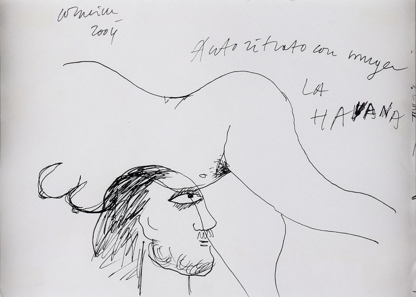 'Corneille', alias van Cornelis Guillaume van Beverloo, (1922- 2010), Autoritratto con meyer (Zelfportret met Meyer), Havana 2004, originele pentekening, 15,5 x 22 cm.