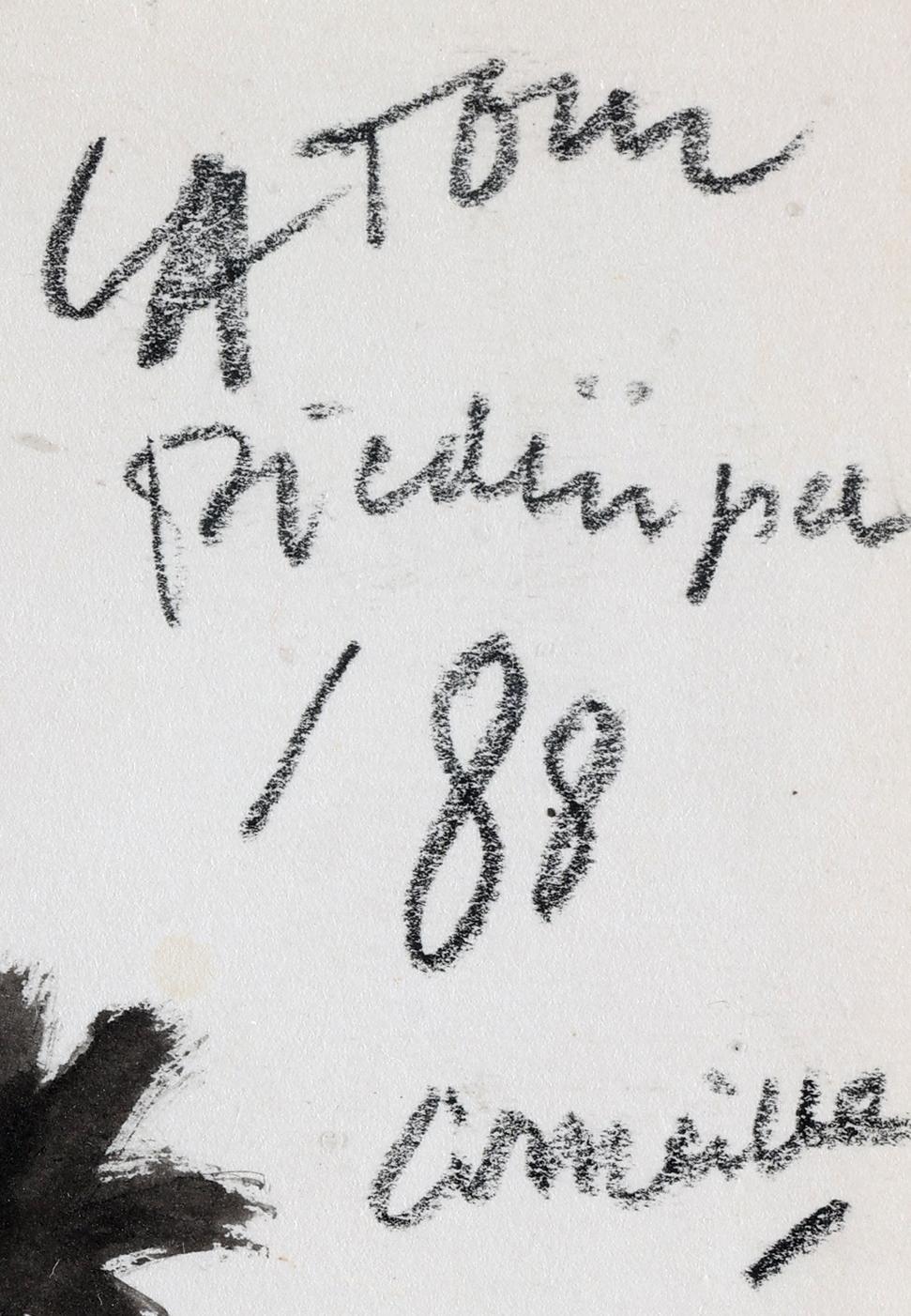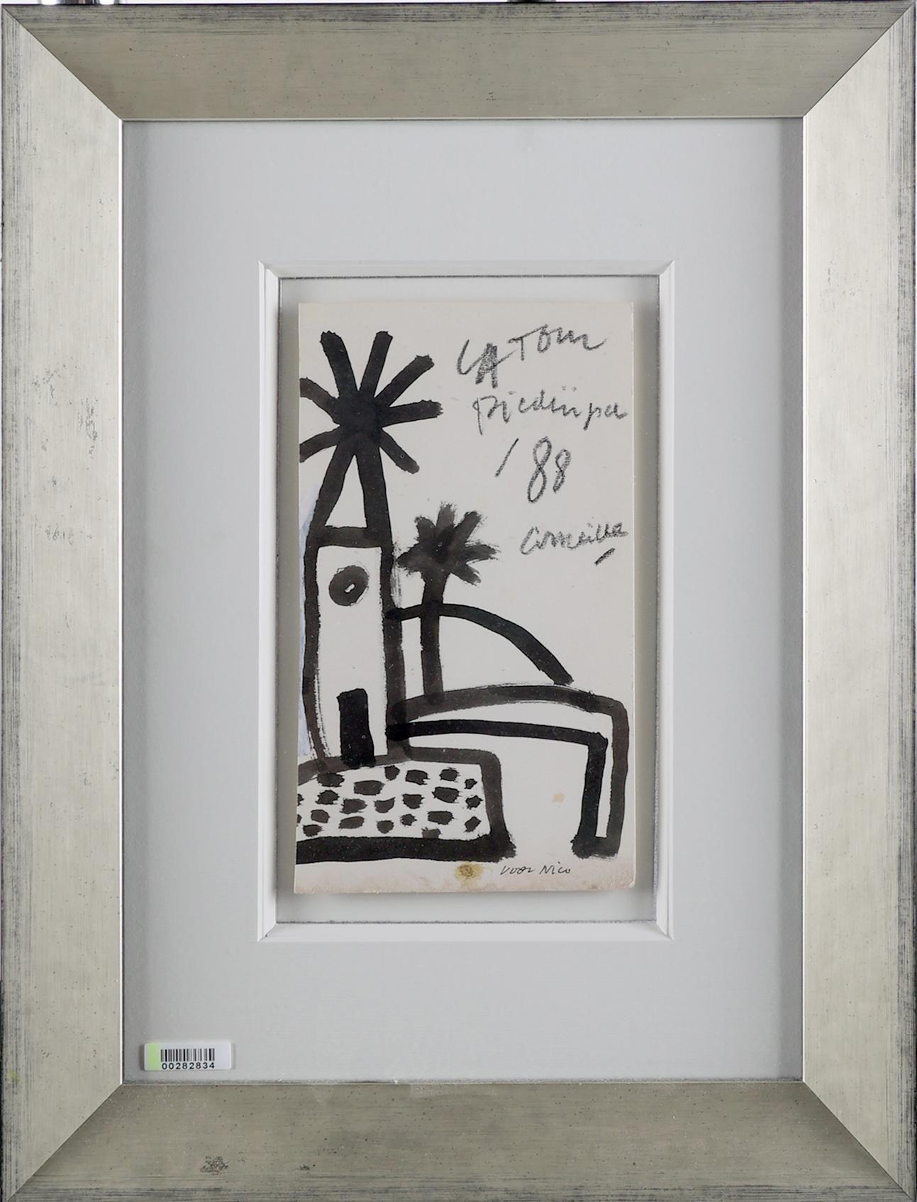 'Corneille', alias van Cornelis Guillaume van Beverloo, (1922- 2010), Kerktoren met palmboom, inkt en krijt op papier, "Voor Nico", gedateerd '88, 22 x 12,5 cm.