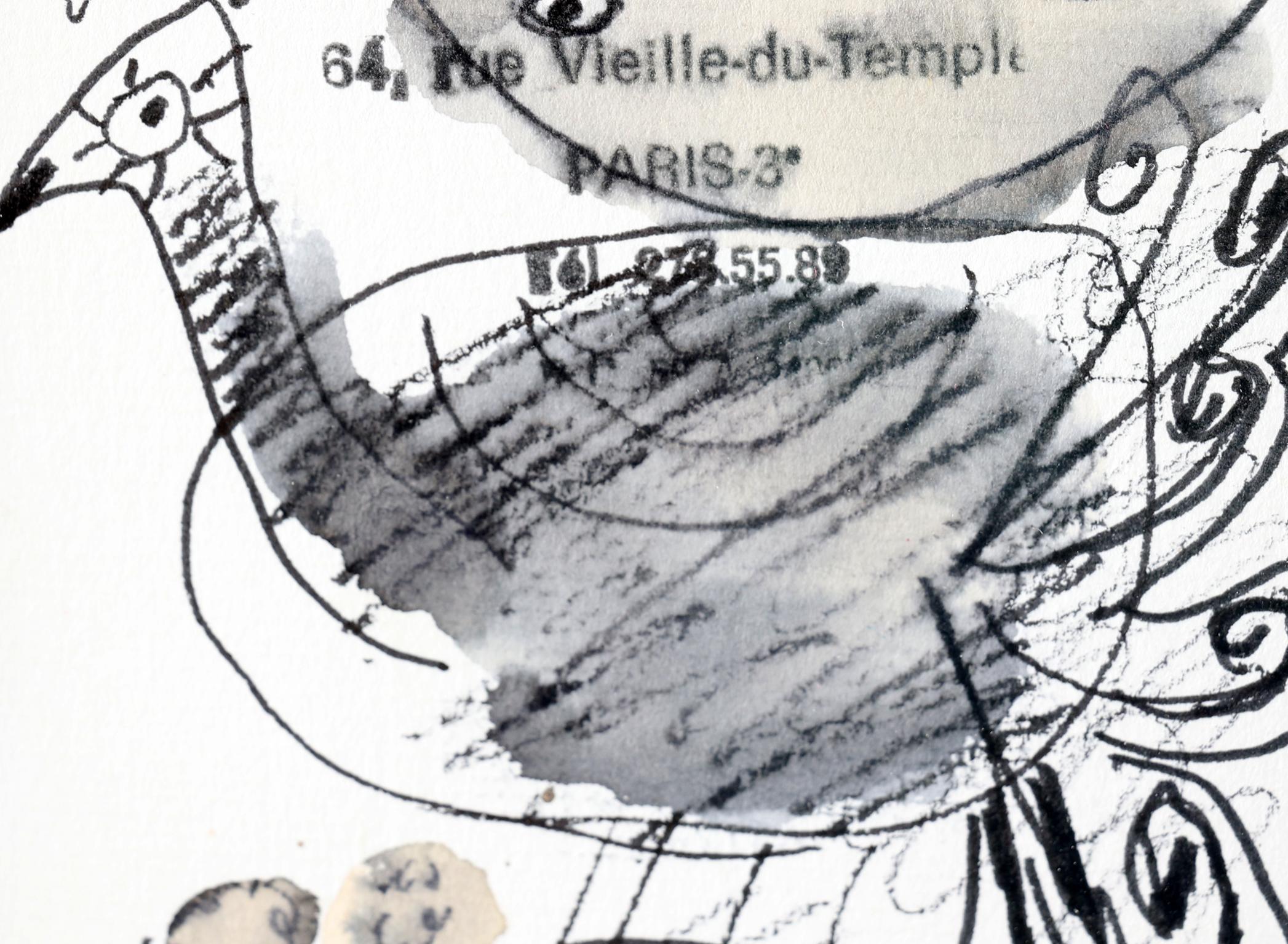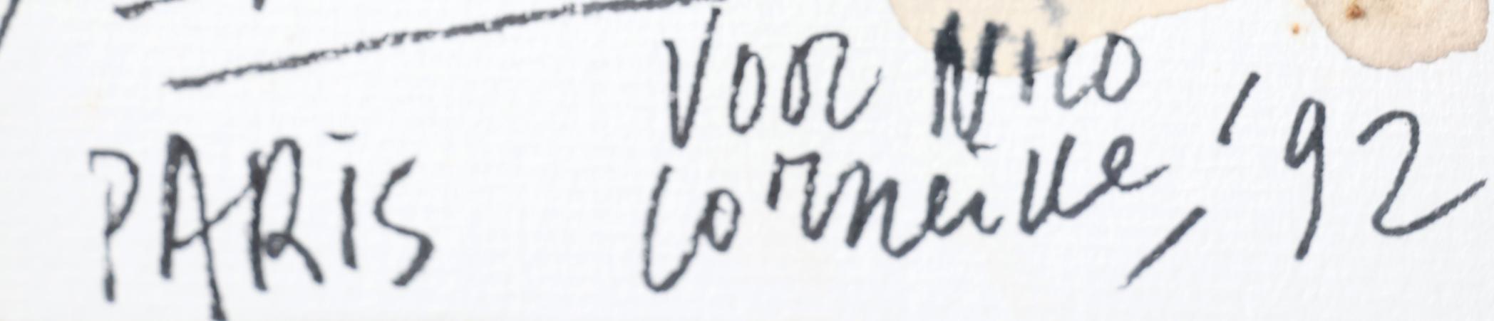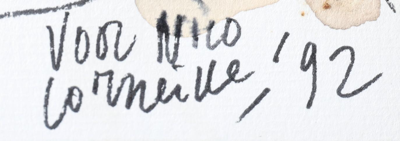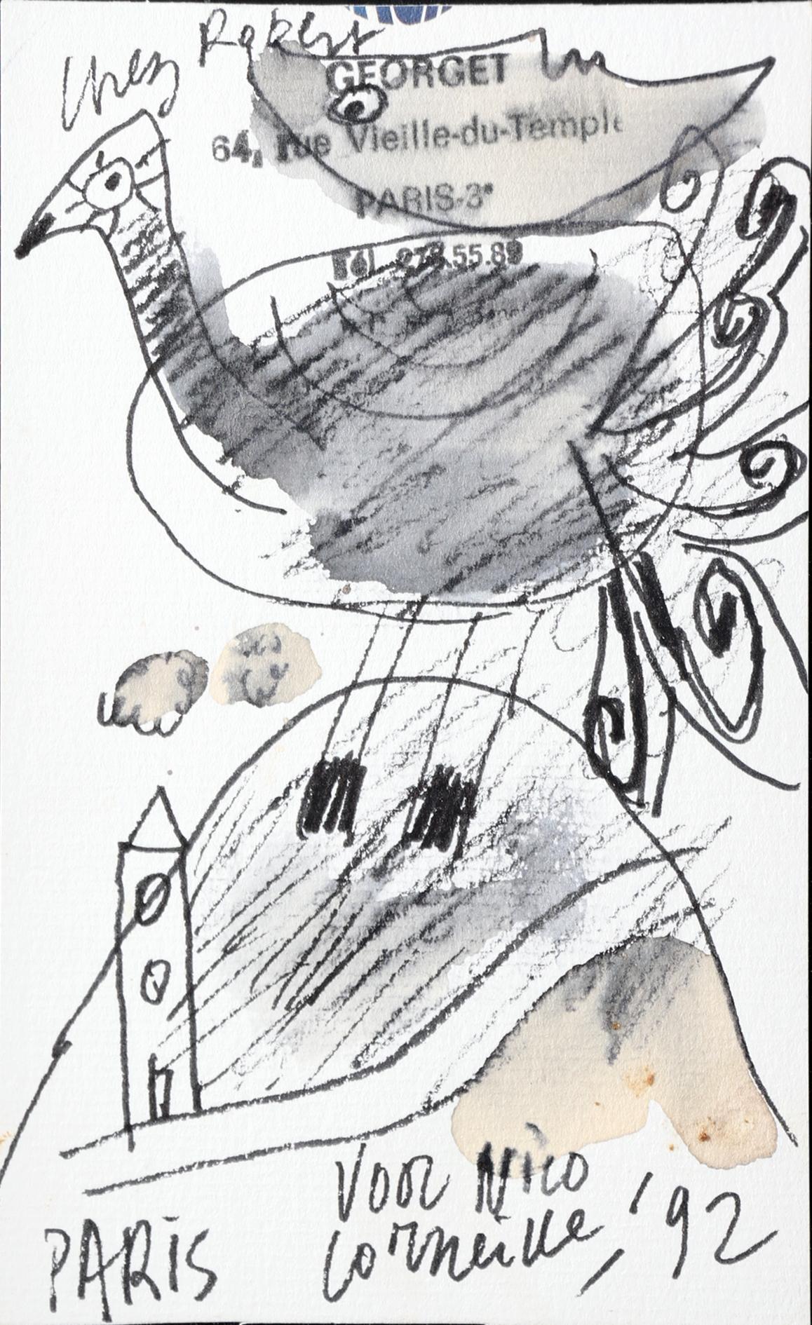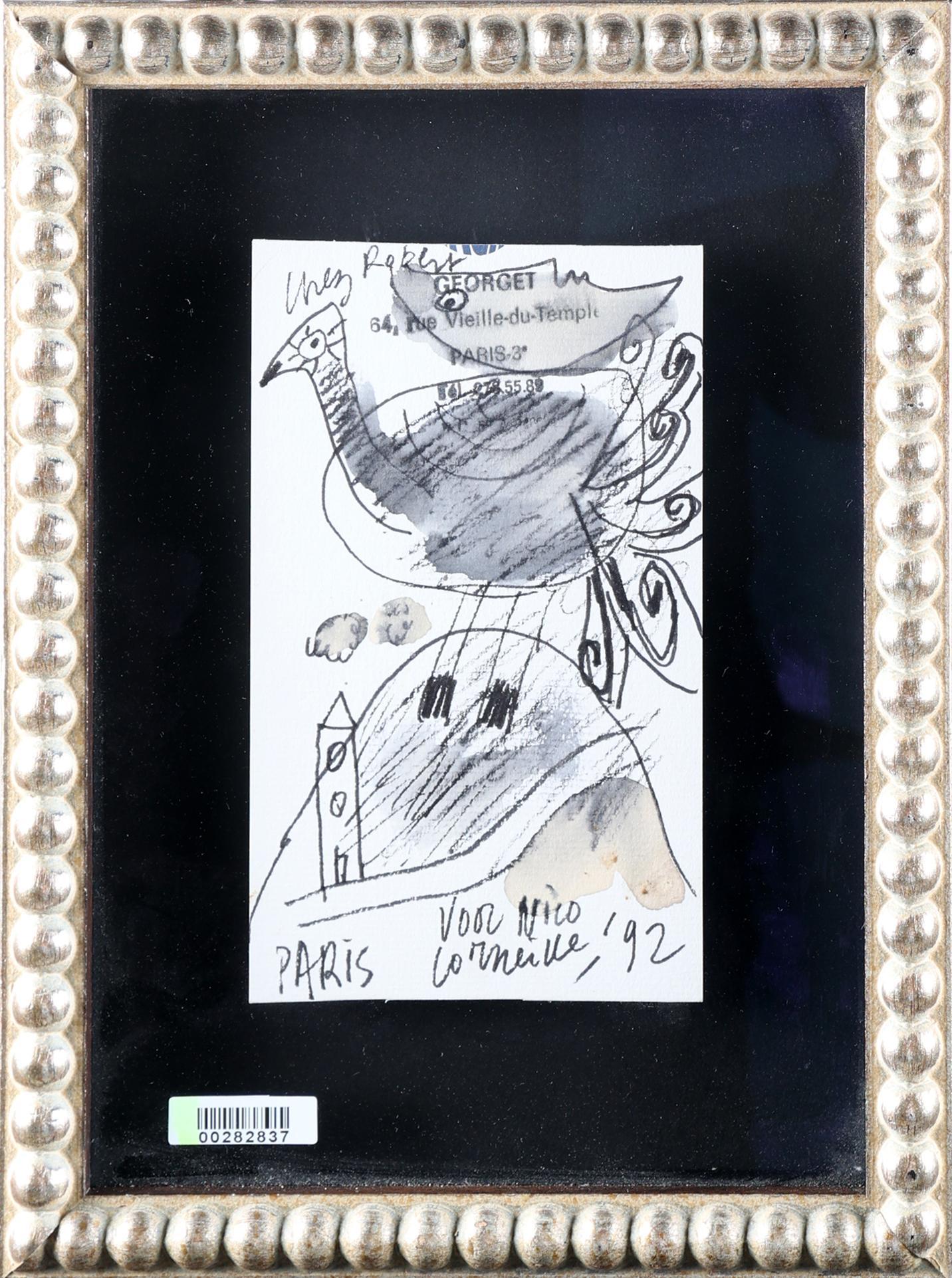 'Corneille', alias van Cornelis Guillaume van Beverloo, (1922- 2010), Pauw in landschap, inkt en krijg op papier, "Voor Nico", Parijs 1992, 16,5 x 10 cm.