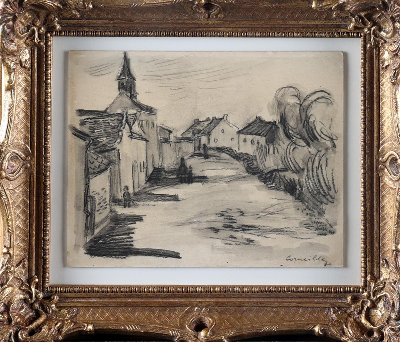 'Corneille', alias van Cornelis Guillaume van Beverloo, (1922- 2010), Dorpsgezicht met personen, houtskooltekening, 17,5 x 22 cm.