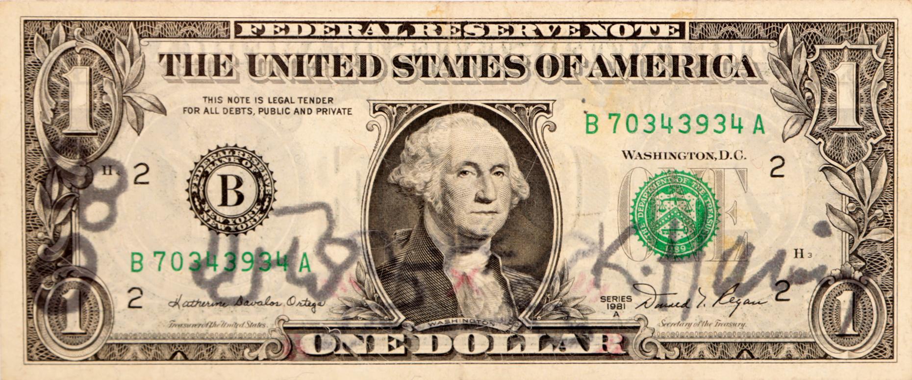 Keith Haring (1958 - 1990), One dollar met tekeningen en signatuur van de kunstenaar in een plexiglazen houder, inclusief echtheidscertificaat door Arte Vista
