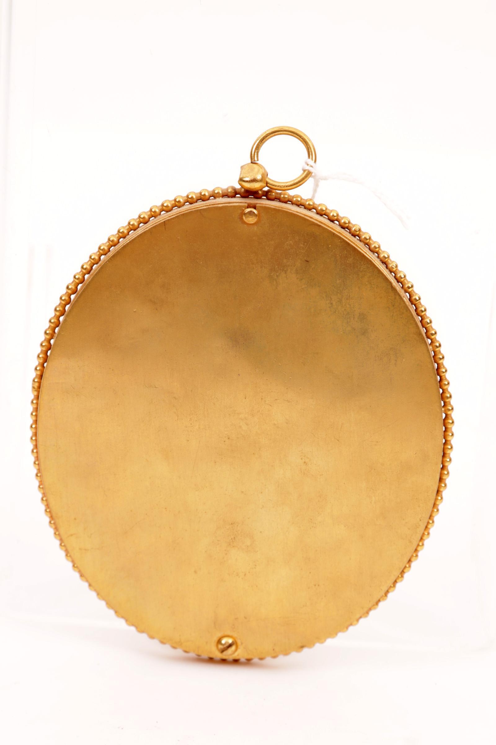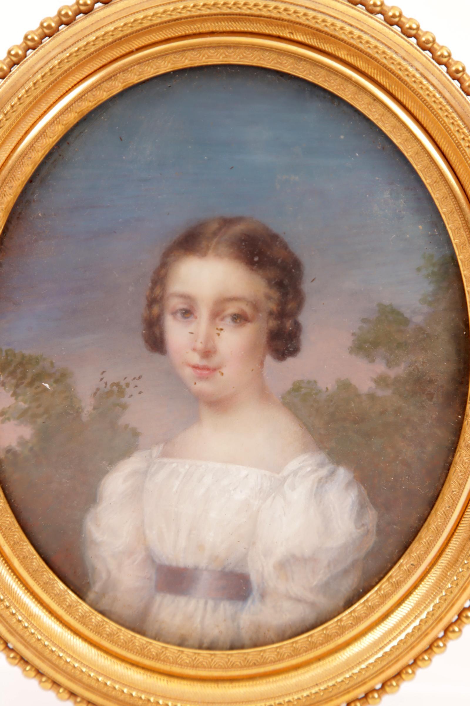 Antiek portretminiatuur van een meisje met jurk in koperen ovaal lijstje, 13 x 10 cm.