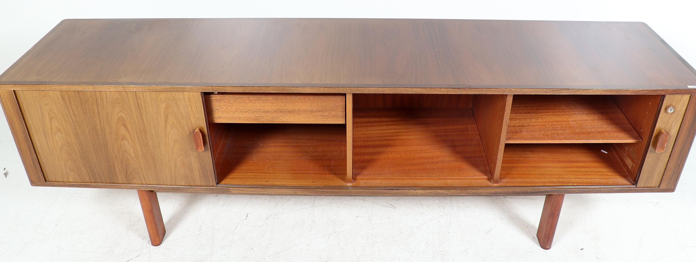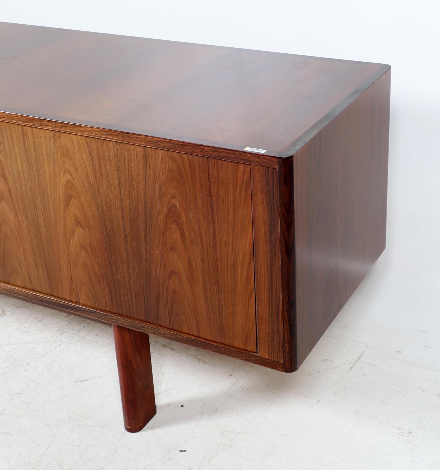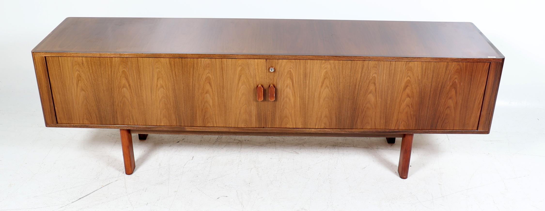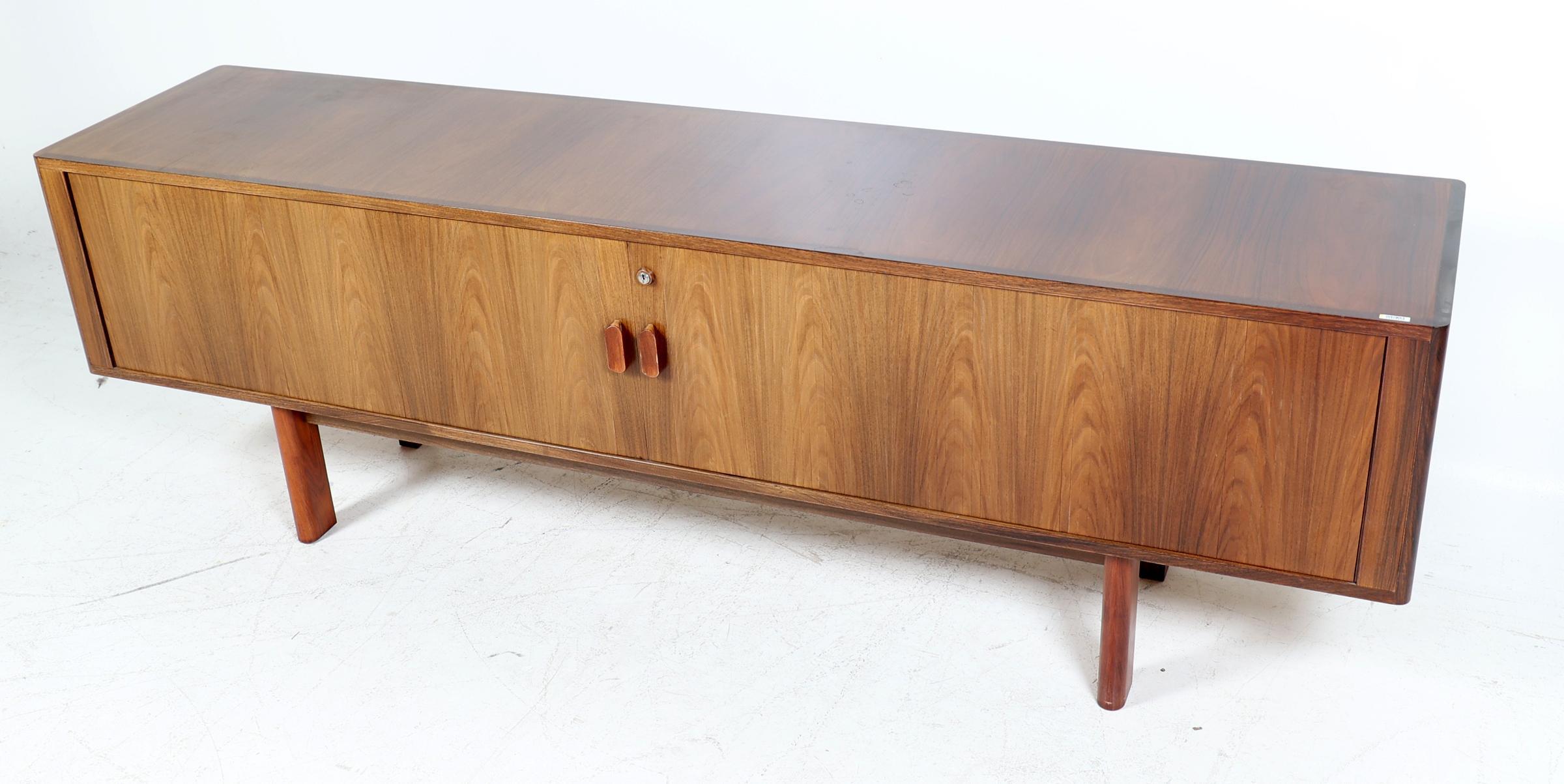 Deens palissanderhouten Deens vintage design dressoir met jaloeziedieren, h.64 x b.203 x d.46 cm.