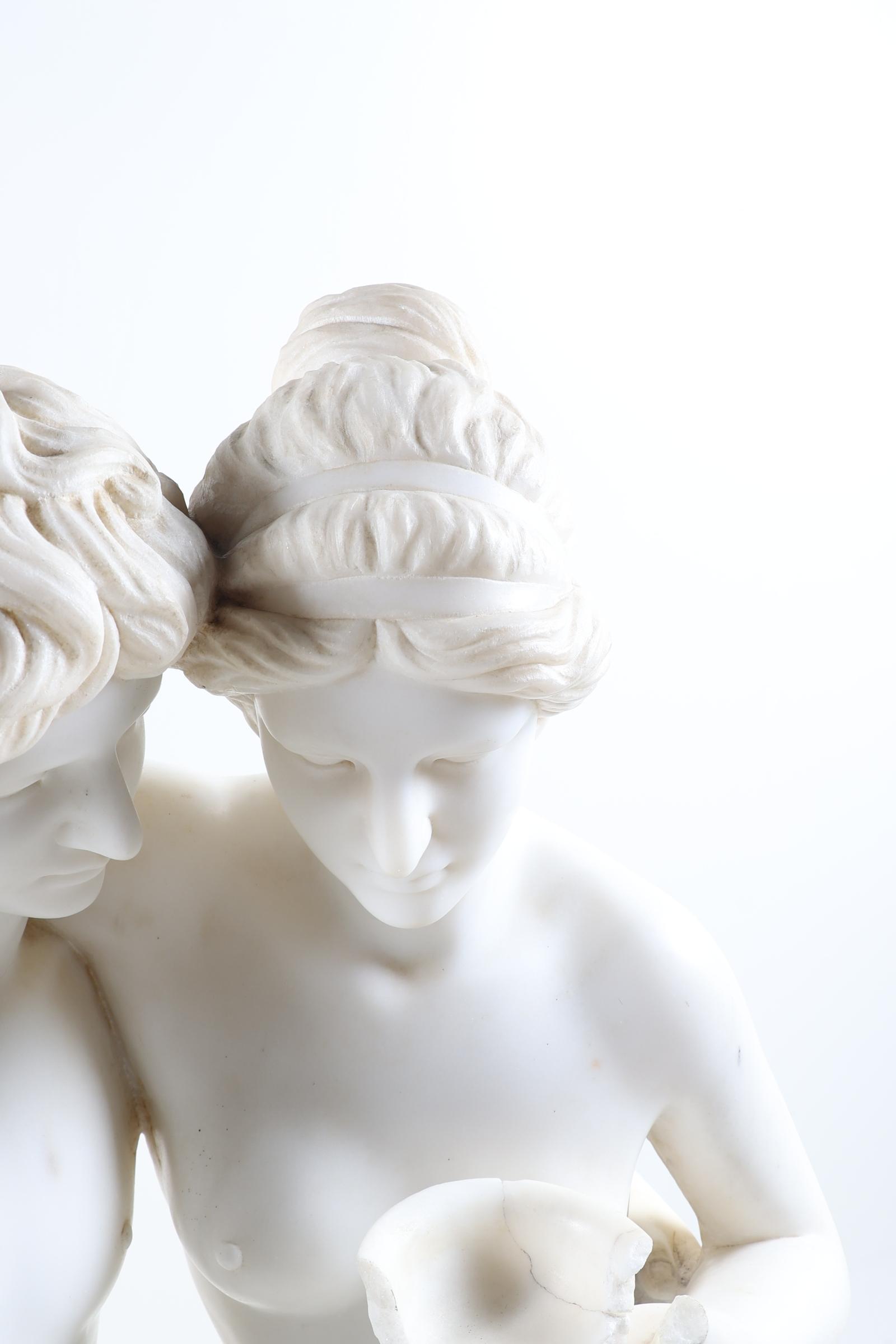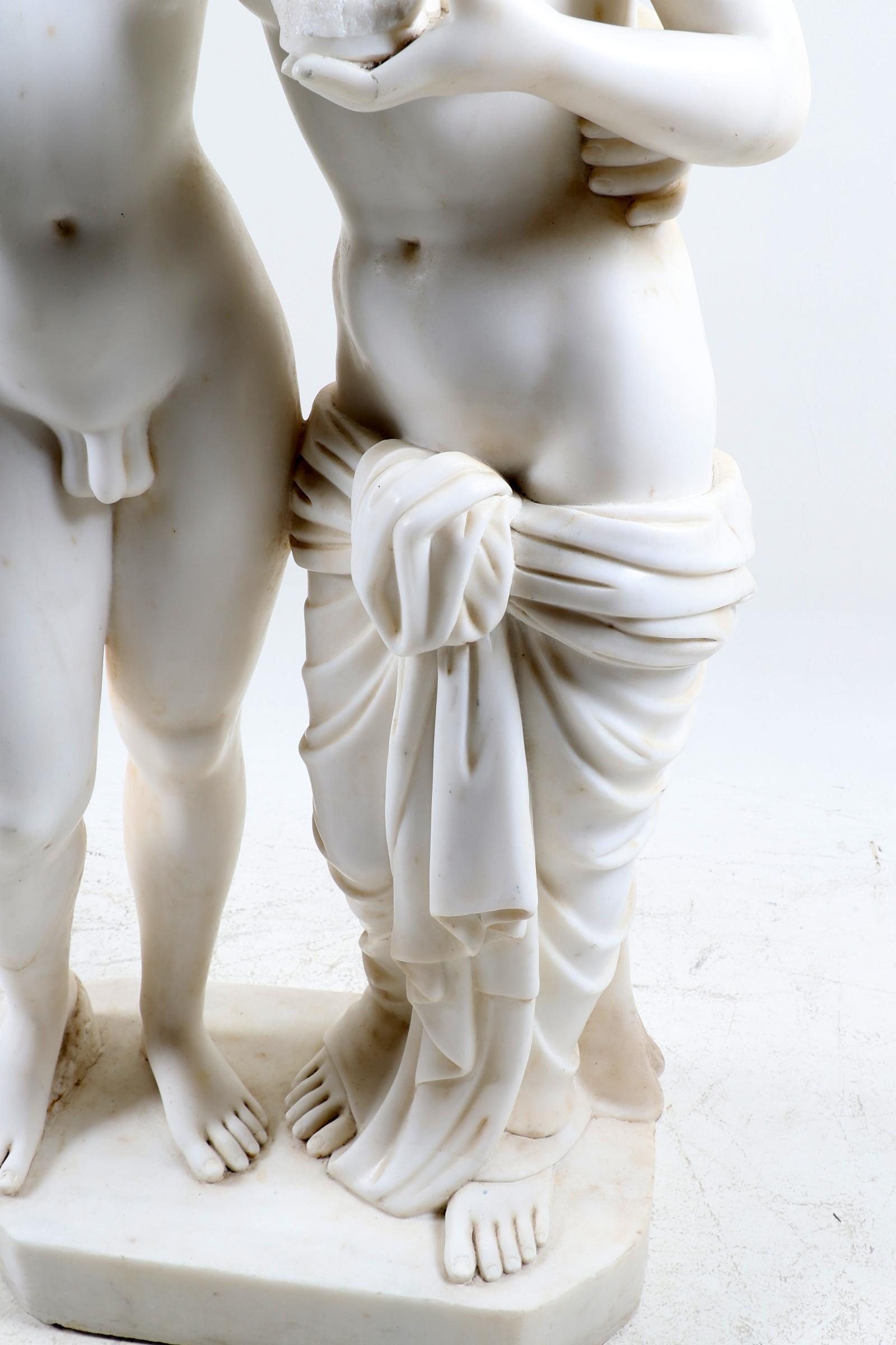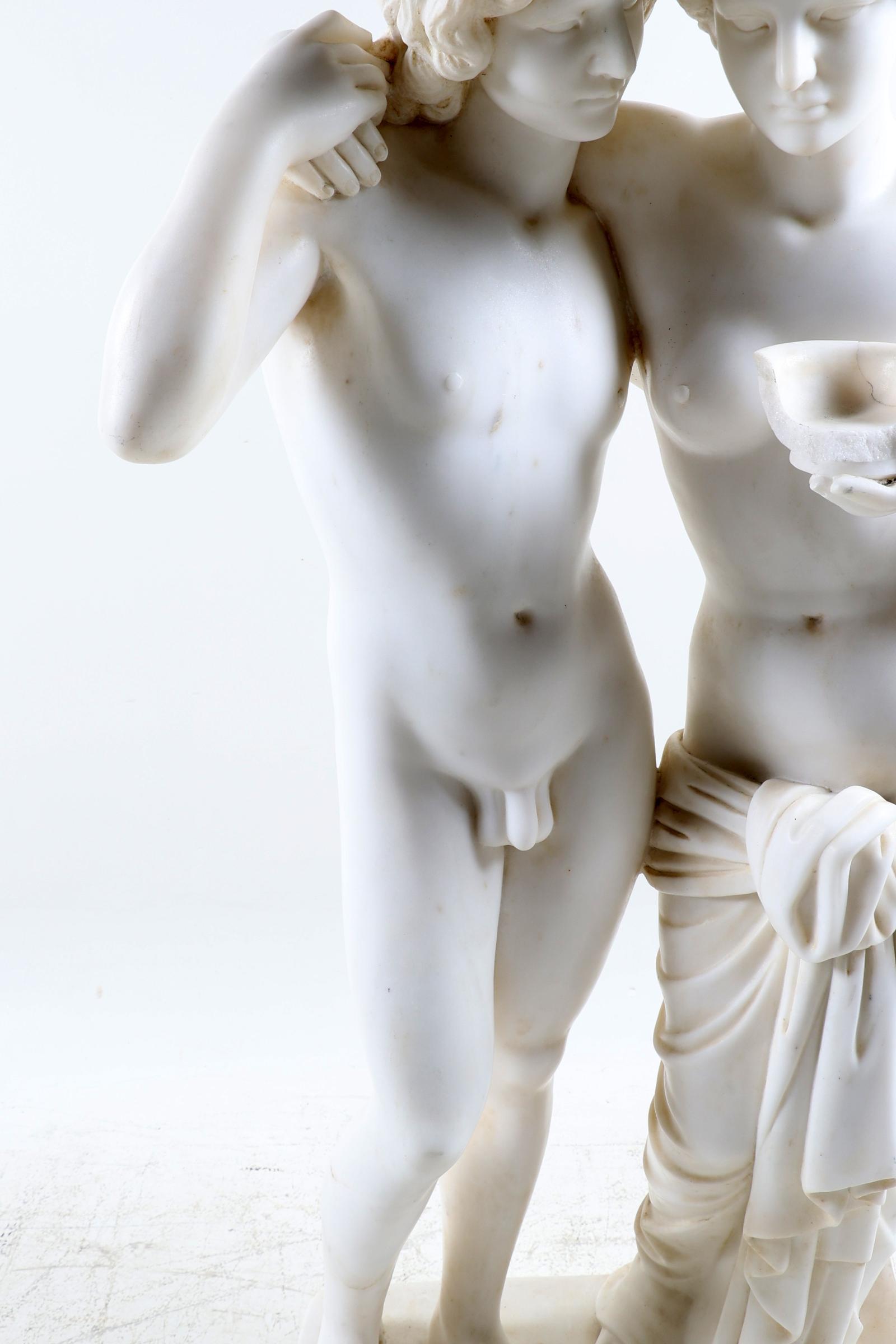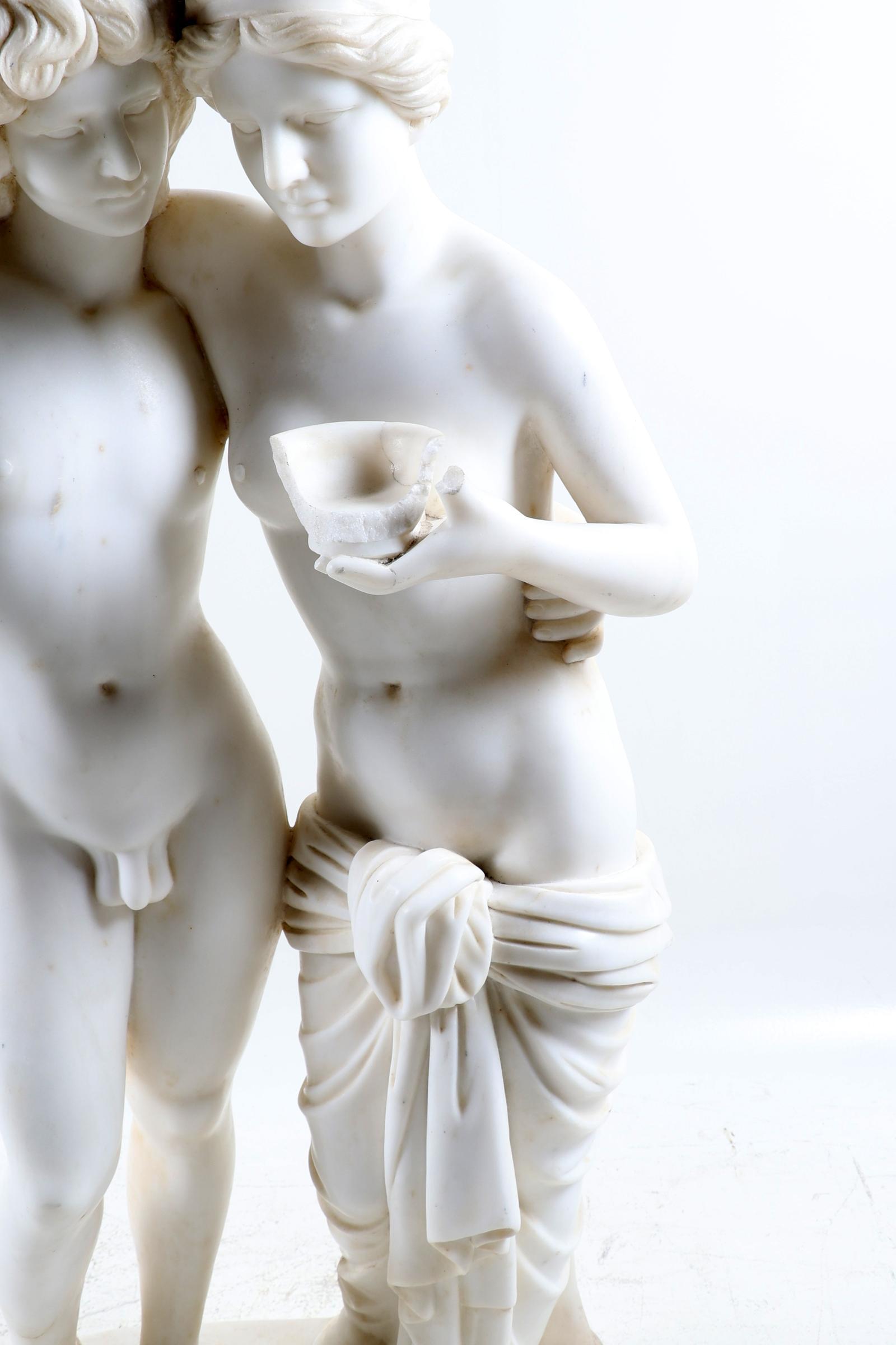 Handgekapt wit marmeren beeldengroep van man en vrouw, h.134 cm. (kleine defect aan vinger en schaal)