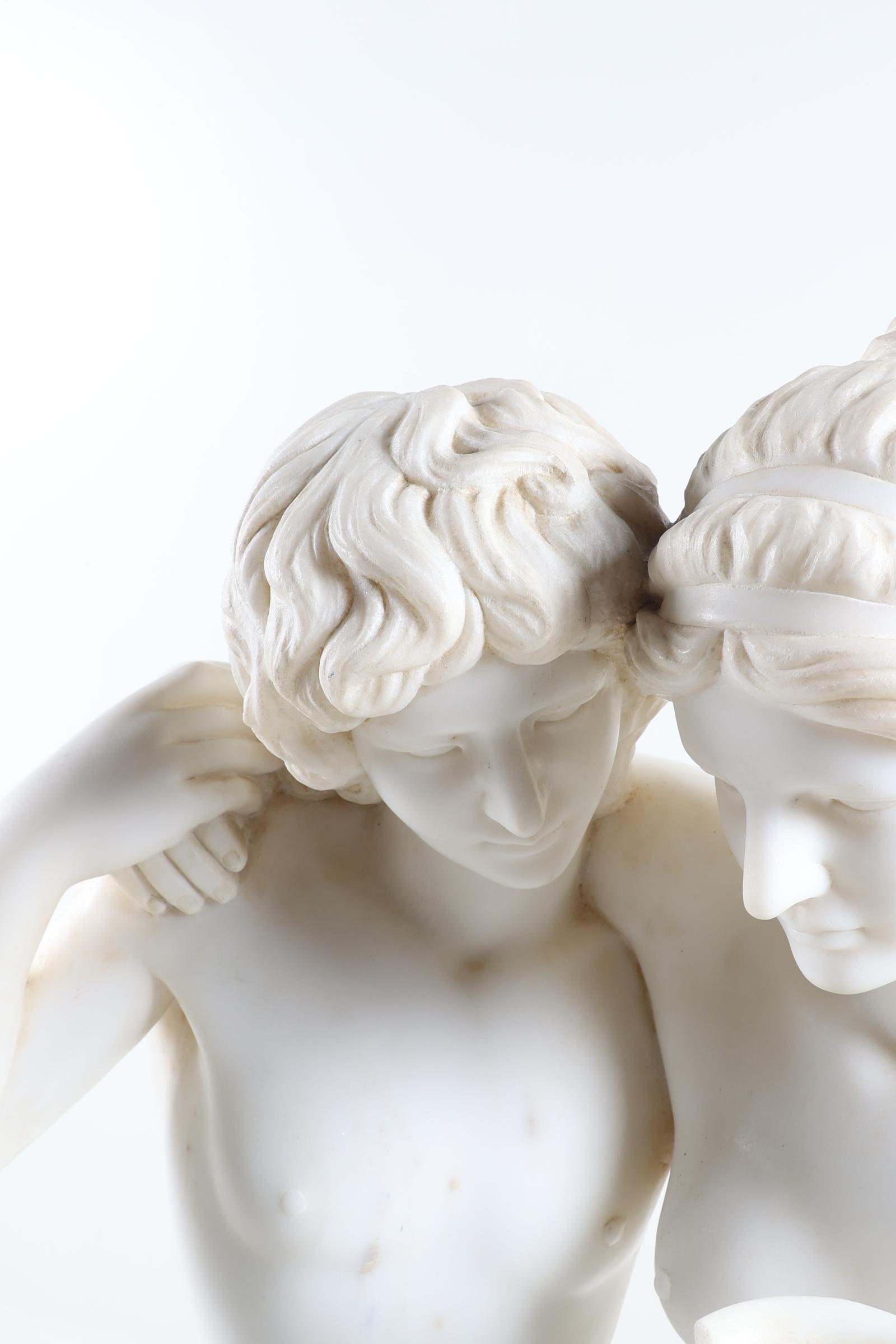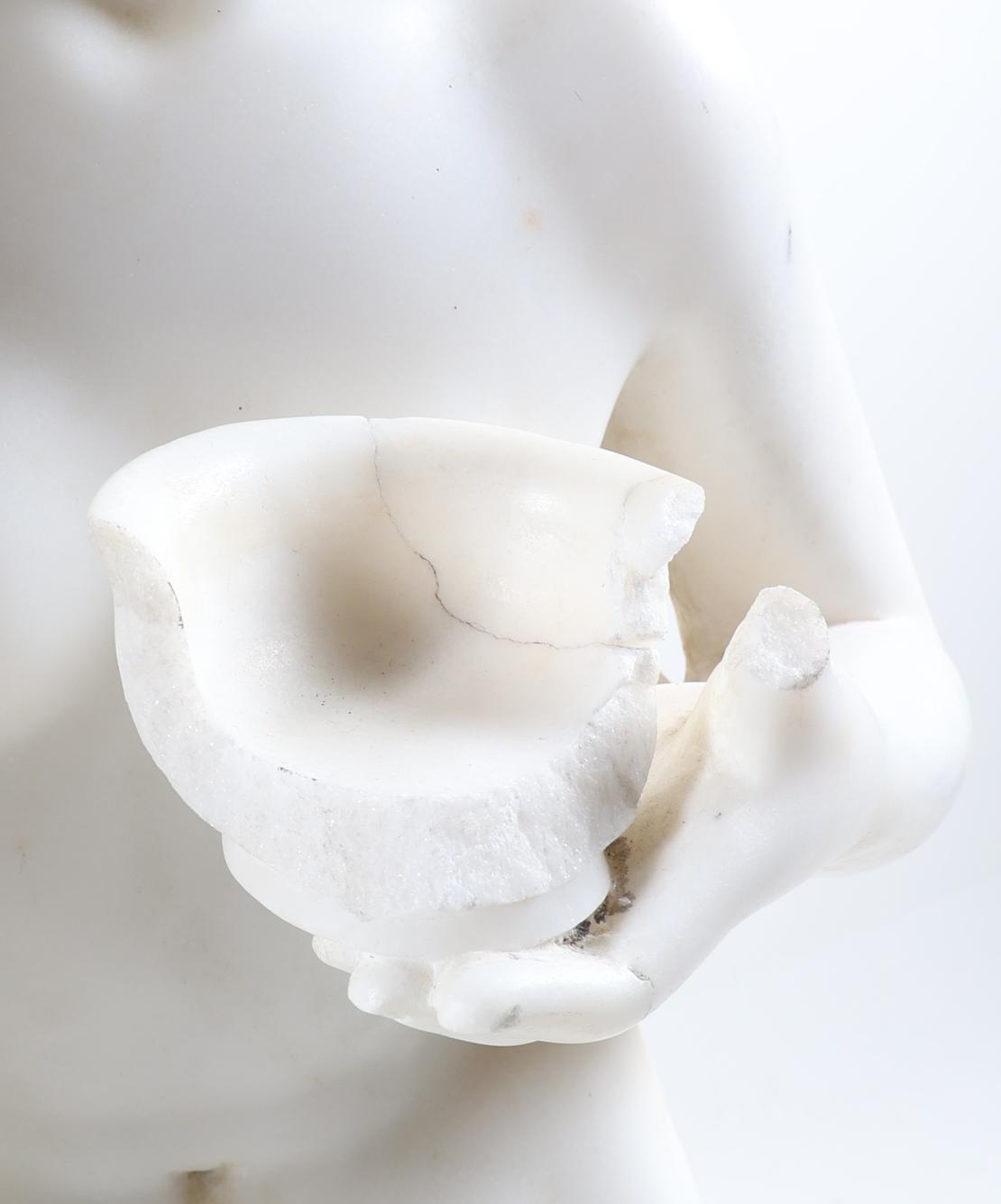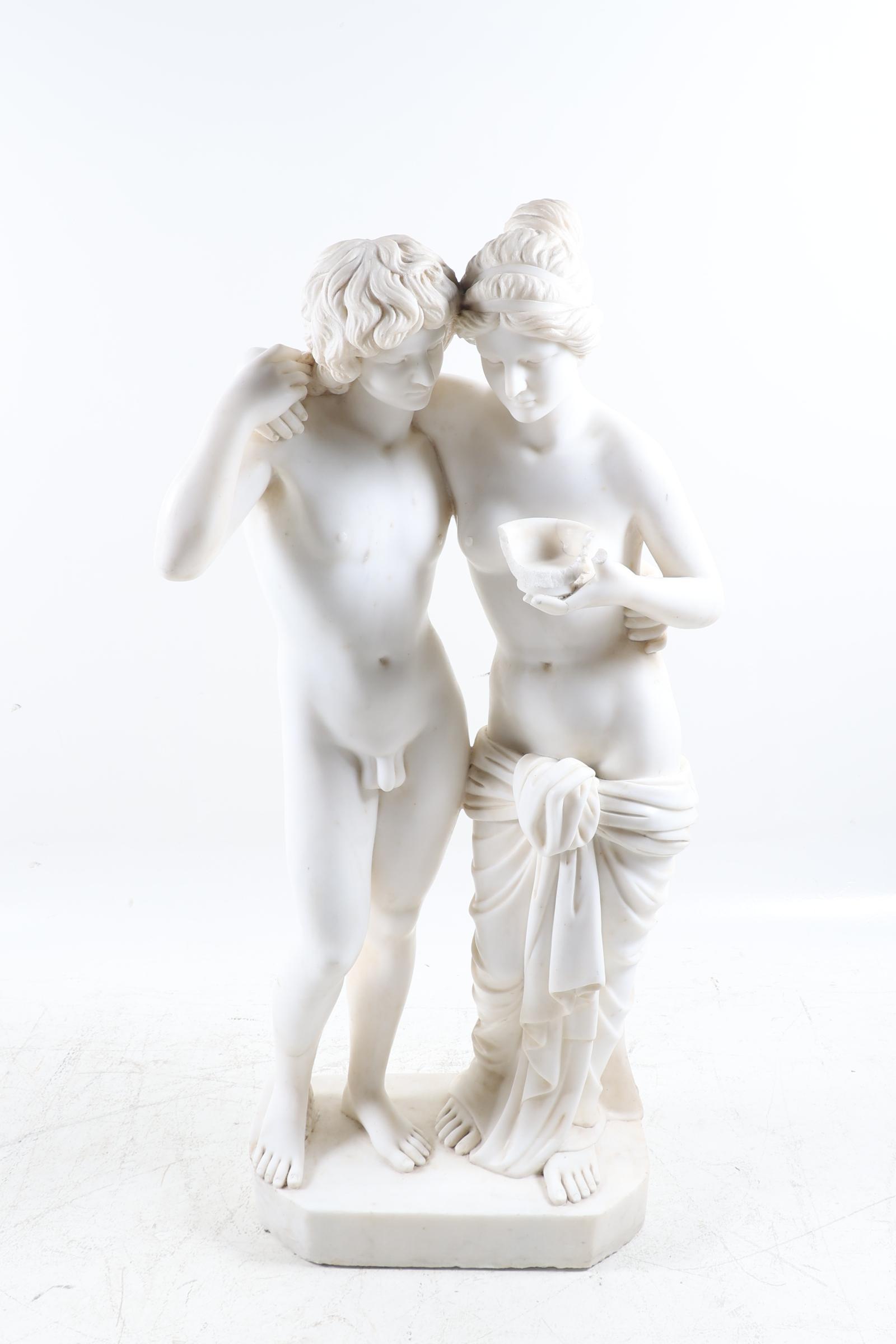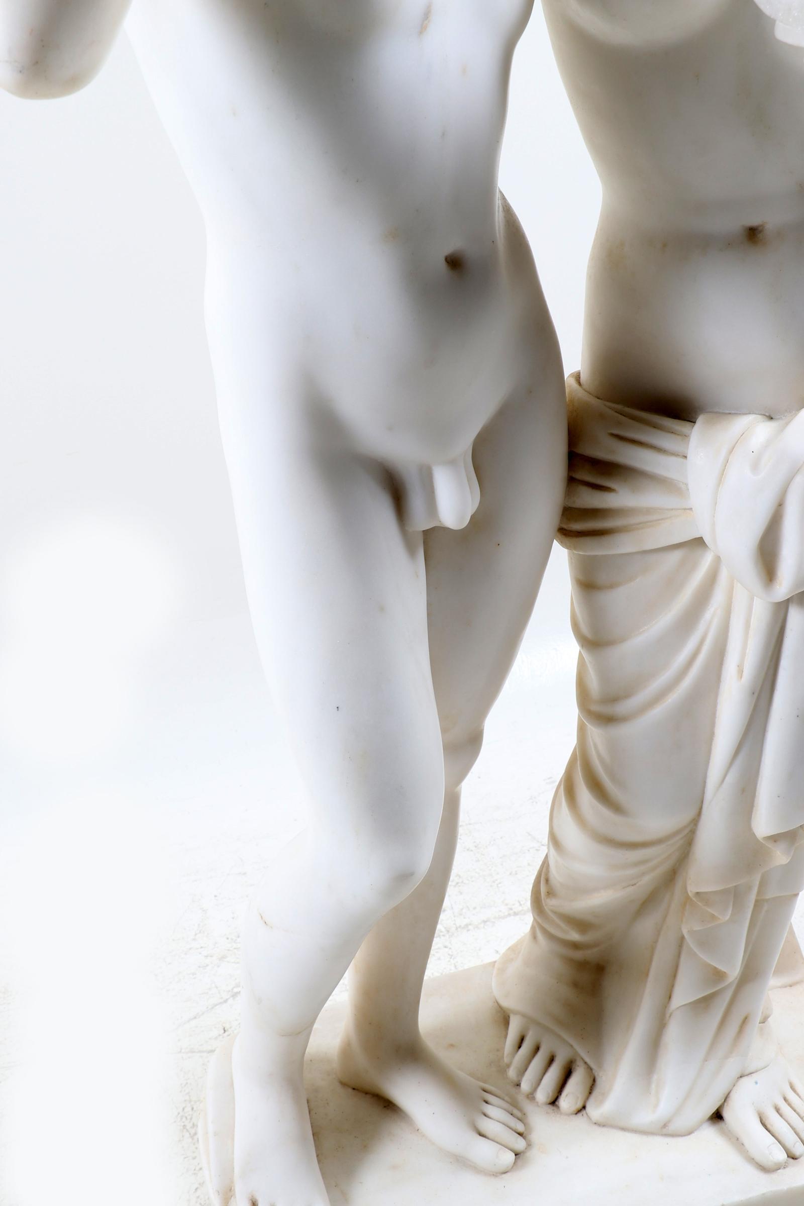 Handgekapt wit marmeren beeldengroep van man en vrouw, h.134 cm. (kleine defect aan vinger en schaal)