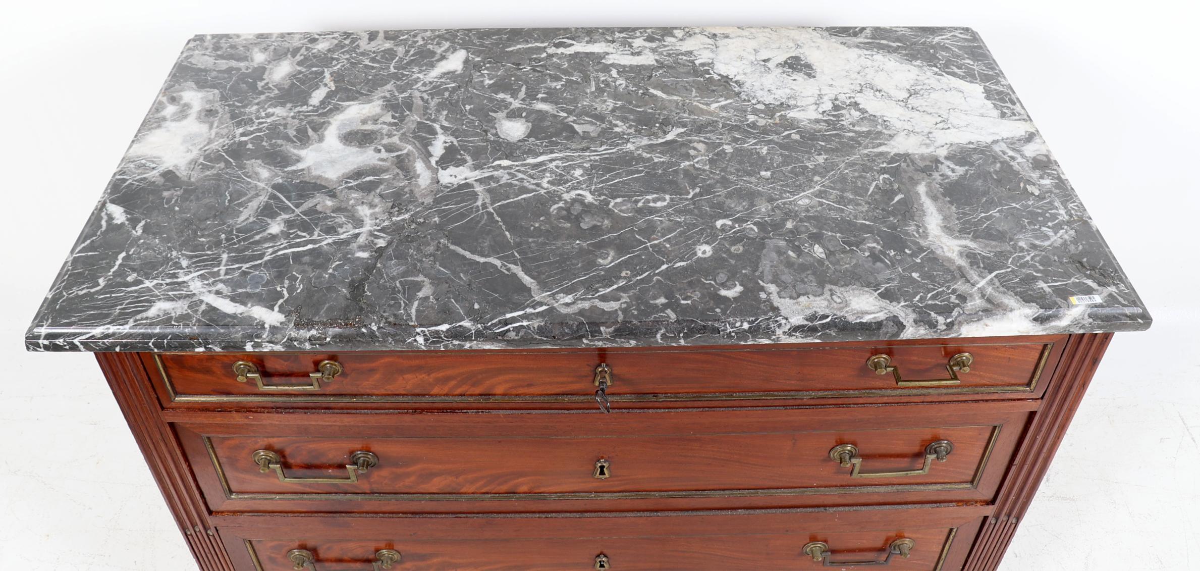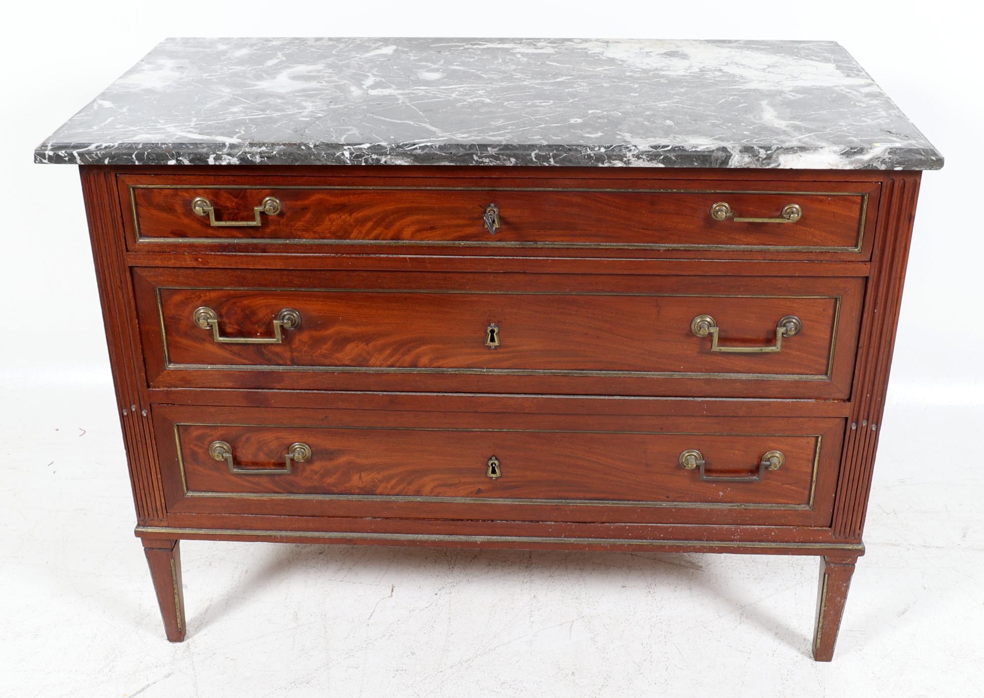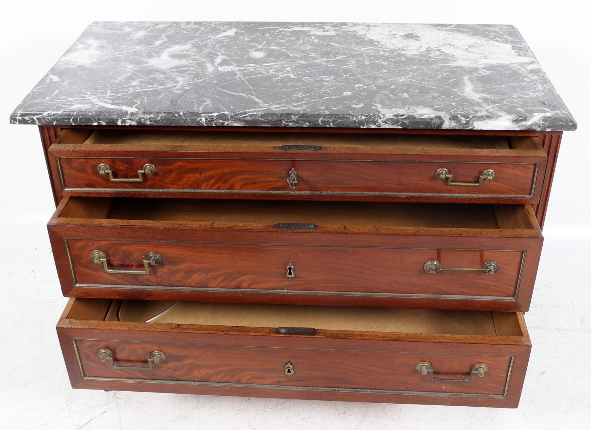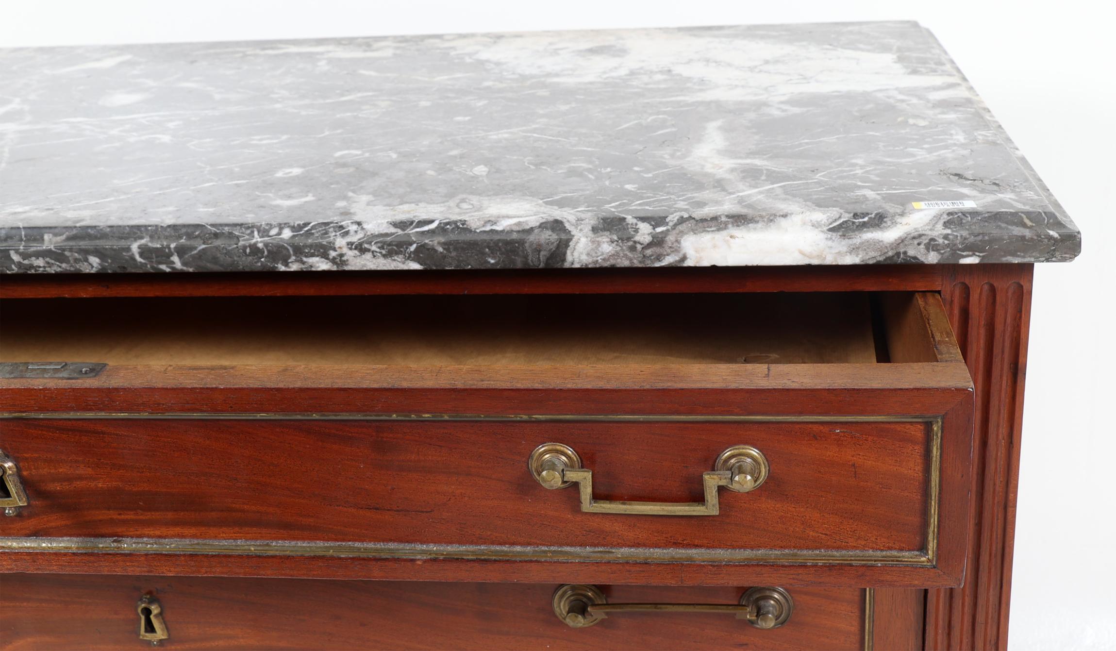 Antieke mahoniehouten met brons afgezet directoire 3-laden commode afgedekt met grijs marmeren blad, h.85 x b.114 x 57 cm.