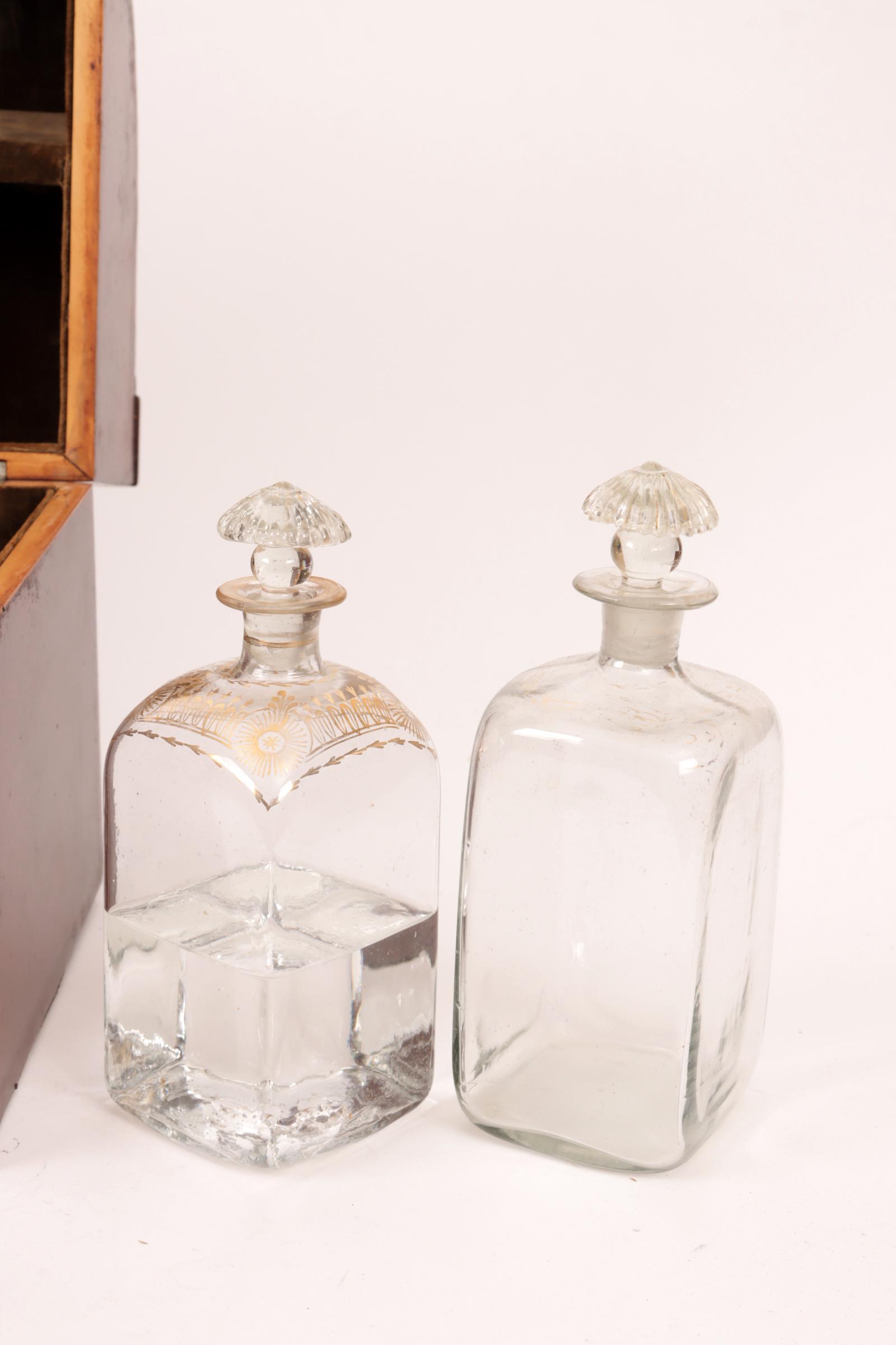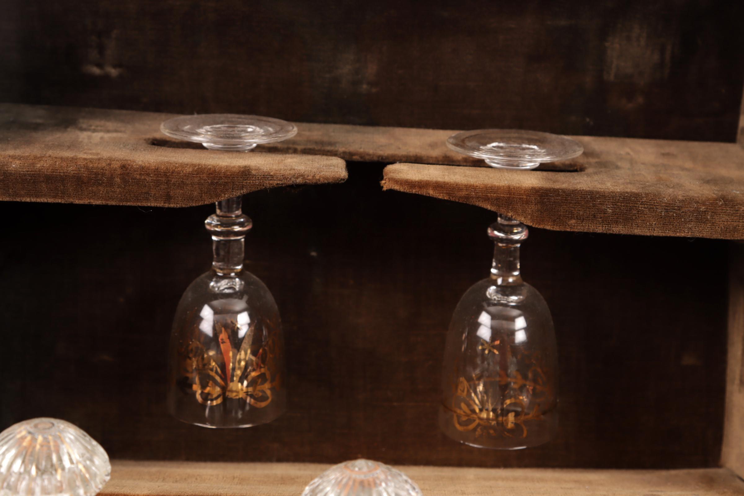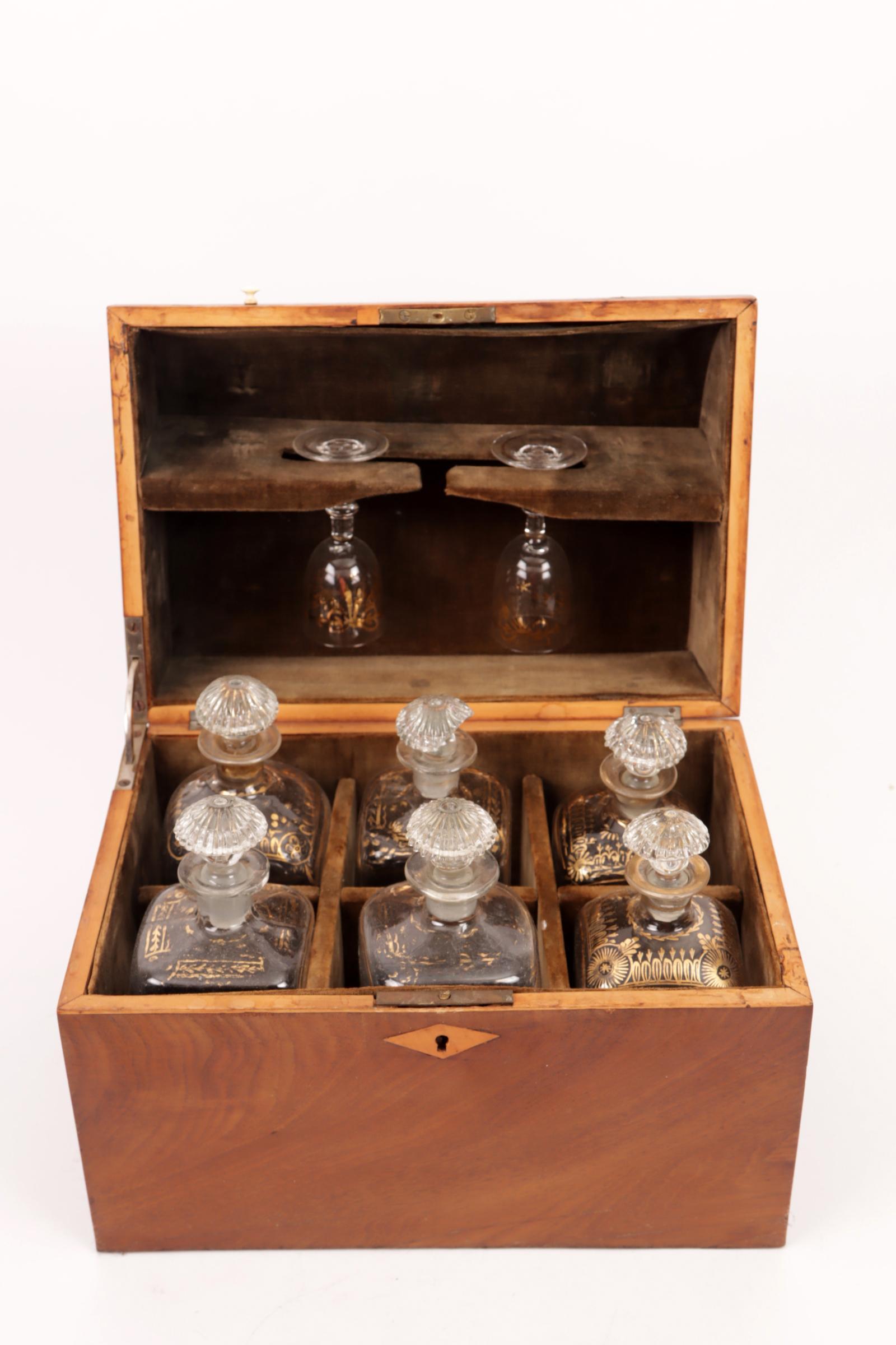 Antieke mahoniehouten Empire likeurkelder met inhoud van 6 originele karaffen en 2 glaasjes (slotje defect)