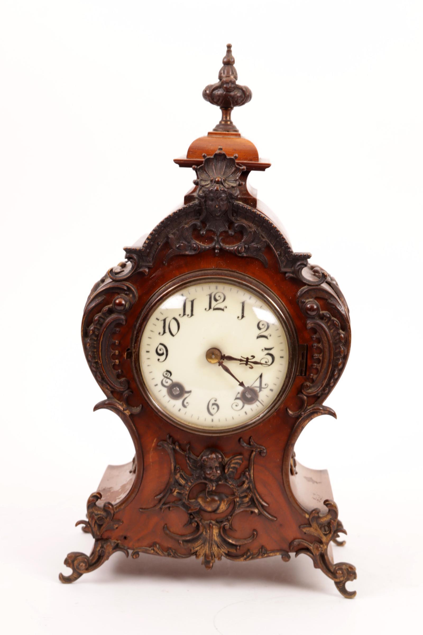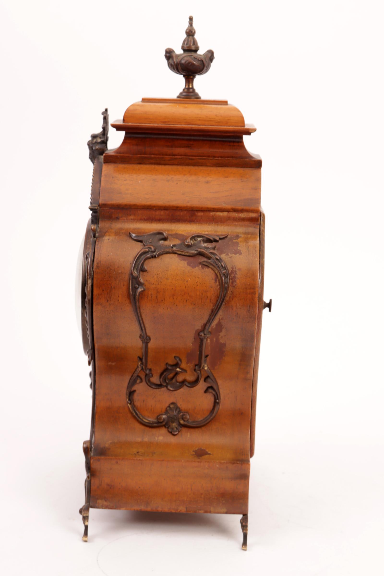 Antieke rijkbewerkte notenhouten tafelklok, h.30 cm.