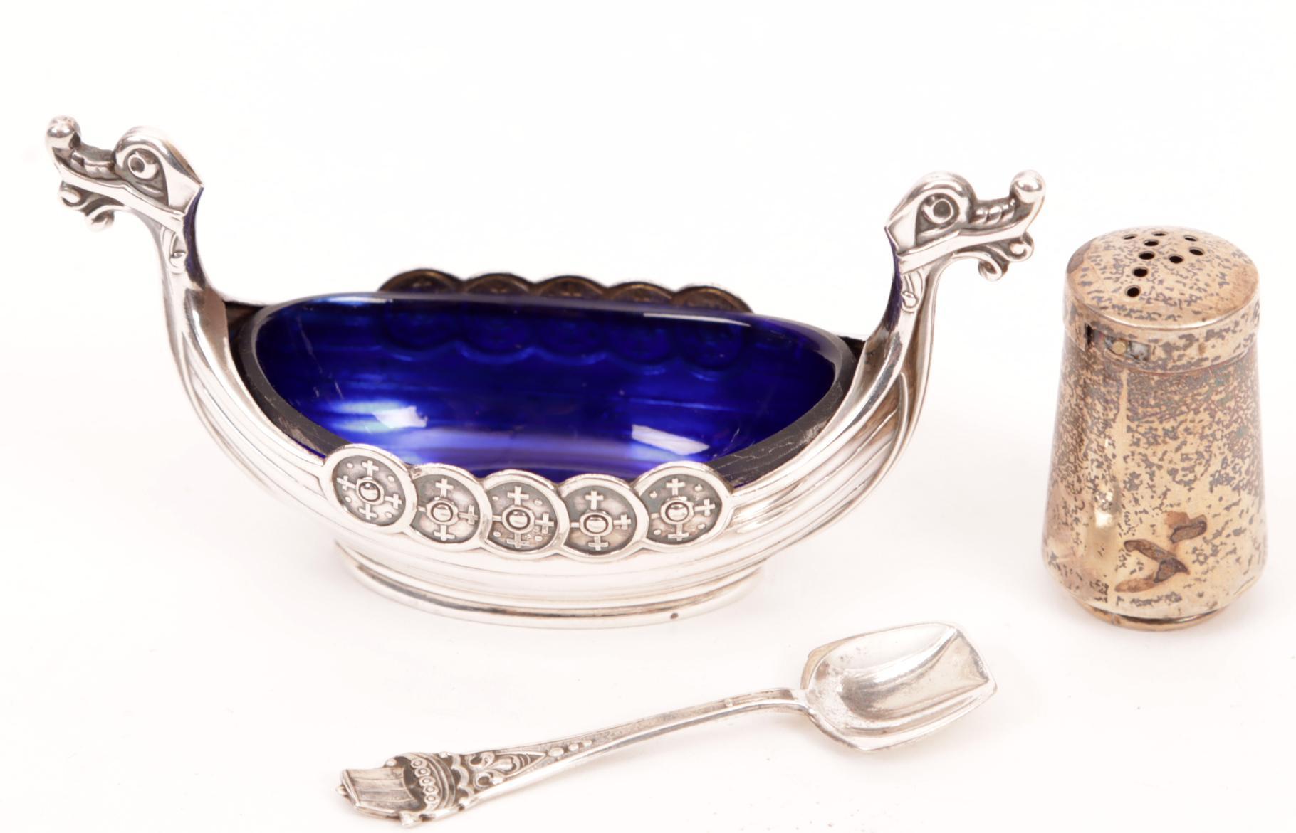 Koopje van een zoutvaatje i.v.v. vikingschip met blauw glazen inleg met lepeltje en een zilveren strooier