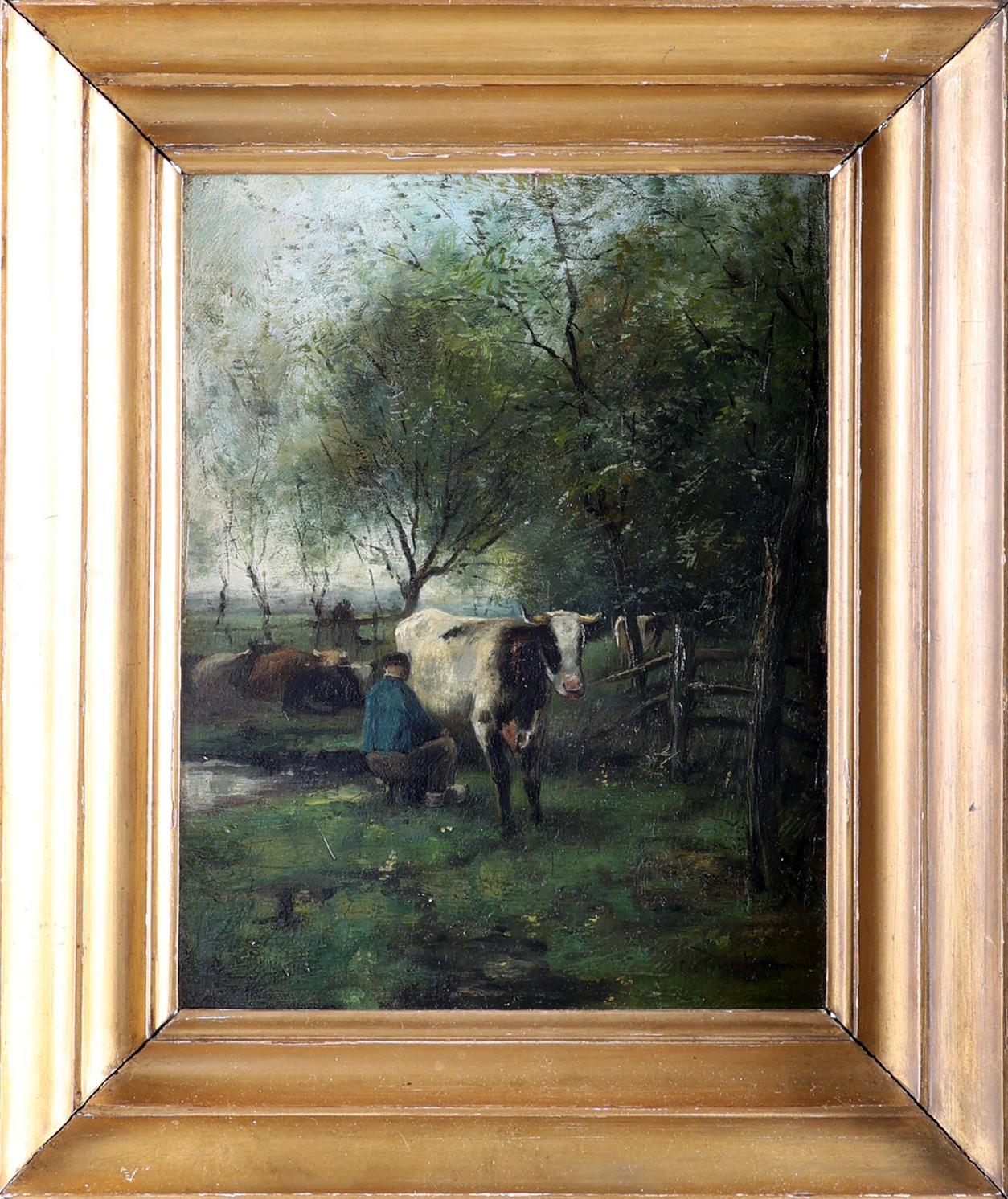 George Jan Hendrik (Geo) Poggenbeek (1853-1903), Melktijd, olieverf op paneel, 21 x 28 cm.