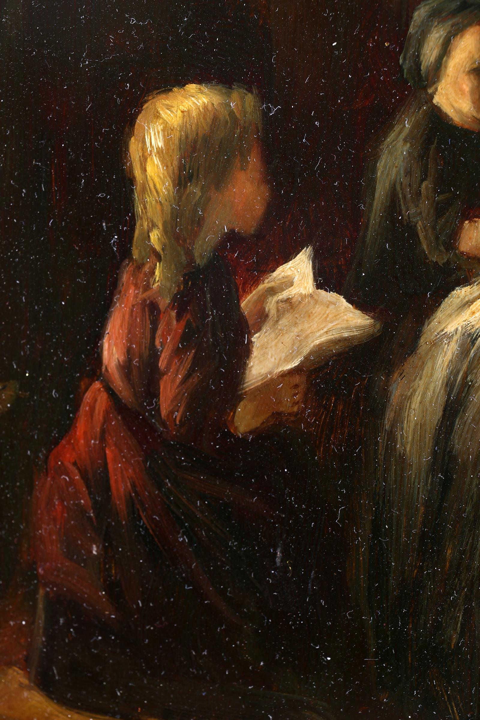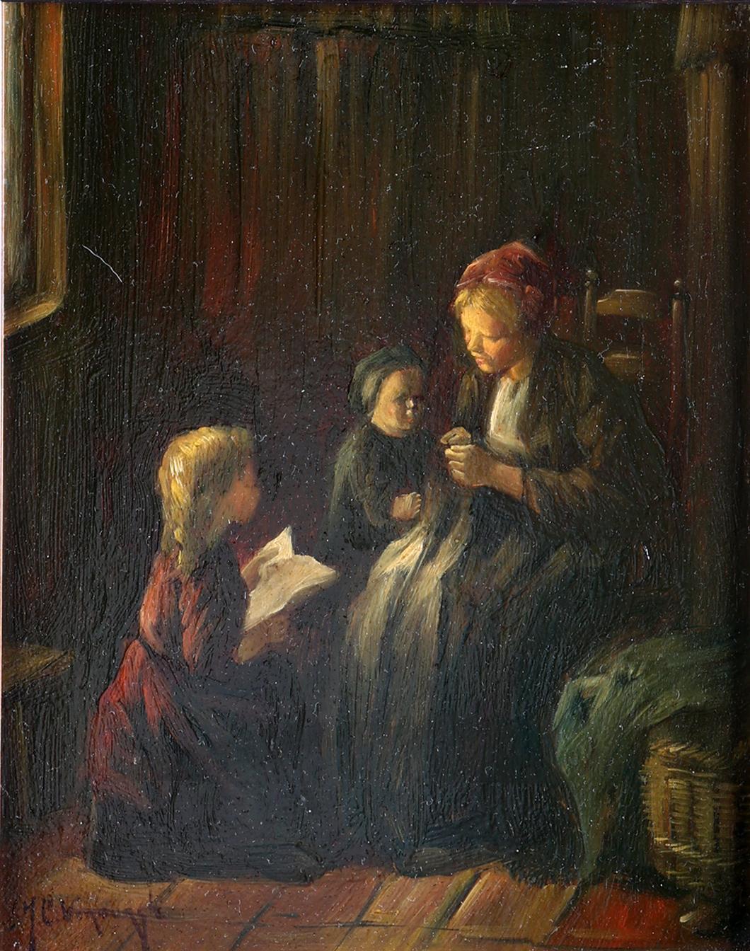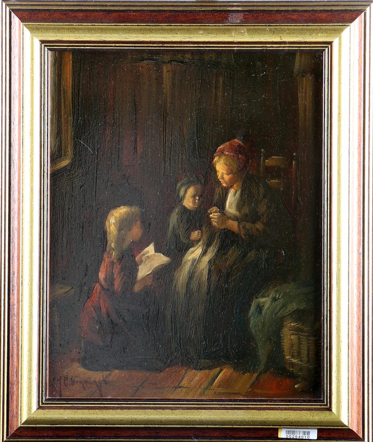 J.C. Verburg, Moeder met kinderen in interieur, olieverf op paneel, 24 x 30 cm.