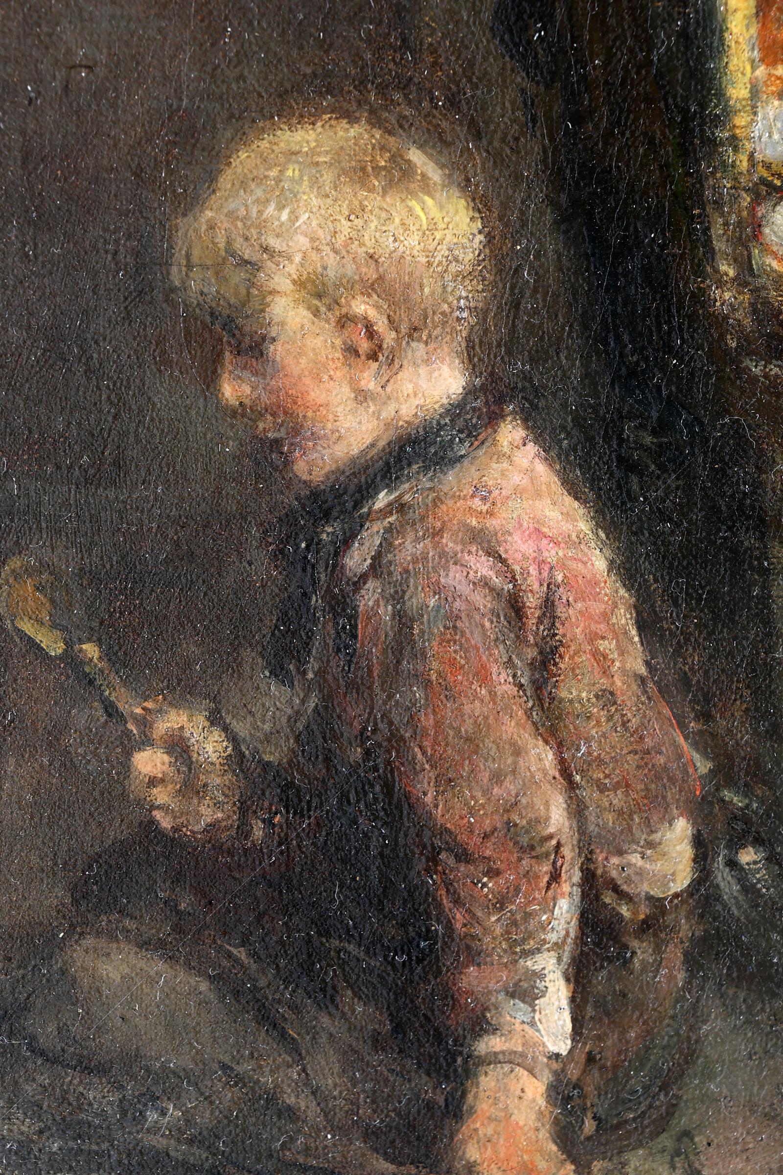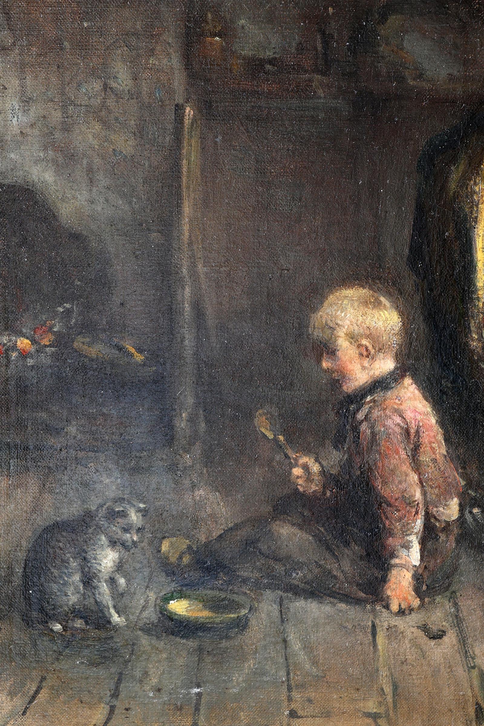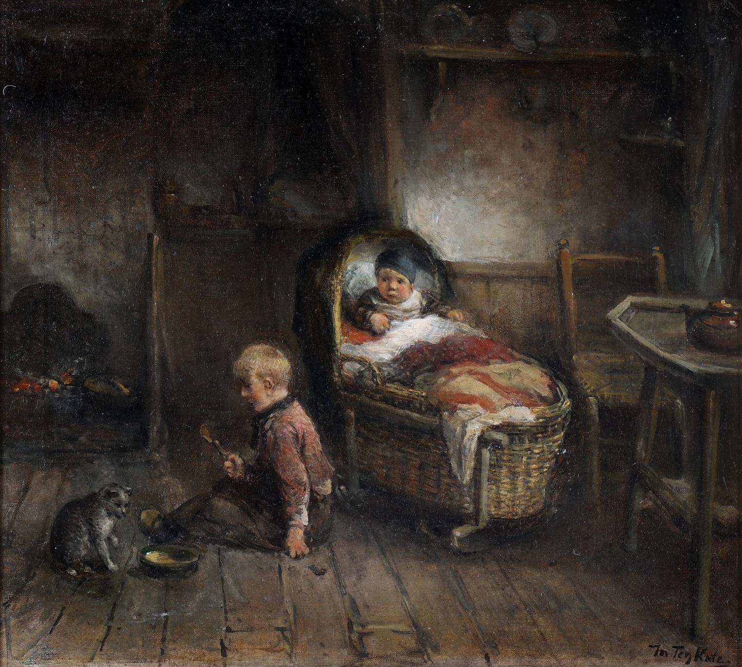 Johan Mari Henri ten Kate (1831-1910), Interieur met kat en baby in wieg, olieverf op doek, 43 x 47 cm.