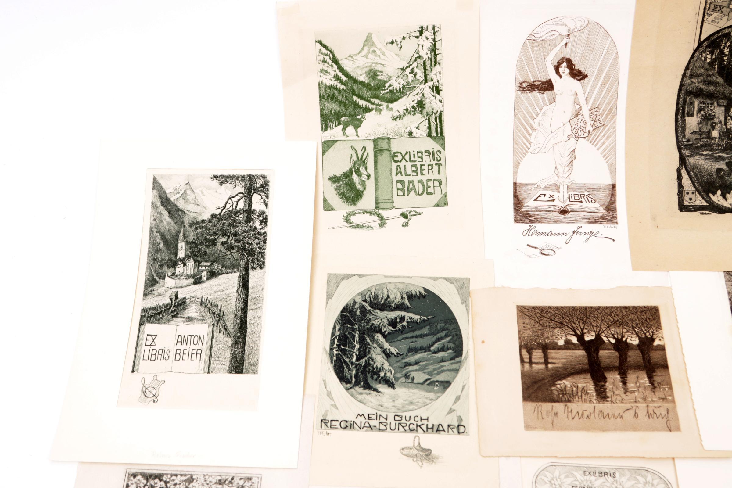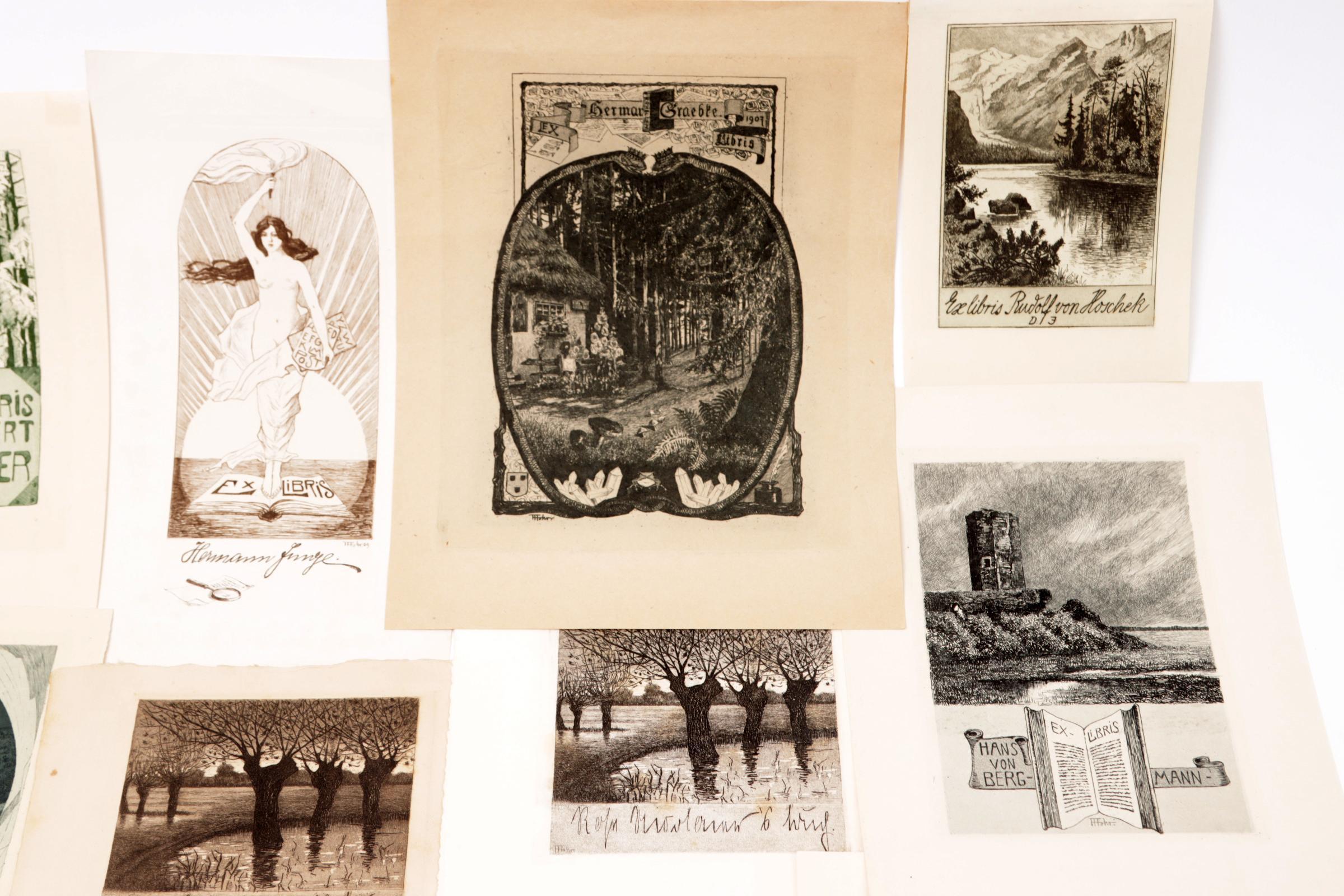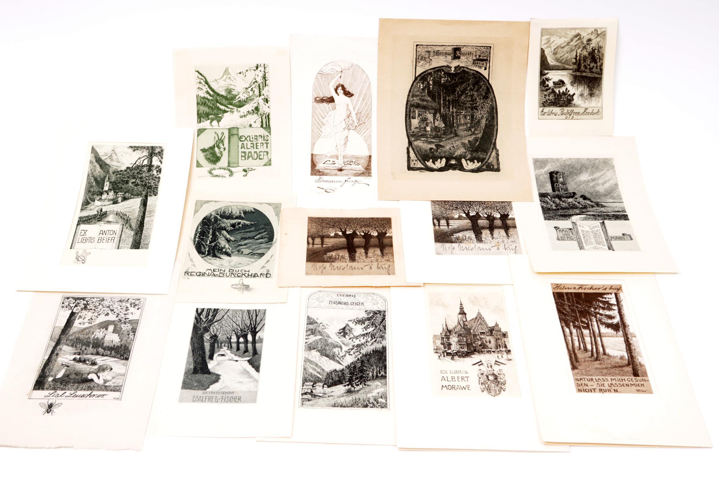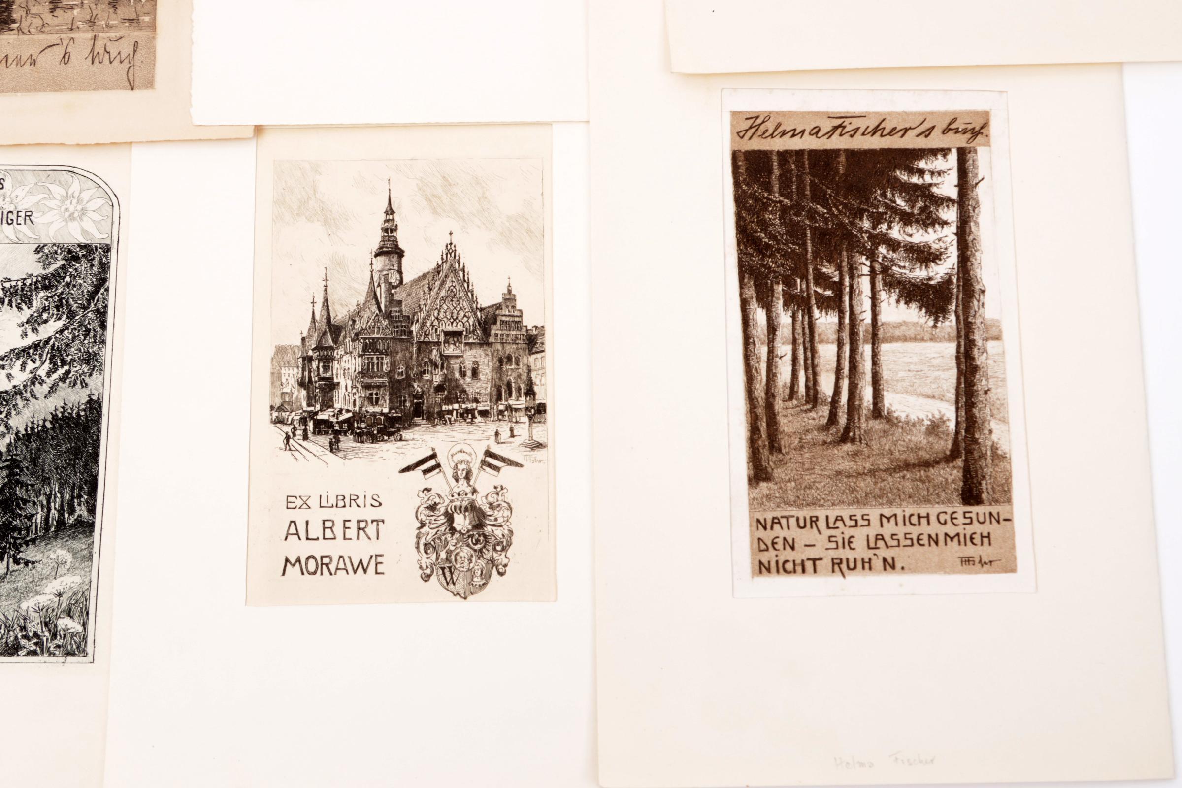 Fischer-Oels, H., 14 exlibris, C3, niet gesigneerd, deels opgeplakt (geweest). O.a. voor Anton Beier, Fischer-O., Leuschner, Burckhard, Morawe, Von Hoschek, Bergmann. Enkele met remarque.