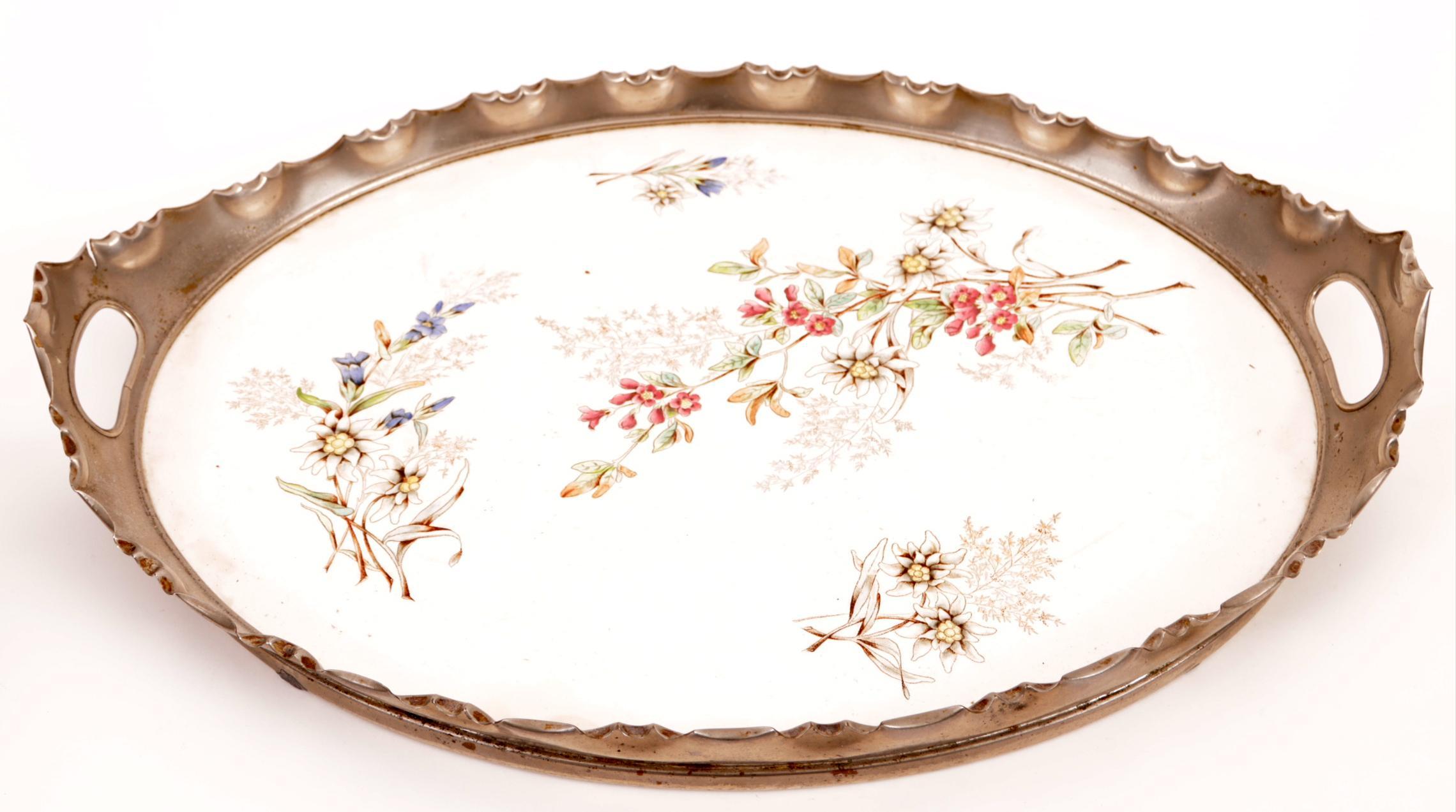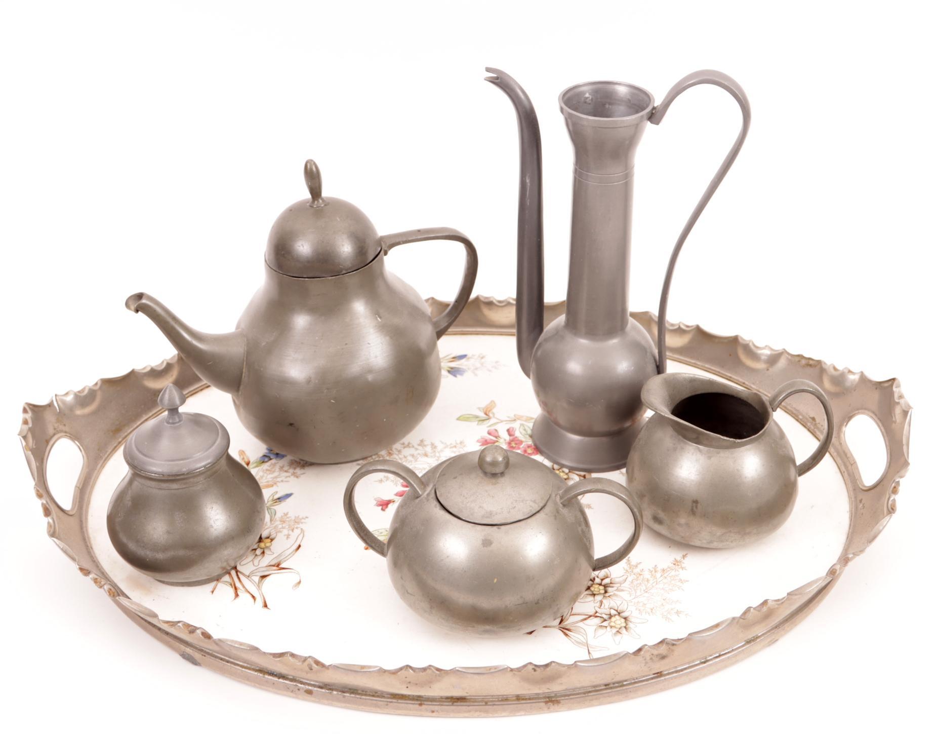 Koop diverse tinnen objecten en een aardewerken kuipdienblad met tinnen rand