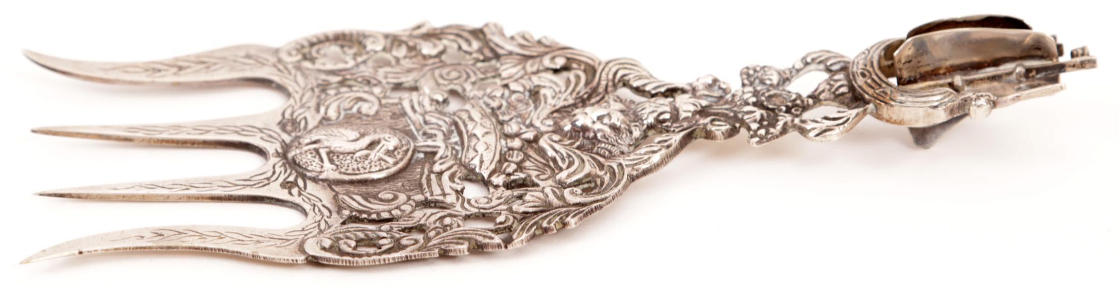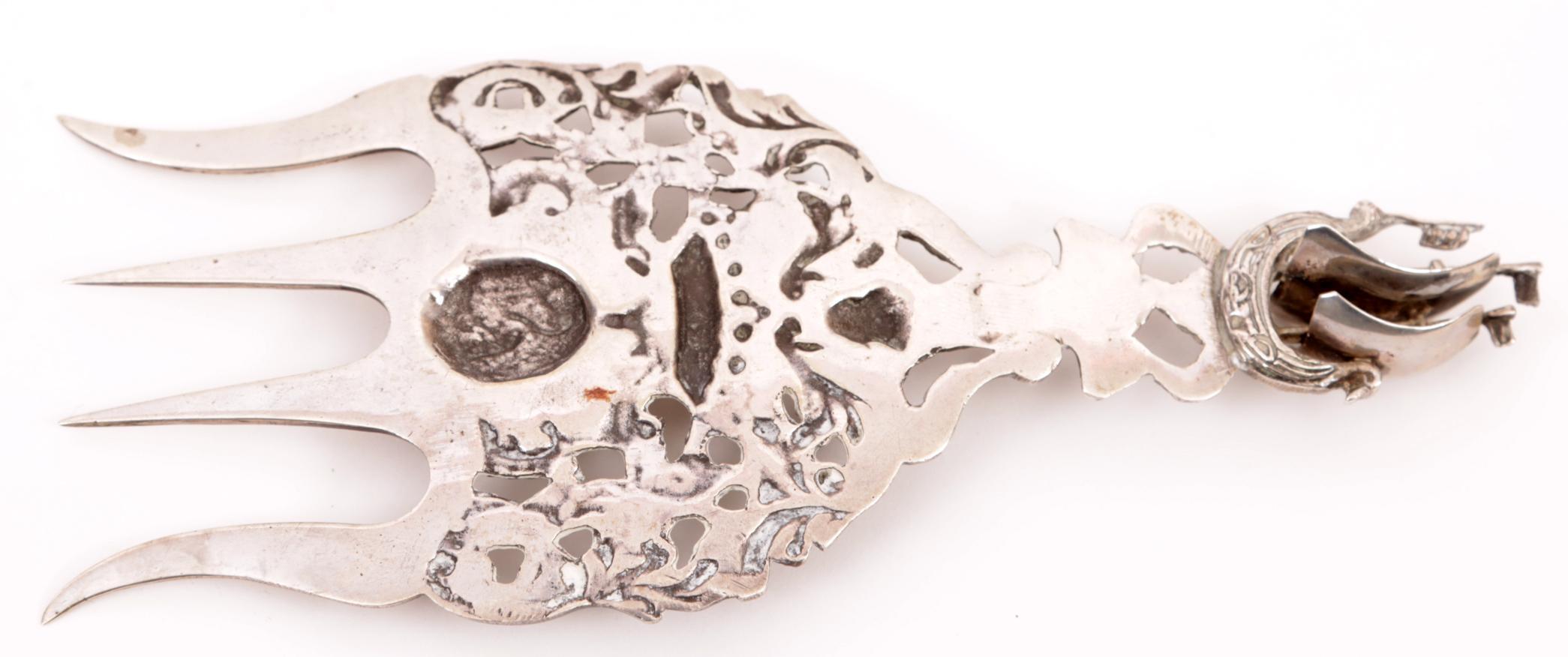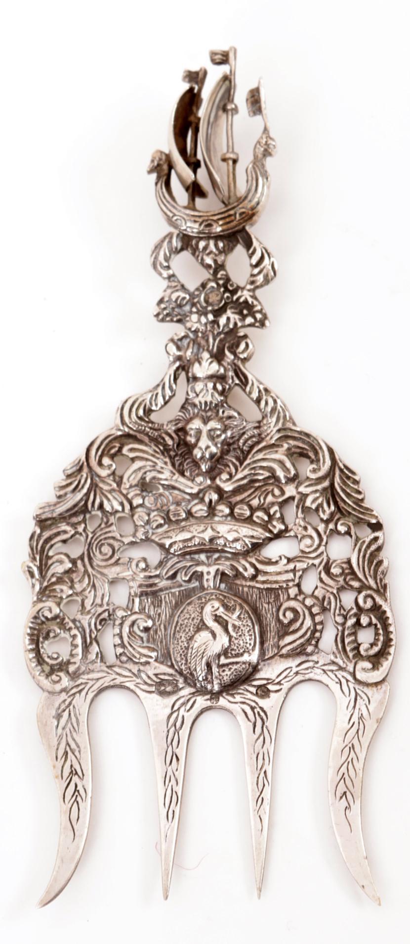 2e gehalte zilveren rijkbewerkte opdienvork met bovenop een schip, jaarletter P, 53 gram
