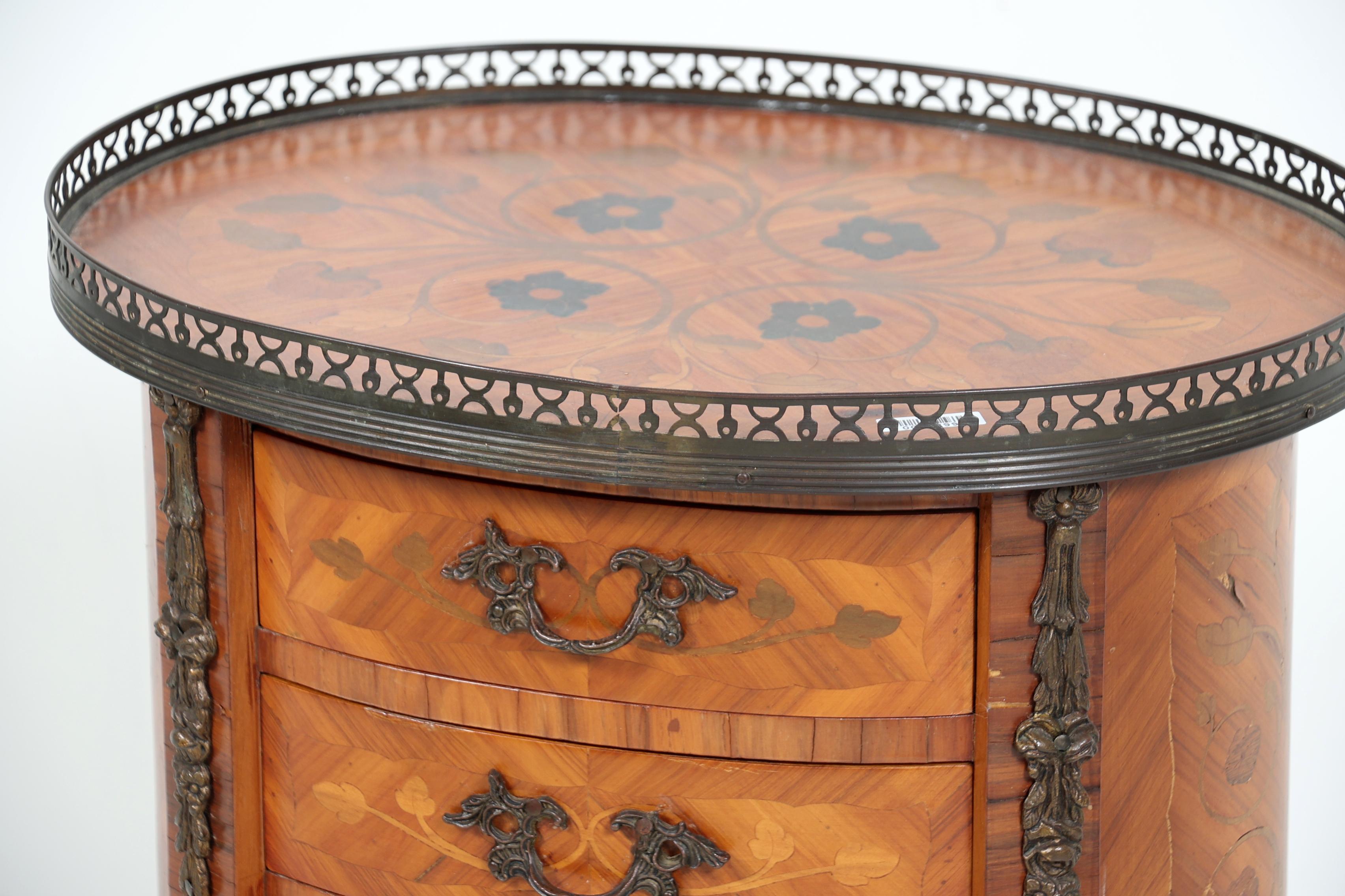 Oude met diverse houtsoorten belijmde bijzettafel met 3 laden, met florale motieven en afgewerkt met koperen beslag, h.74 x b.44 x d.32 cm.