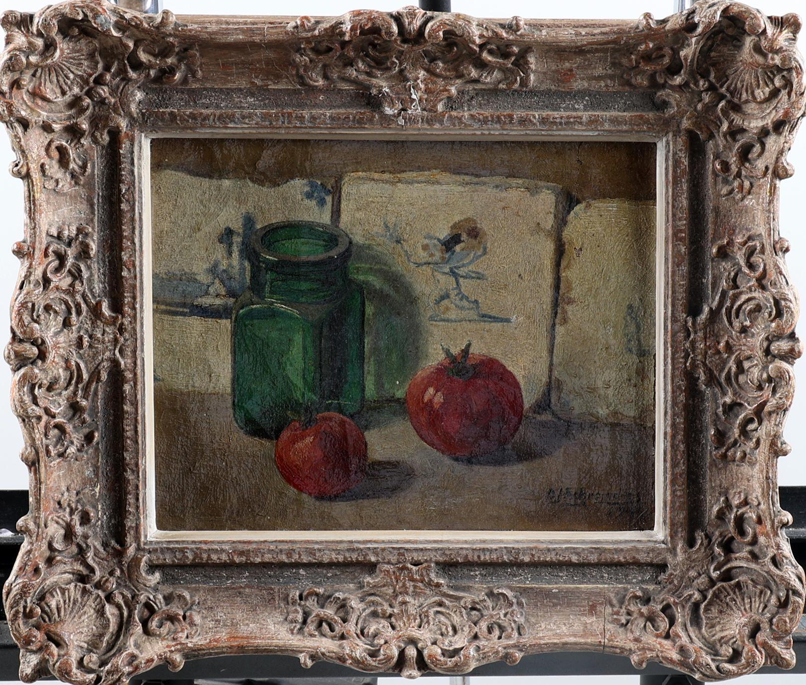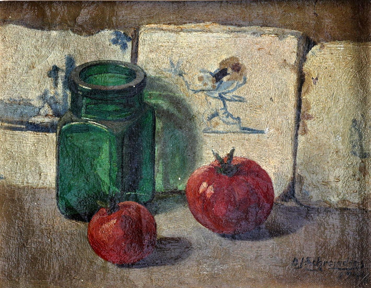 B.J. Schreinders, Stilleven met tomaat en tegeltjes, olieverf op doek, gedateerd 1944, 23 x 29 cm.