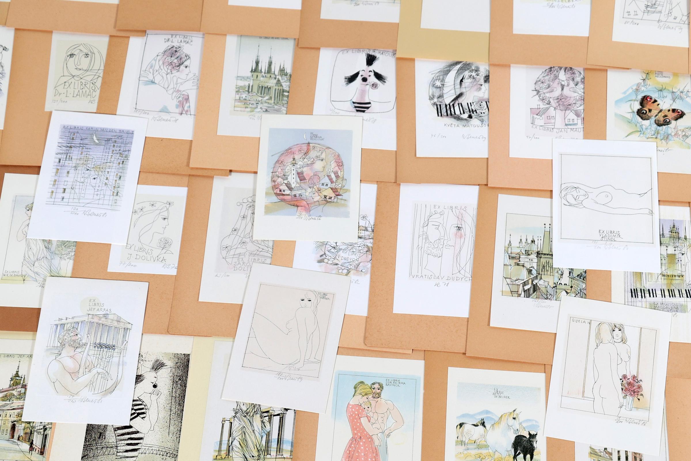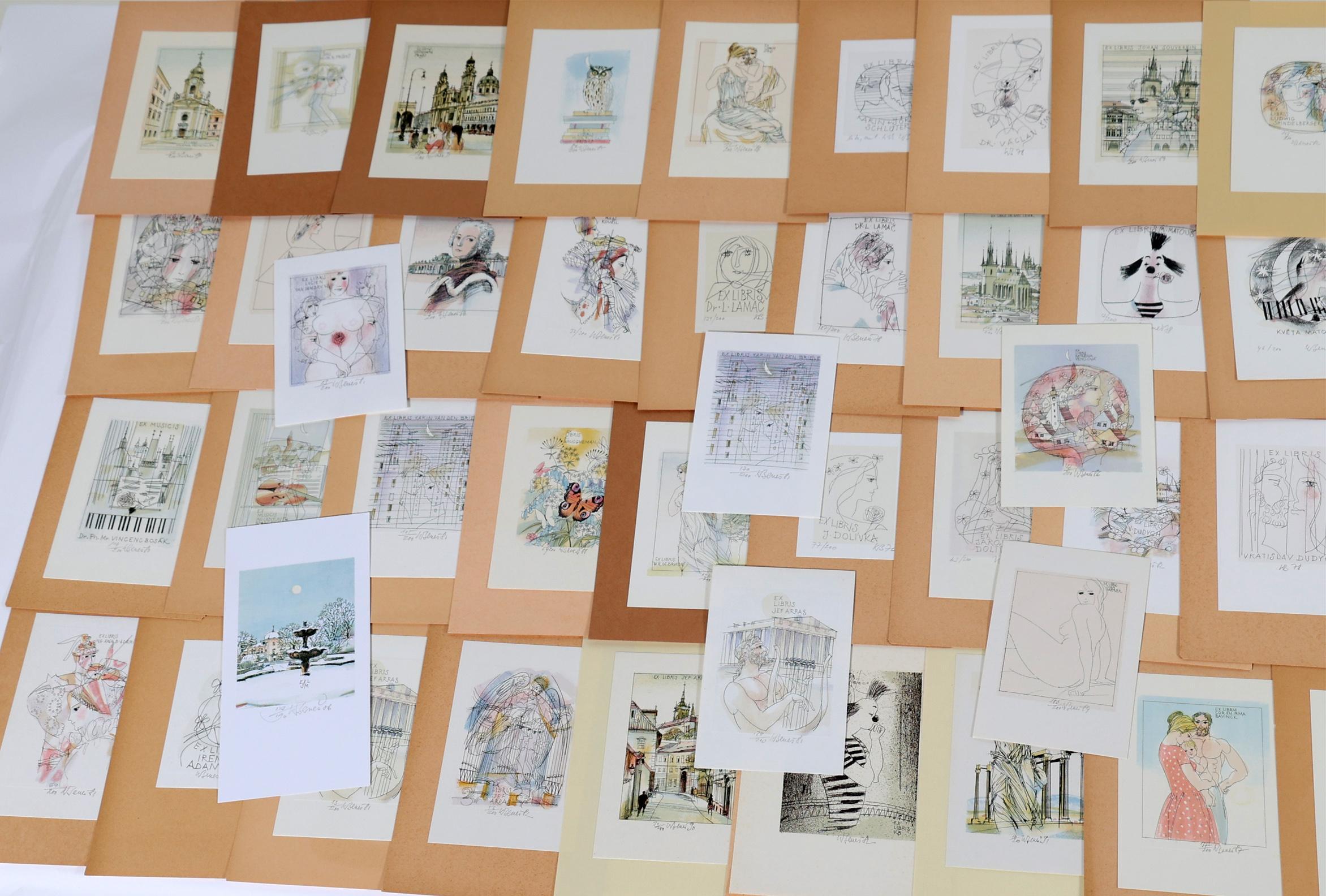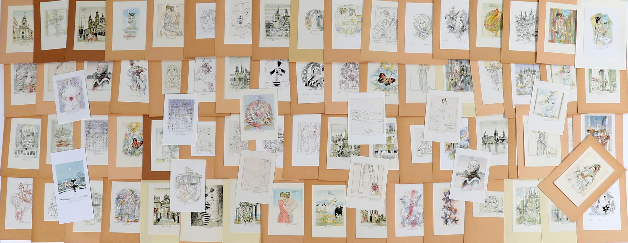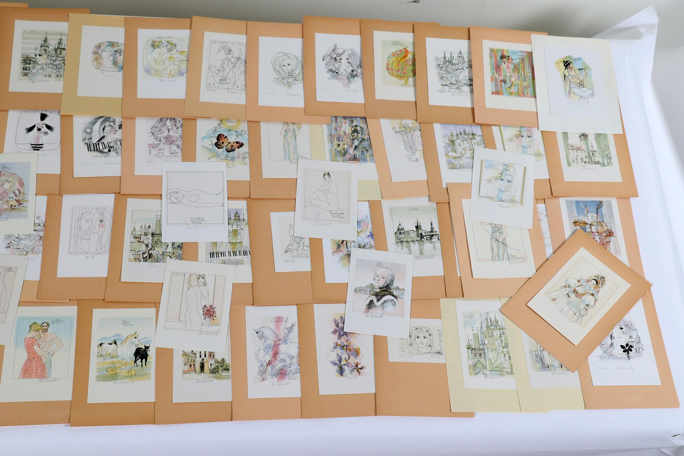 Benes, K., plm. 80 exlibris, litho (vaak in kleur), alle gesigneerd, opgeplakt. Diverse thema's.